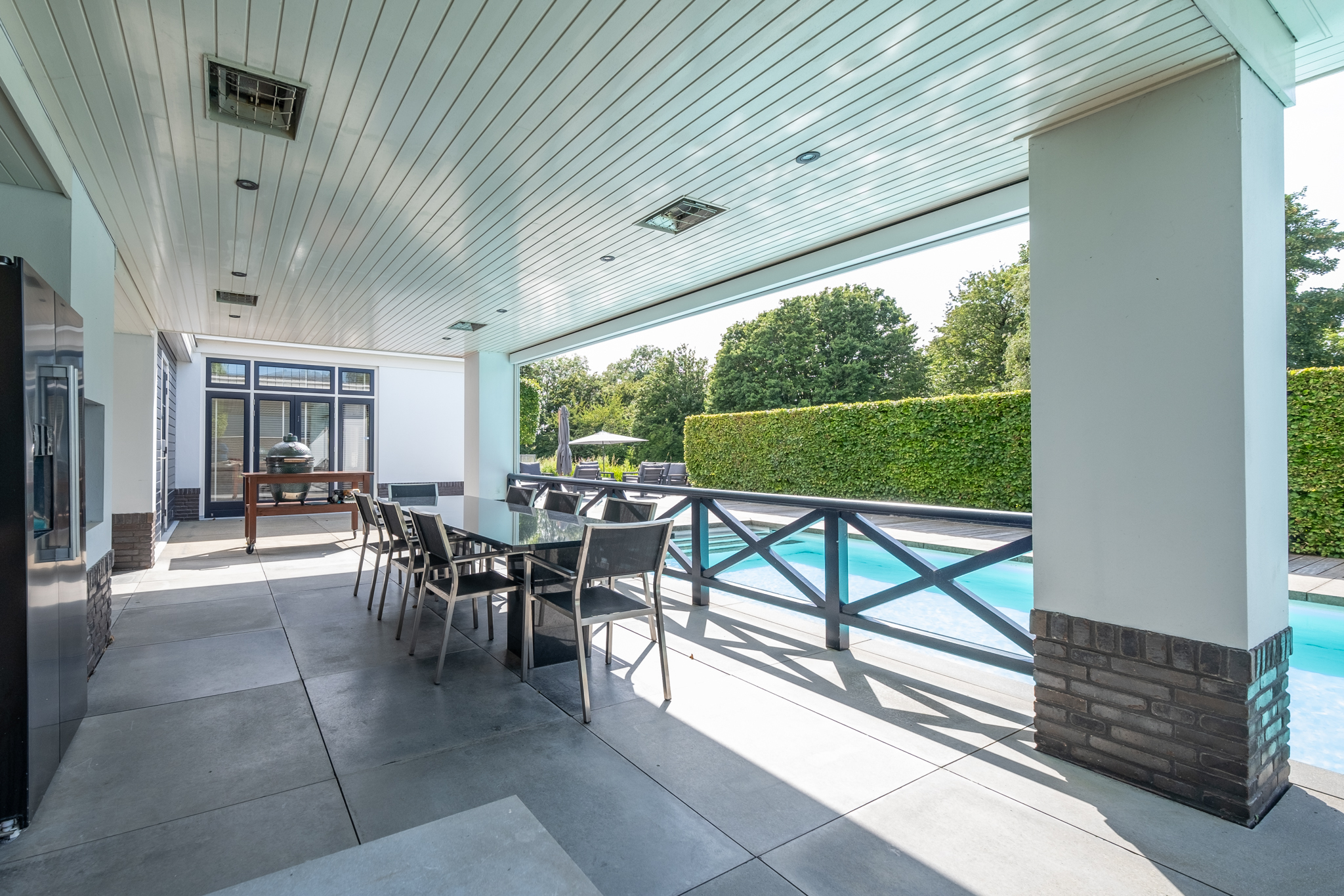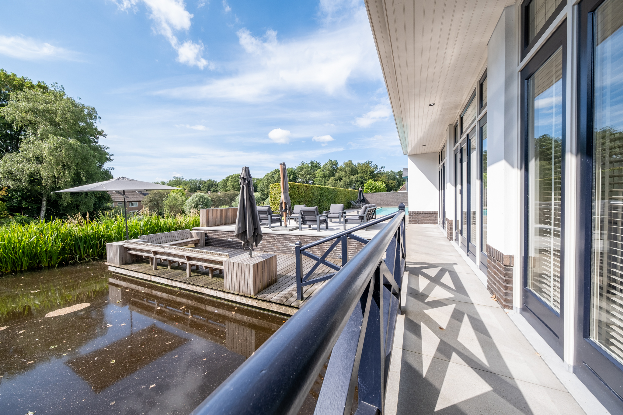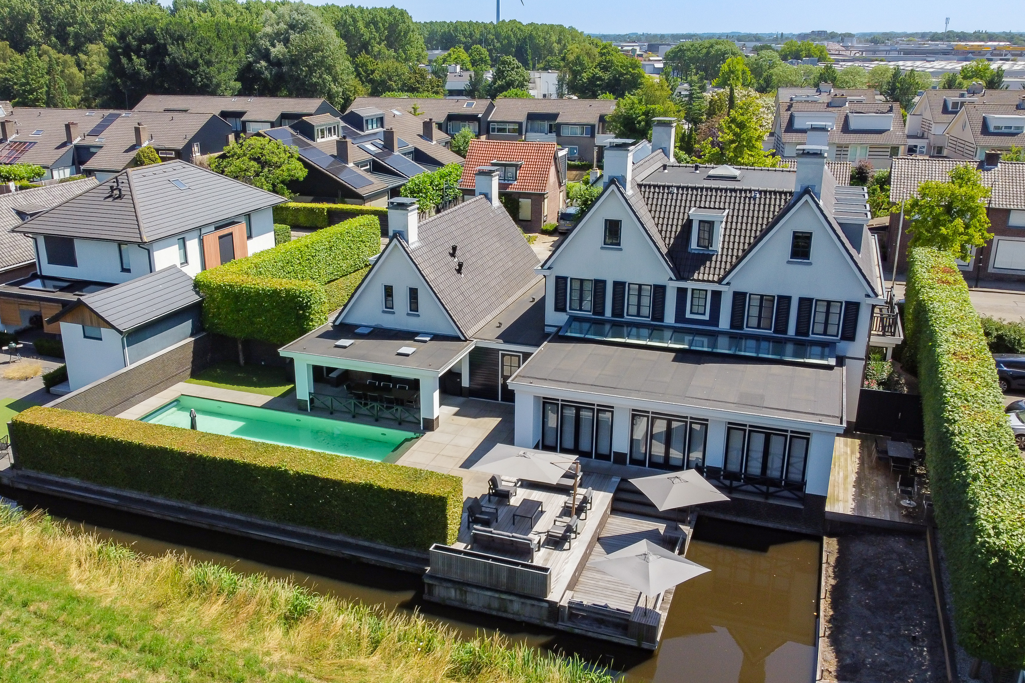De villa is volledig omgeven door een groene, omheinde tuin wat maximale privacy waarborgt. Je beschikt over een royale veranda, parkeerruimte voor meerdere auto’s, een dubbele inpandige garage én een verwarmd buitenzwembad. De achtertuin grenst aan water en heeft vrij uitzicht over een groene dijk waardoor je hier volop privacy geniet. Hier wordt buitenleven een vanzelfsprekendheid.