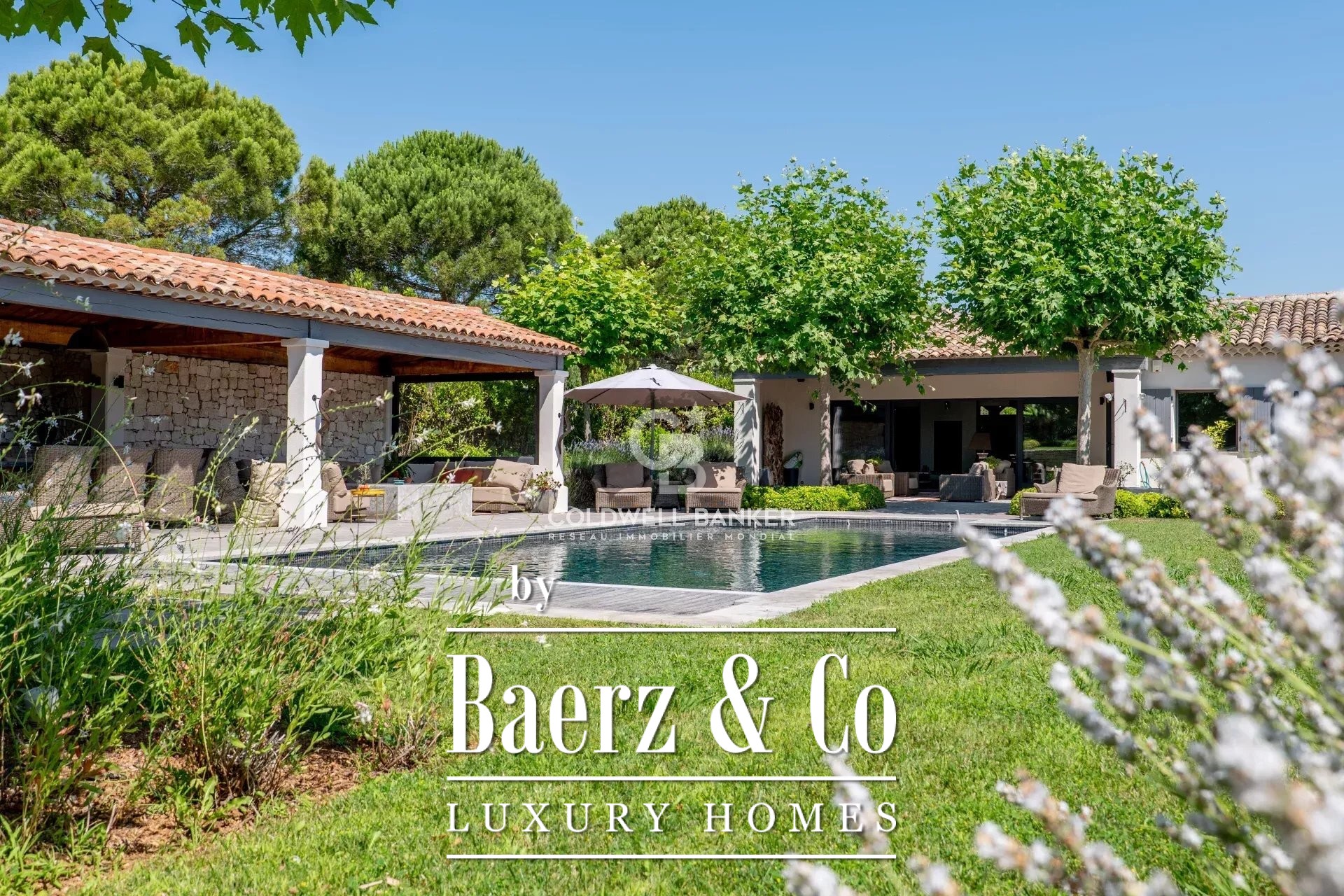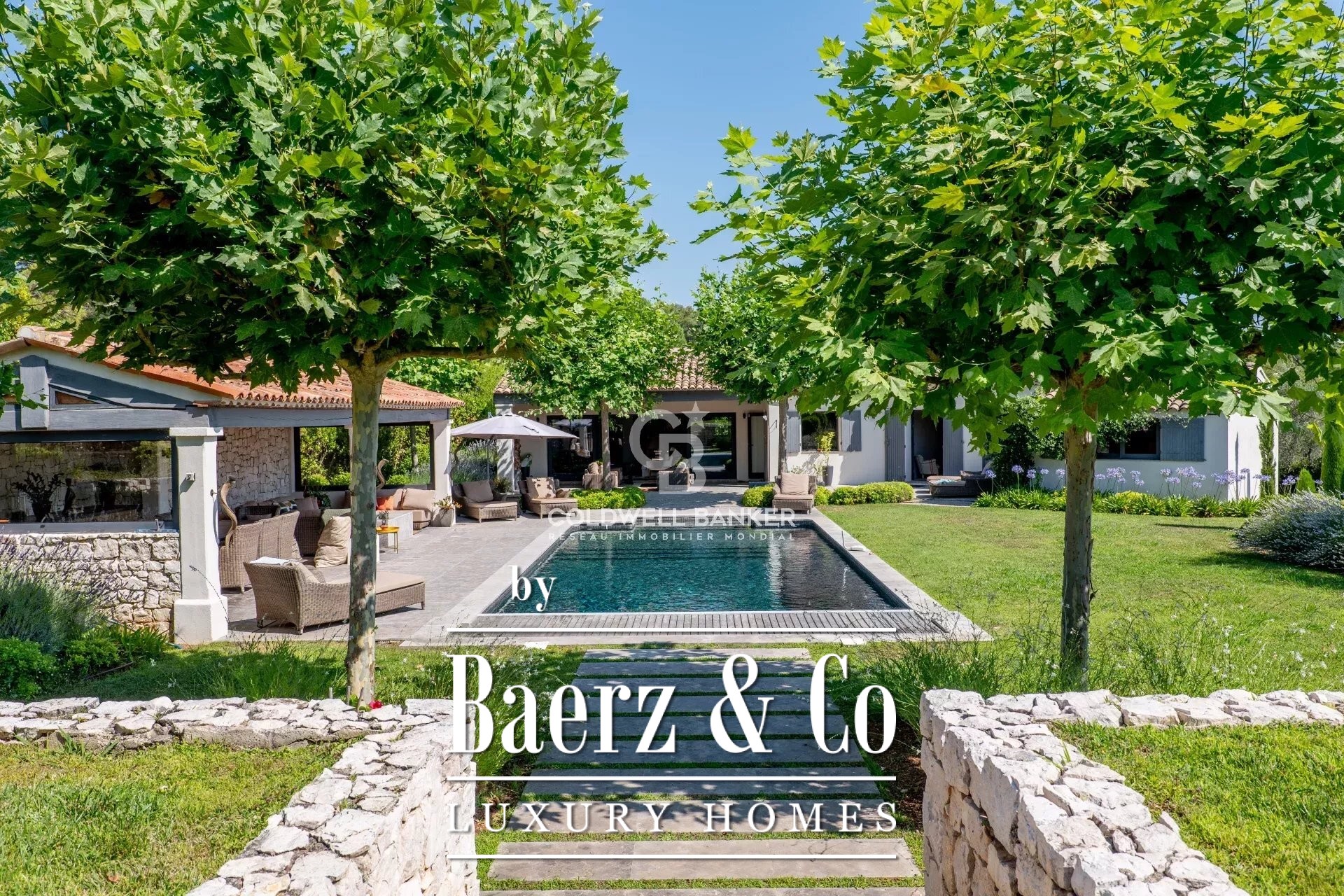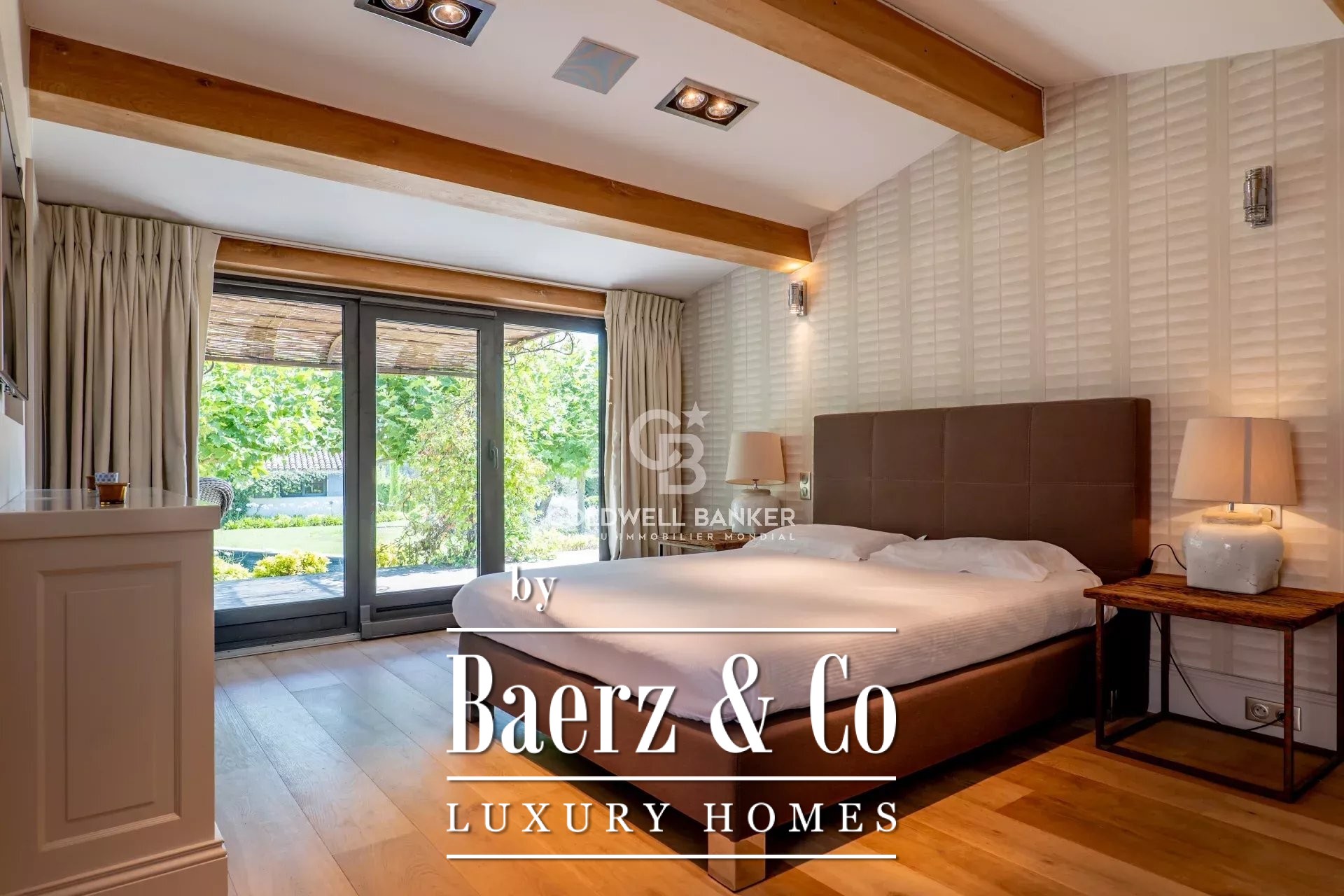 Villa Mougins biedt een stijlvolle uitvalsbasis in een rustige woonwijk, op enkele minuten van het karakteristieke dorpscentrum en vooraanstaande internationale scholen. Deze woning van 340 m² draait om een hoofdverblijf waar ingetogen ontwerp en comfort samenkomen in een royale entree, woonkamer met open haard, eetkamer en volledig uitgeruste keuken. De mastersuite beschikt over een slaapkamer, badkamer en kleedruimte; twee extra suites vervolledigen de privévleugel op de begane grond.