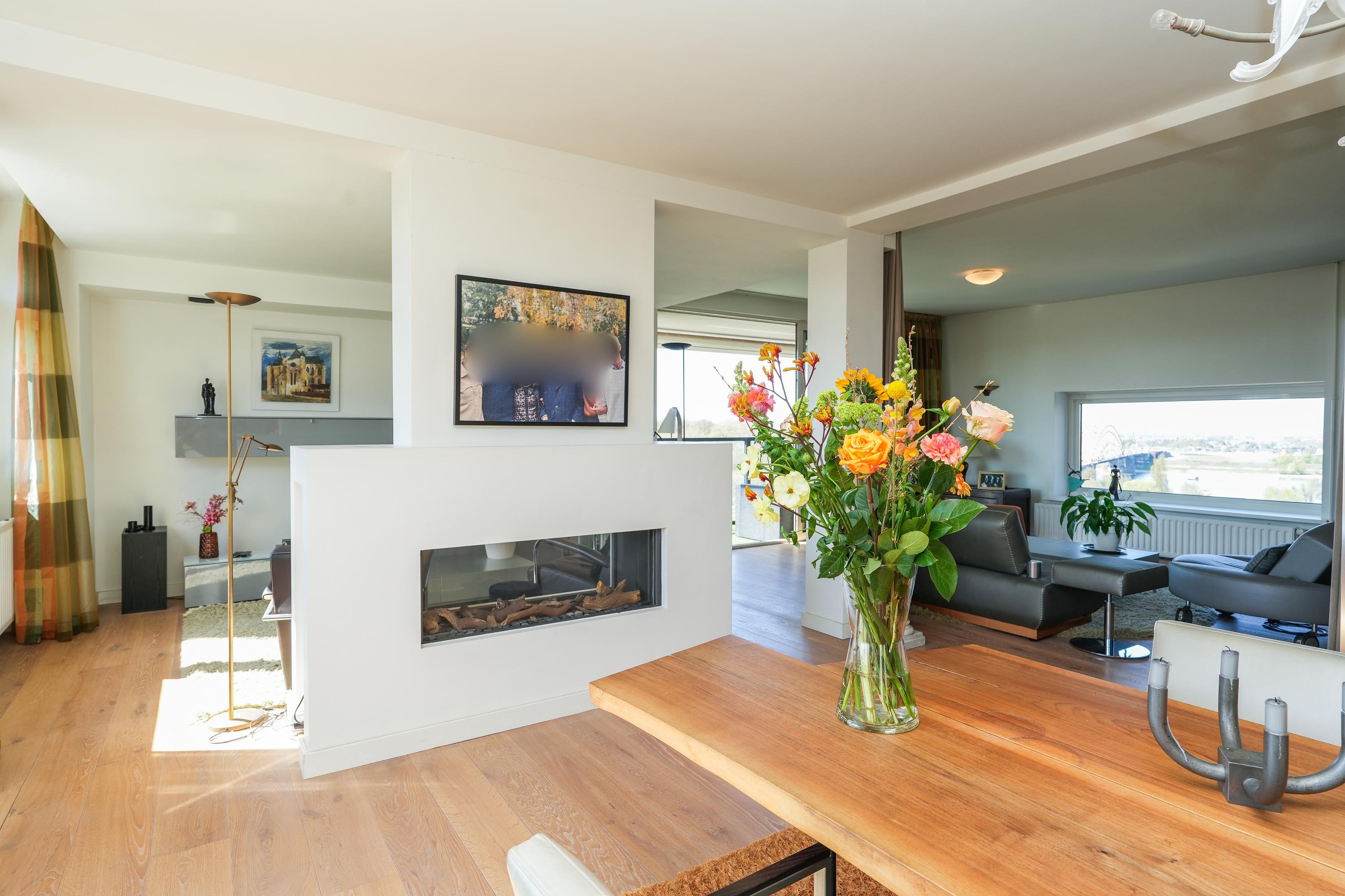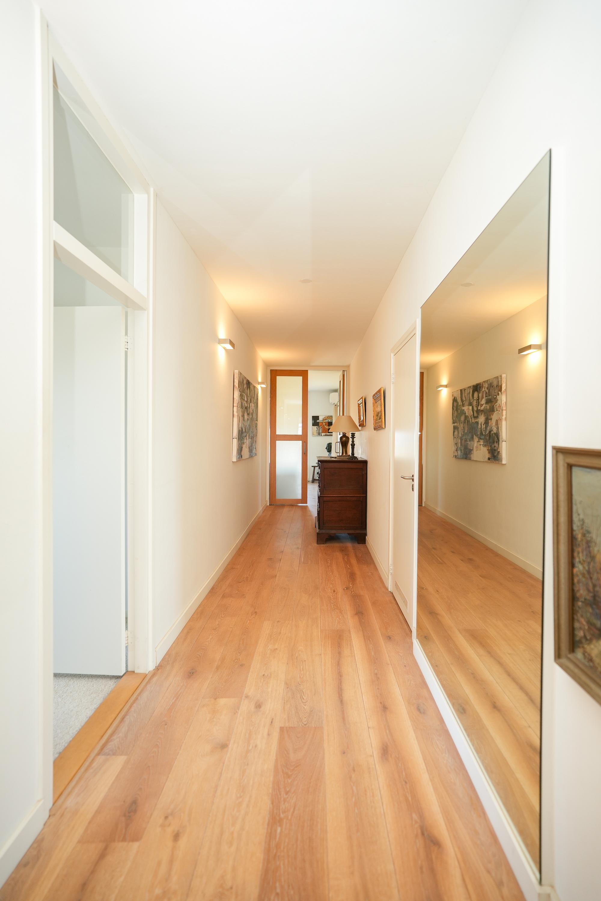 Entree appartement met een beveiligde toegangsdeur. Het appartement is zeer licht door rondom ramen. Het beschikt over een lange, brede hal die als centrale verbinding dient. Bij binnenkomst bevinden zich de garderobe, het gastentoilet, een wasruimte en de open keuken. De keuken en woonkamer zijn beide direct bereikbaar vanuit de hal, wat zorgt voor een loftachtige sfeer en mooie, logische doorloop. De keuken is voorzien van diverse inbouwapparatuur en biedt toegang tot het eerste balkon welke op het zuiden gericht is. Aangrenzend aan de keuken bevindt zich een inpandige bijkeuken met extra opberg- en werkruimte. Vanaf de woonkamer en het balkon is er een prachtig uitzicht over de stad Nijmegen en de Radboud Universiteit. Een gashaard zorgt voor een scheiding tussen de eetkamer en de televisiehoek aan de zuidwest kant. Het westelijk gelegen balkon biedt een fraai uitzicht richting de Waal en de iconische Waalbrug.