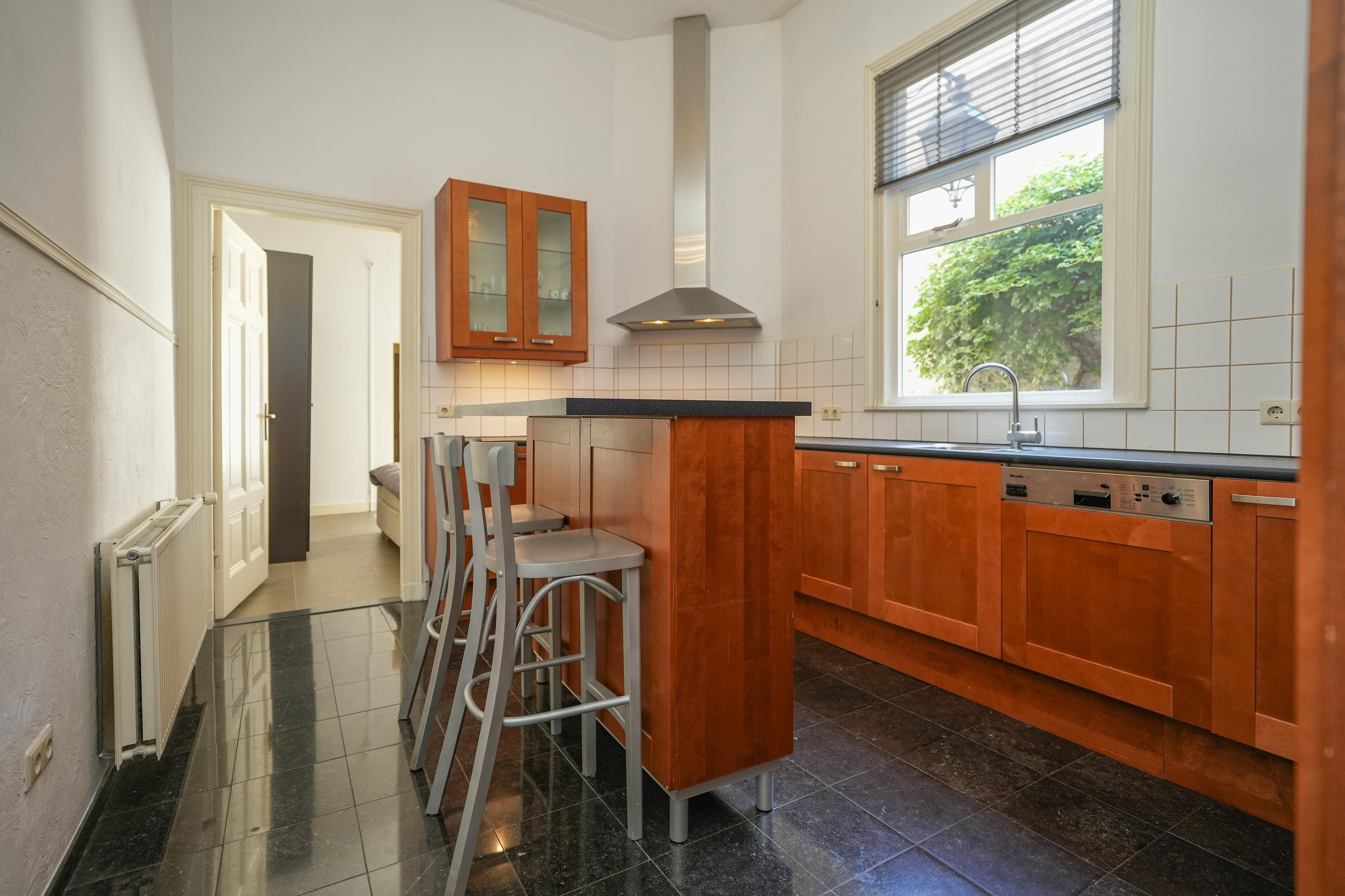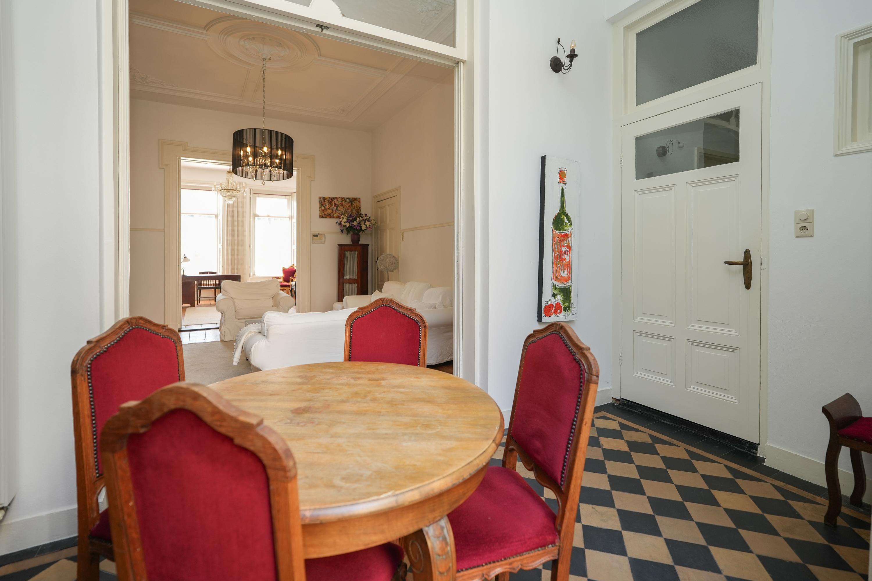 Statige hal/entree met meterkast en prachtig authentiek trappenhuis met marmeren vloeren, woonkamer en suite en eetkamer met schuifpui. In de kamer aan de voorzijde zijn de originele vensterbanken nog aanwezig, hier kan je lekker van de ochtendzon genieten. Via een tussenhal zijn het toilet, keuken en slaapkamer met badkamer bereikbaar. De sfeervolle binnentuin is toegankelijk zowel vanuit de eetkamer als de slaapkamer. De ruime keuken heeft een U-opstelling met inbouwapparatuur en een barretje.