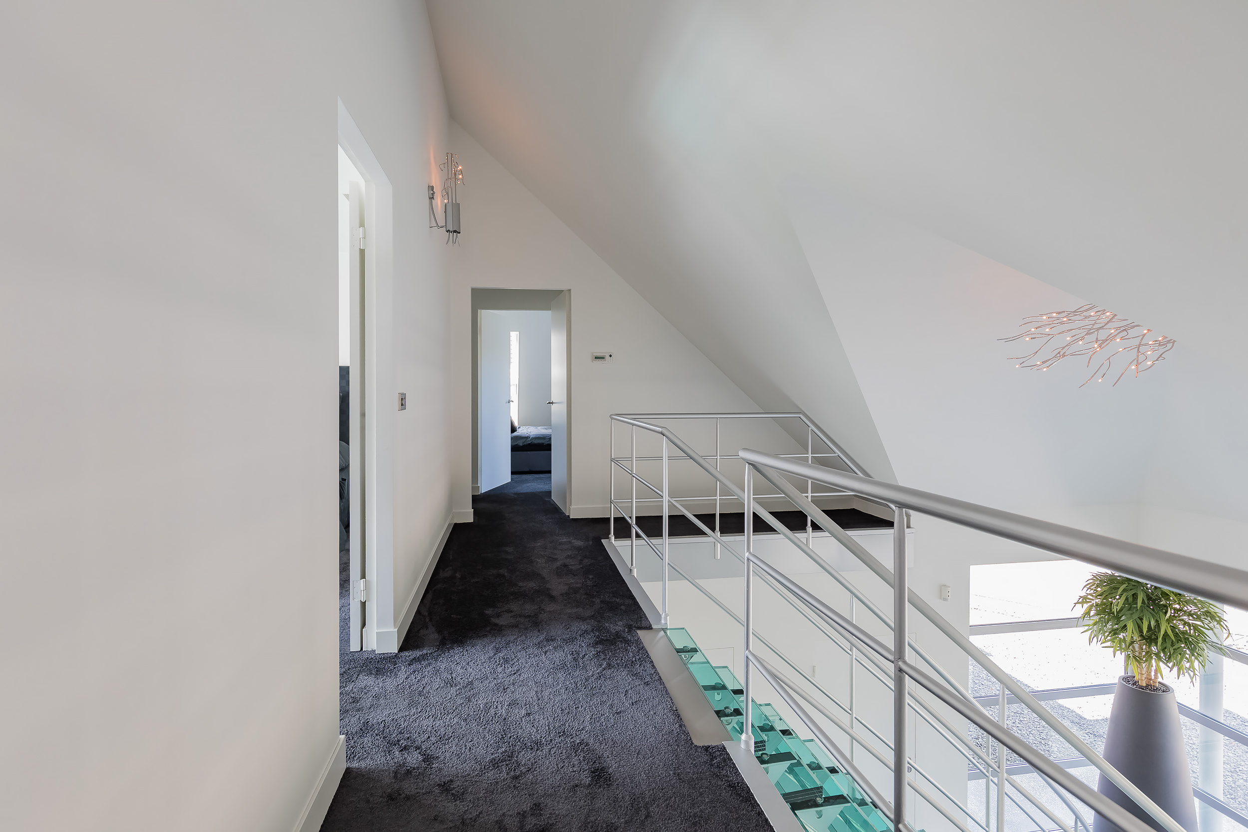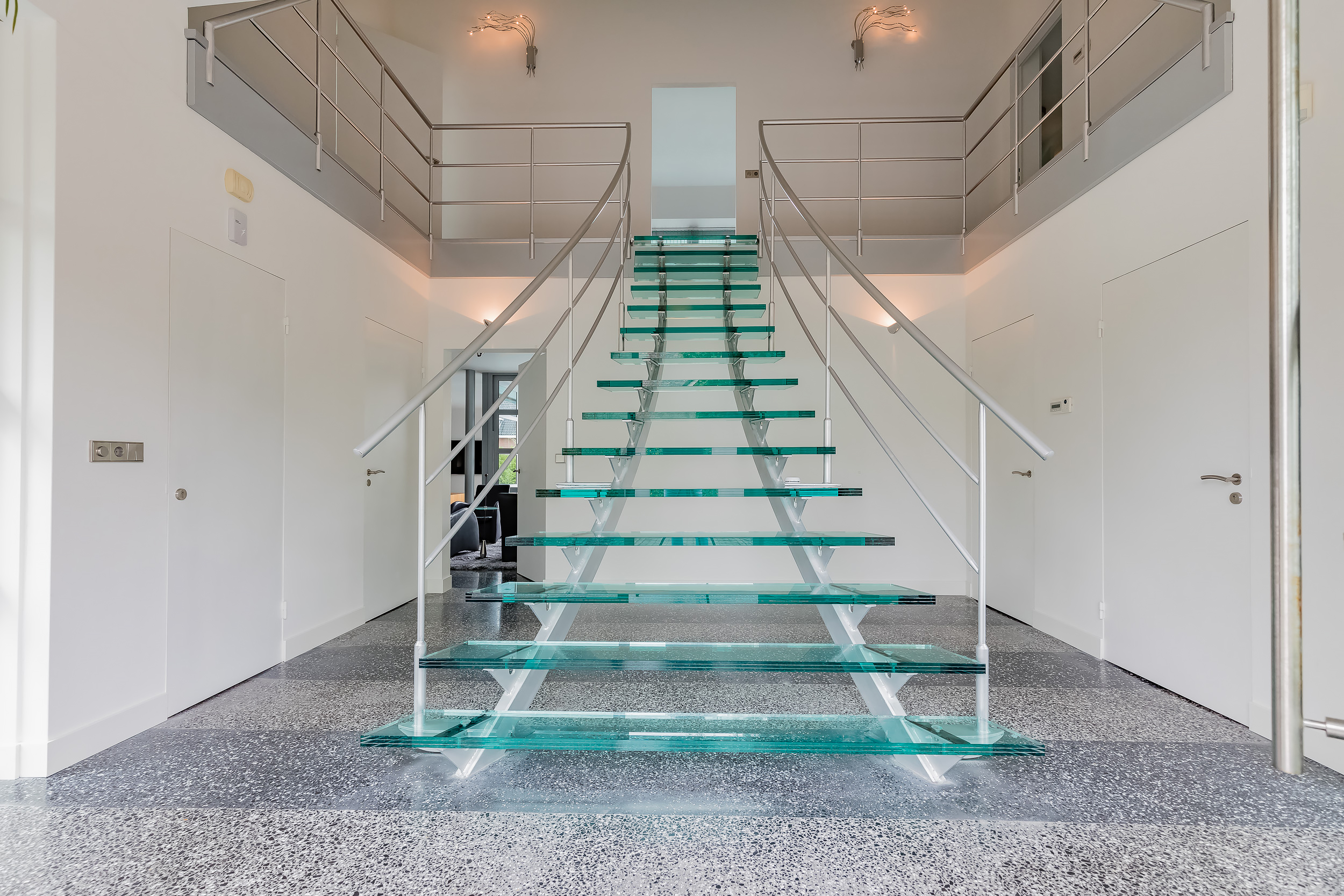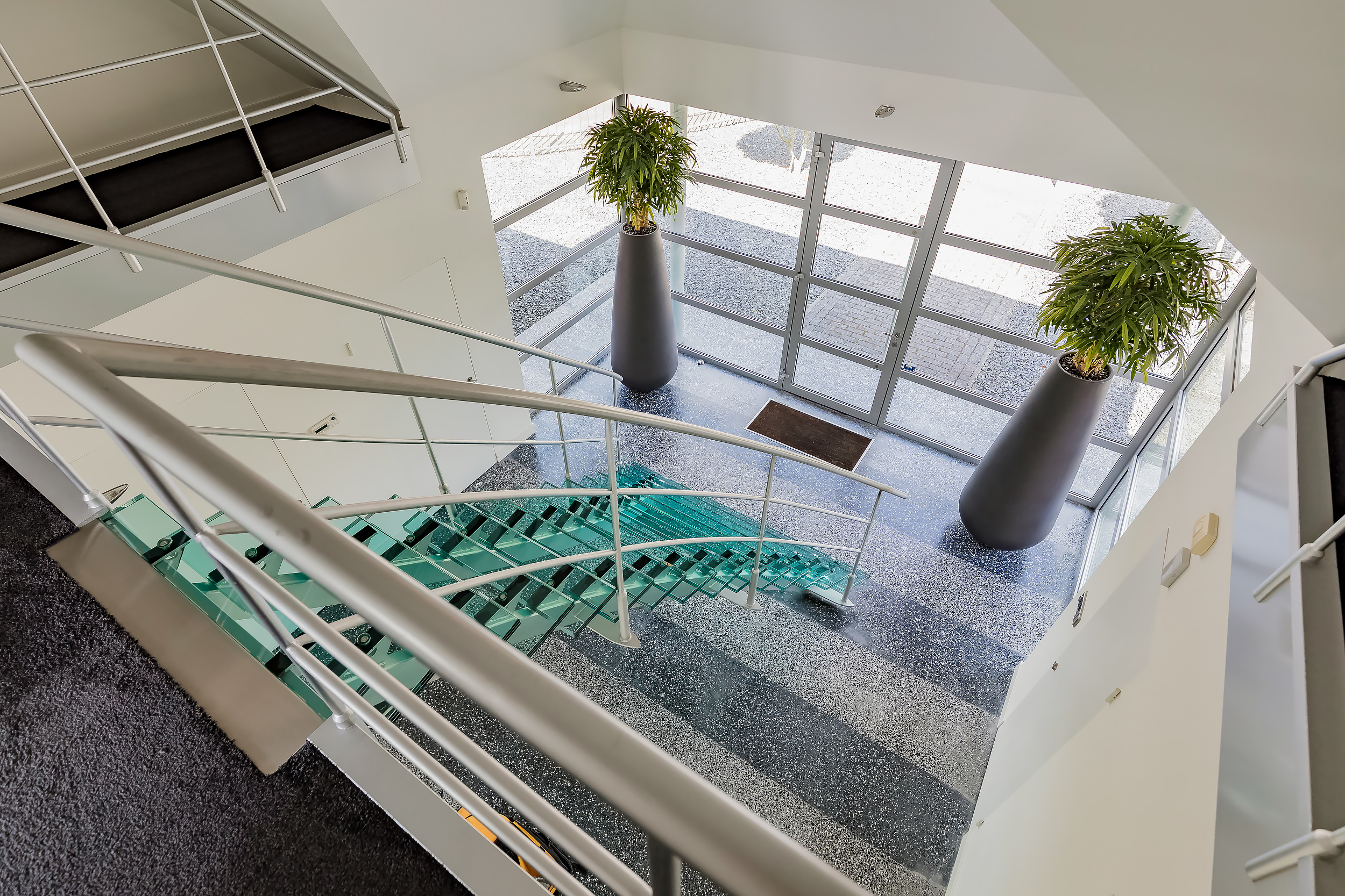 Grote lichte hal met vide en de indrukwekkende glazen trap naar boven. De hal is voorzien van getint glas waardoor er geen zicht van buiten naar binnen is.