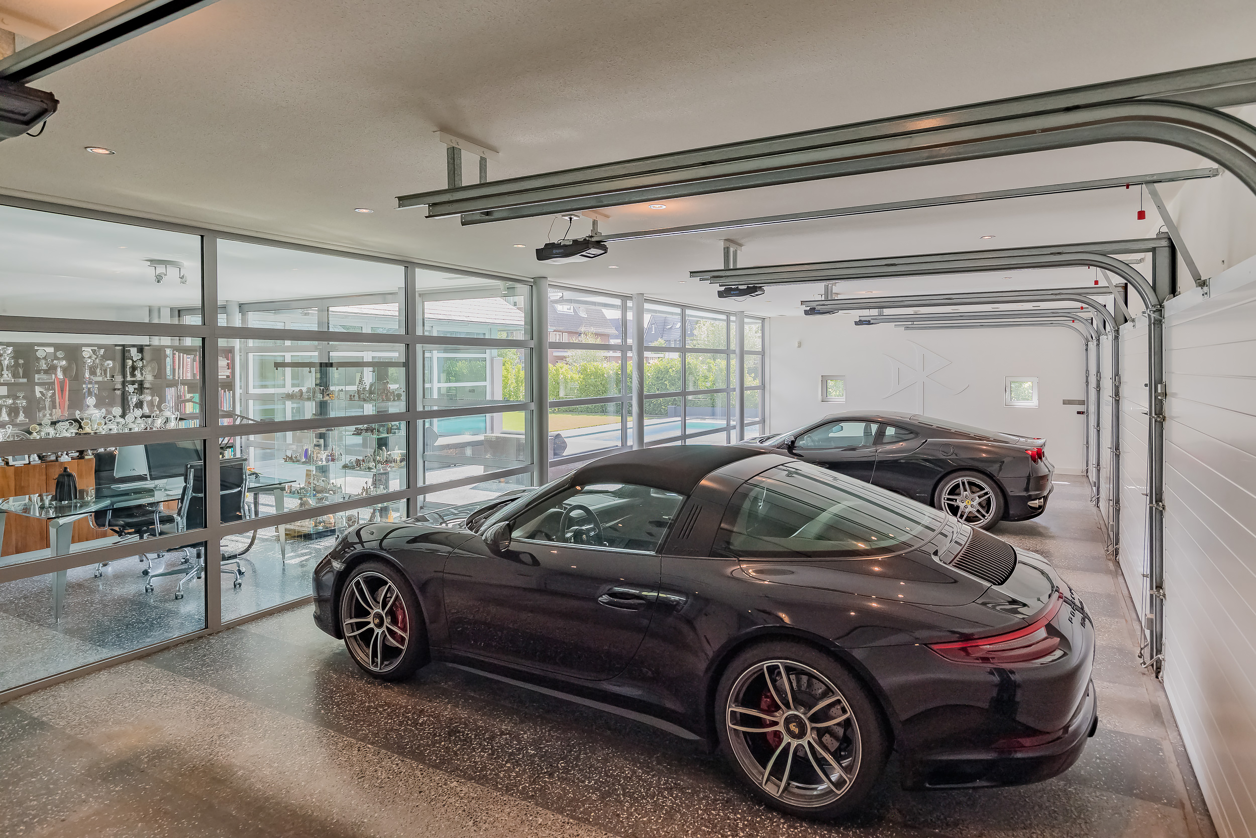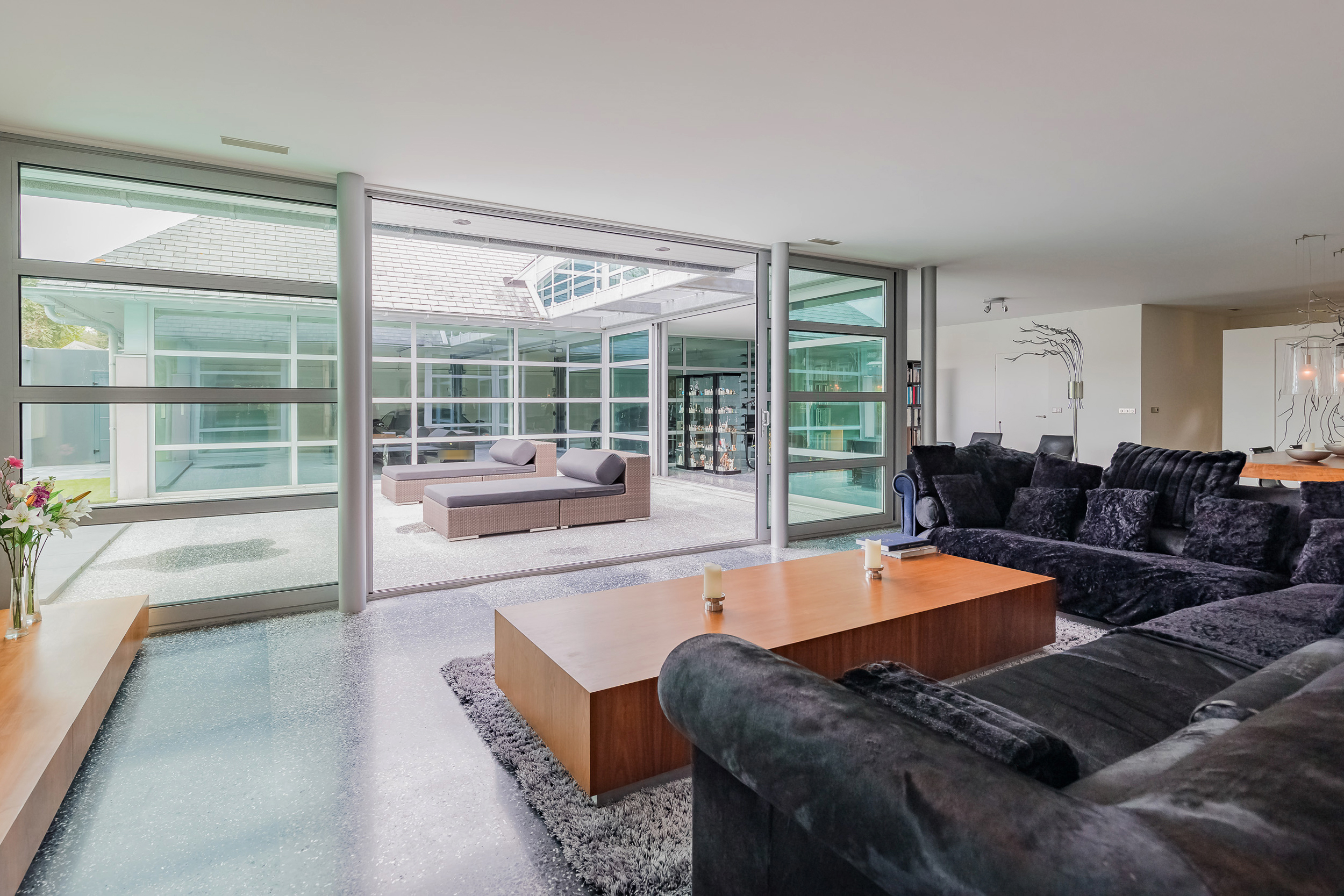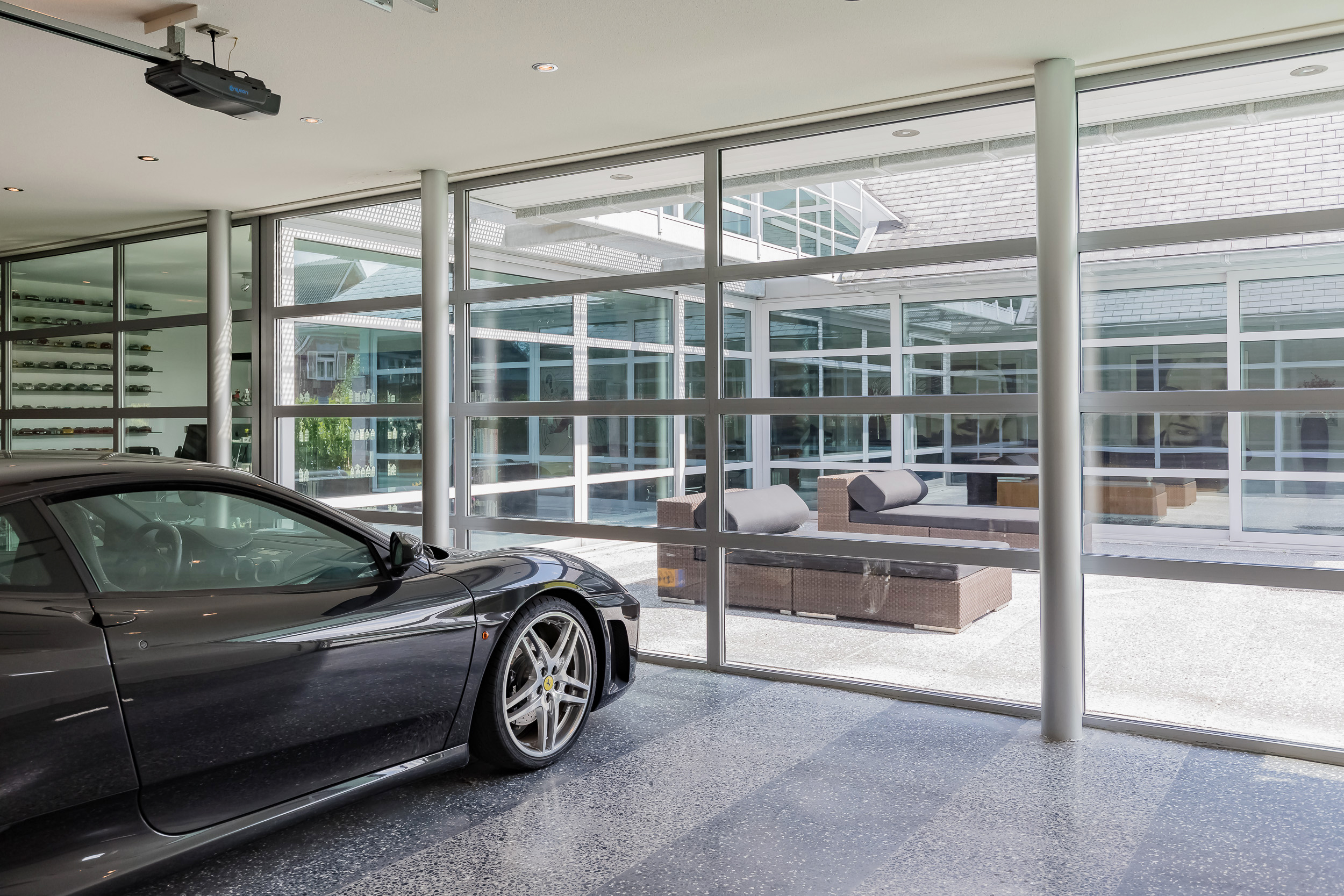 De inpandige garage van 76 m² is volledig geïsoleerd en ook hier is de terrazzo vloer voorzien van vloerverwarming. De glazen binnenwand is eenvoudig te verwijderen zodat de gehele begane grond één ruimte wordt. Het woonoppervlak komt hiermee op 356m² (€ 7.008,43 m²)