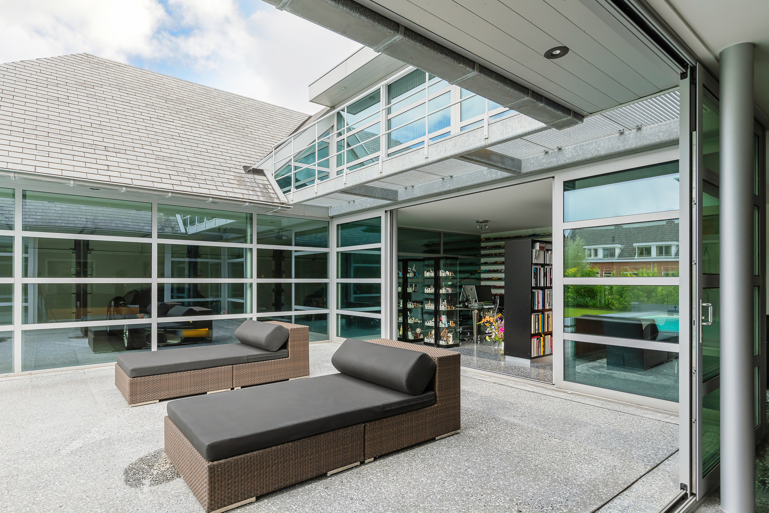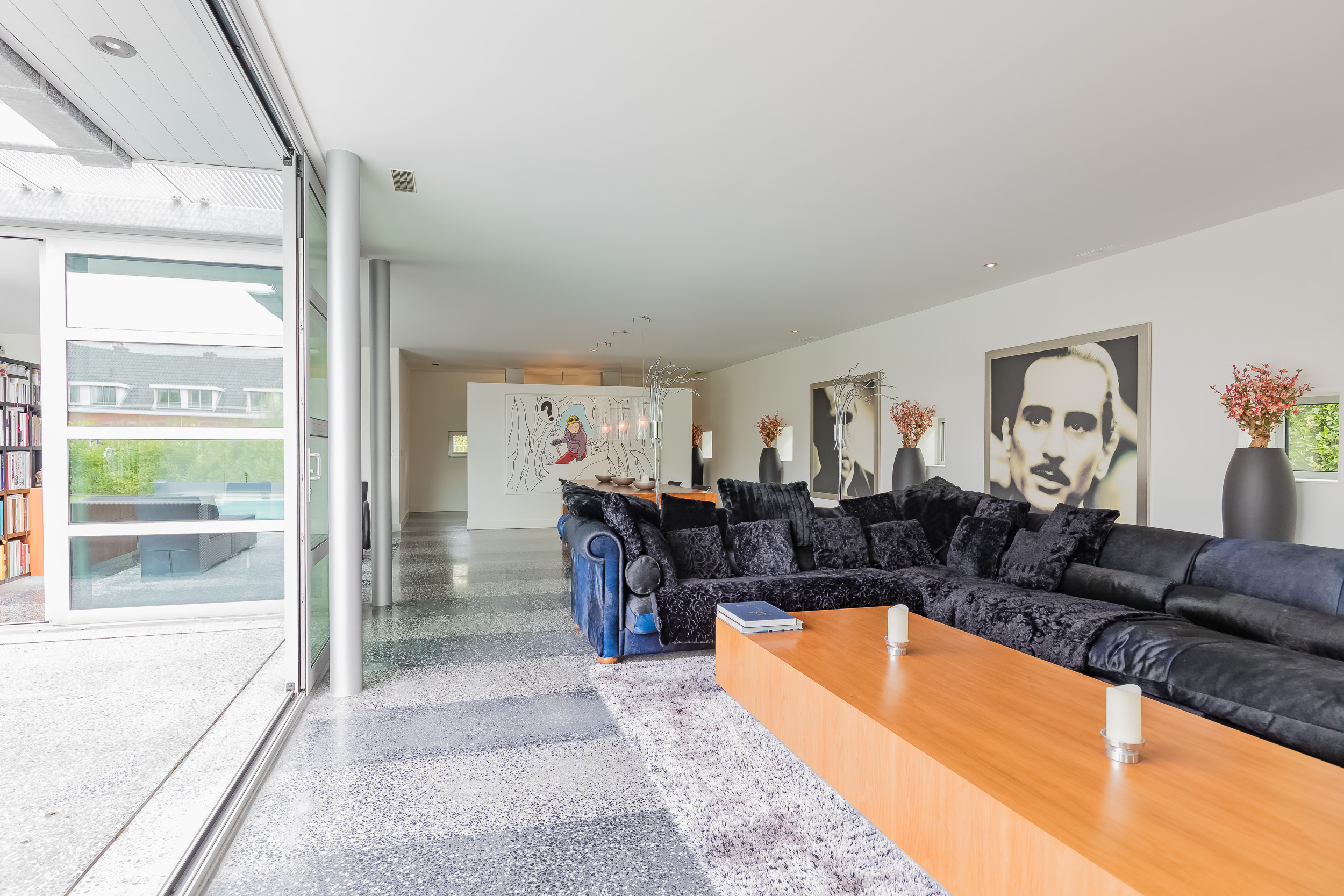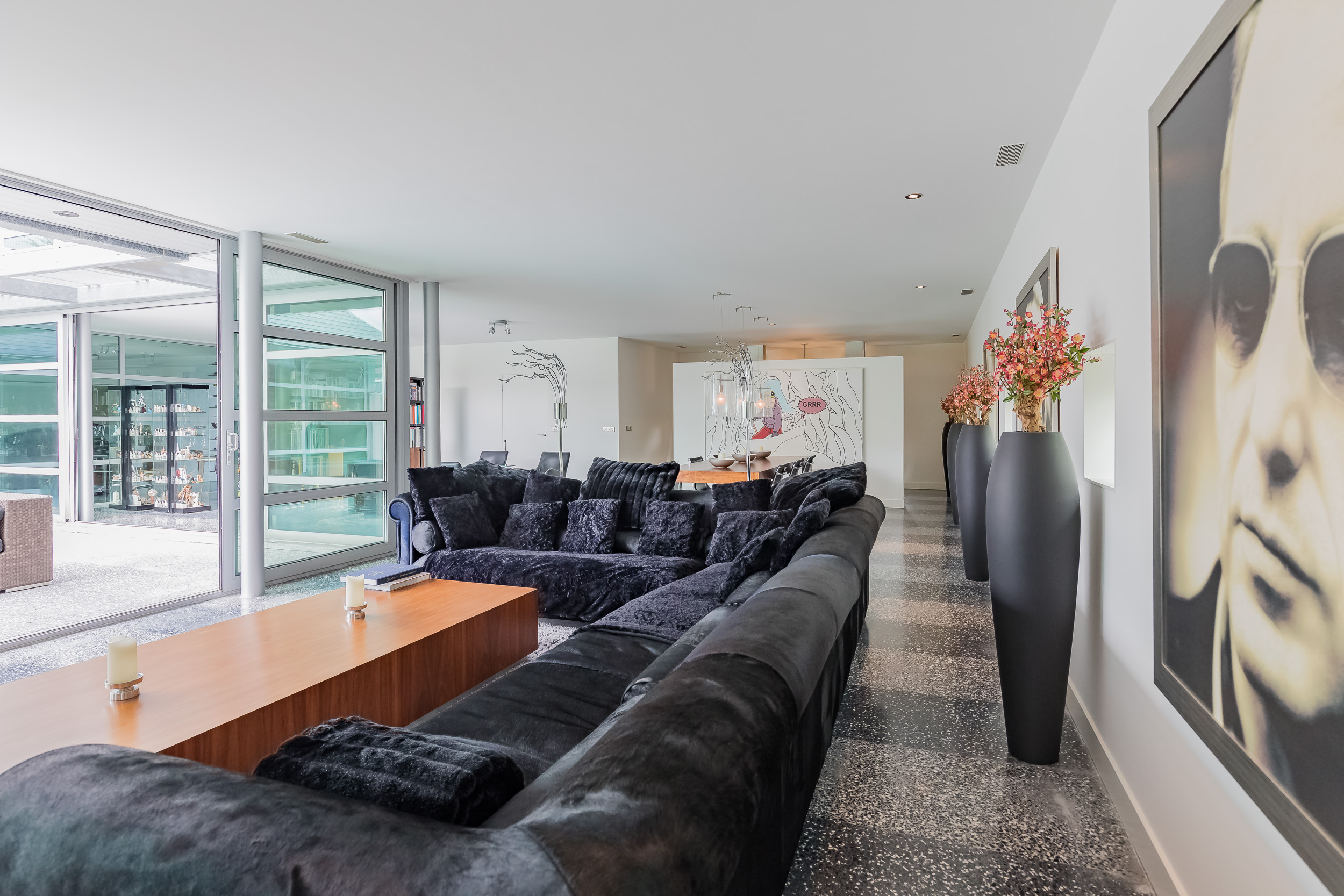 De inpandige garage van 76 m² is volledig geïsoleerd en ook hier is de terrazzo vloer voorzien van vloerverwarming. De glazen binnenwand is eenvoudig te verwijderen zodat de gehele begane grond één ruimte wordt. Het woonoppervlak komt hiermee op 356m² (€ 7.008,43 m²)
