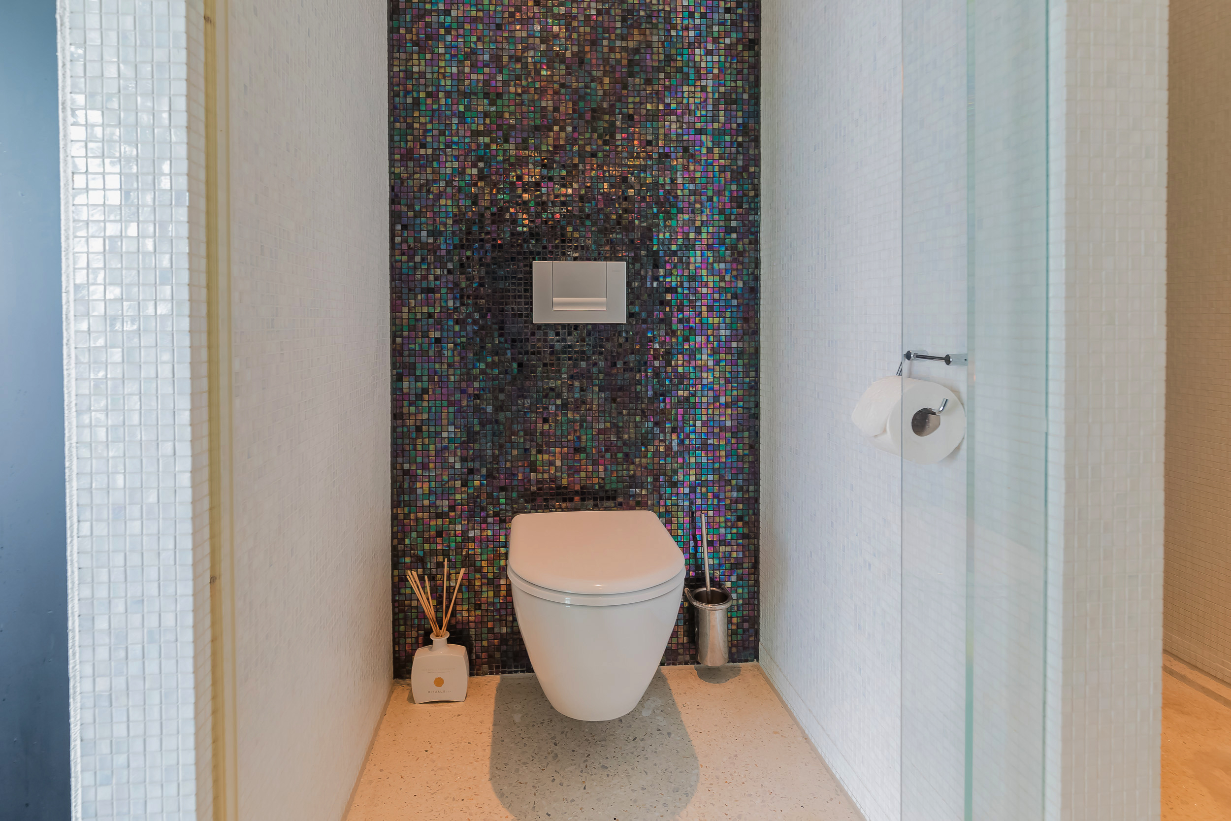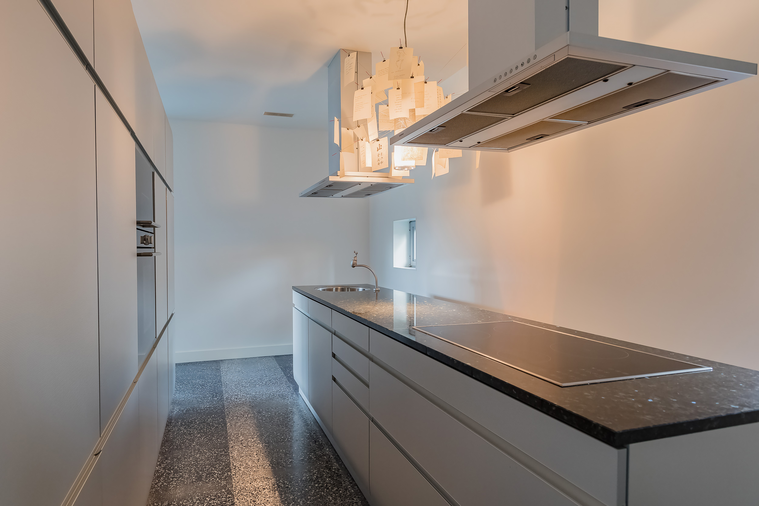 De gehele begane grond is voorzien van een terrazzovloer met vloerverwarming. Om de binnen/buiten beleving te versterken geven grote schuifpuien toegang tot de tuin en is de Terrazzovloer naar buiten doorgetrokken.