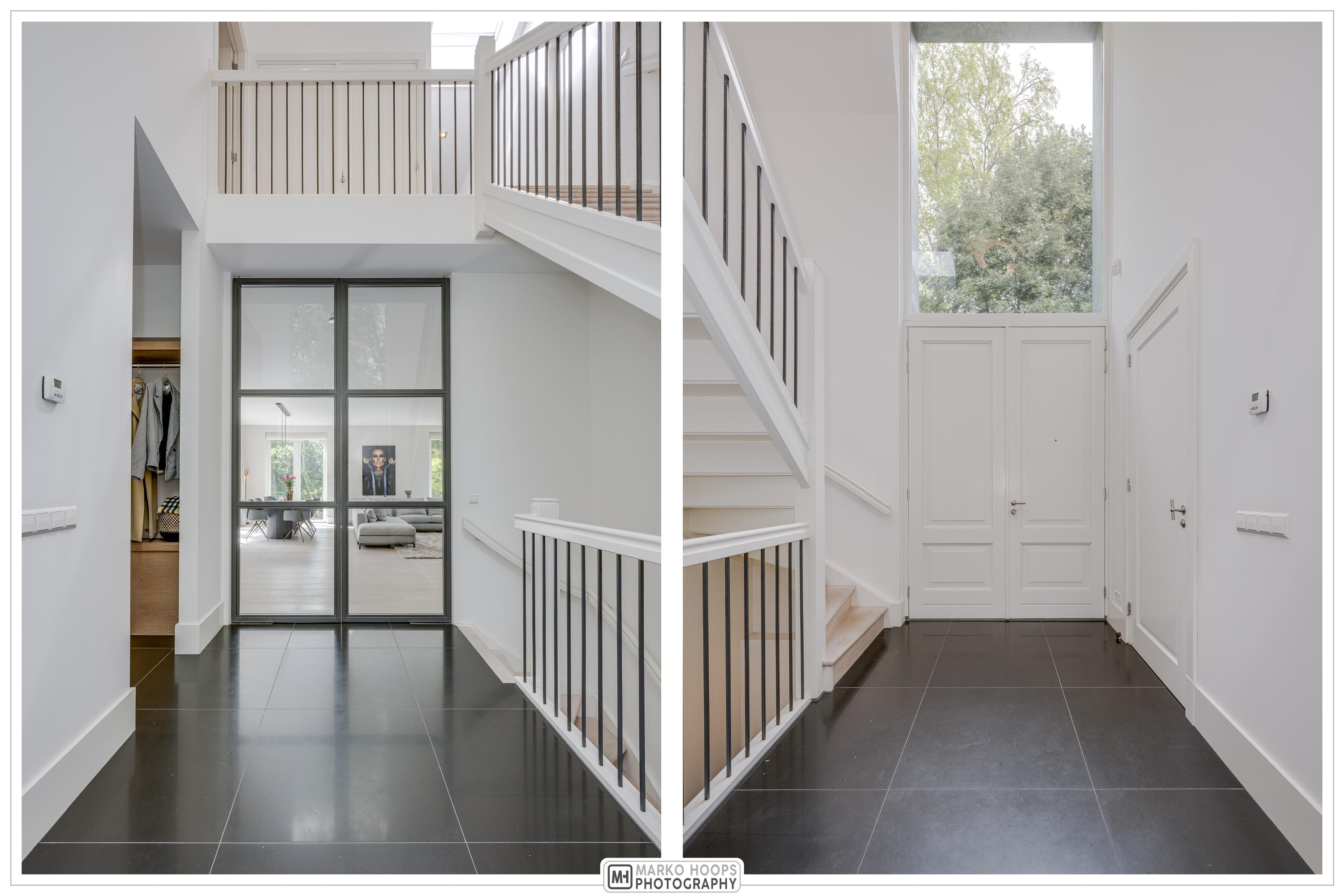 Het bordes met dubbele entreedeur geeft toegang tot de ruime hal waarin centraal het trappenhuis en vide zijn gesitueerd. In de hal vindt u tevens de wc voor de gasten, een ruime garderobe en de meterkast. Ook bevindt zich hier de trap die leidt naar de kelder en de bordestrap naar de bovengelegen verdieping. De dubbele glazen deuren bieden een doorkijk naar de moderne woonkamer.
