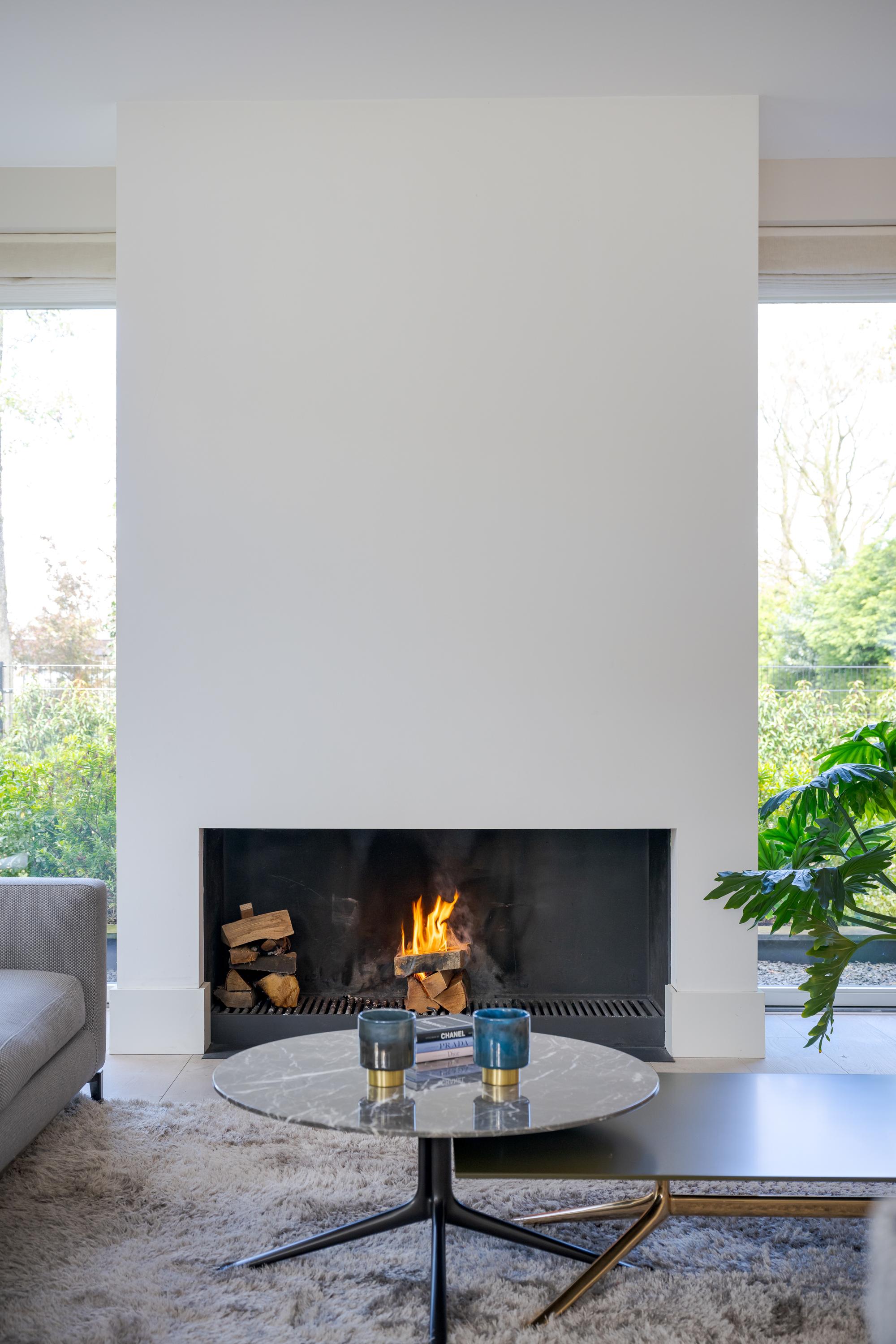 De woonkamer heeft een lichte eiken vloer met een moderne open haard (hout gestookt), hoge ramen en dubbele openslaande deuren naar het terras, waardoor er op elk moment van de dag licht binnenvalt vanuit alle kanten en zicht is op de omliggende tuin. De keuken en de studeerkamer kunnen door moderne schuifdeuren gescheiden worden van de woonkamer, maar geopend vormen deze ruimtes één geheel. De vloer in keuken en werkkamer zijn van hardsteen, welke samen met de elementen van eikenhout en kleuren een fraai effect geven. De werkkamer/bibliotheek is ruim en heeft een ingebouwde boekenwand in L-vorm.