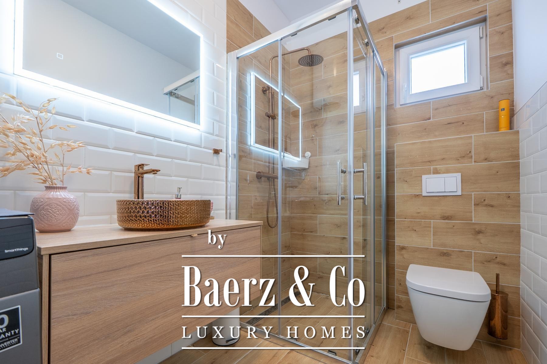 De begane grond bestaat uit een open woon-, eet- en keukengedeelte, drie slaapkamers, een badkamer, een gastentoilet en een royaal terras dat zich uitstekend leent voor buiten dineren. Het appartement op de eerste verdieping is 50 m² groot en beschikt over twee slaapkamers, een badkamer en een moderne keuken met toegang tot een overdekt terras met uitzicht op zee en Ošljak. De derde woning, een maisonette van 118 m², bevindt zich in hoogwaardige casco staat. De hoofdverdieping opent naar een balkon met zeezicht en het dakterras biedt panoramische uitzichten over het water, Ošljak en de stad Zadar.