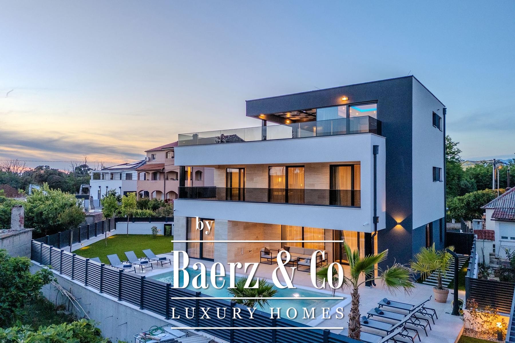 Villa Privlaka in Kroatië is een modern architectonisch statement in een rustige, exclusieve enclave nabij de Adriatische Zee. Deze villa biedt een totale woonoppervlakte van 412,80 m² inclusief terrassen, gesitueerd op een perceel van 591 m², waarbij open leefruimten vloeiend overlopen in het buitenleven. De hoofdwoonkamer van 52,66 m² sluit aan op een overdekt terras van 28,95 m² en geeft direct toegang tot het privézwembad van 36 m², wat een sociaal hart vormt voor ontspannen samenzijn of een vredige retraite. Alle vier slaapkamers beschikken over een eigen en-suite badkamer, doordacht verdeeld over de begane grond en eerste verdieping voor optimale privacy en comfort. De bovenverdieping is ingericht als flexibele wellnessruimte van 23,60 m² met twee royale terrassen, ideaal voor rustige contemplatie onder de mediterrane hemel.
