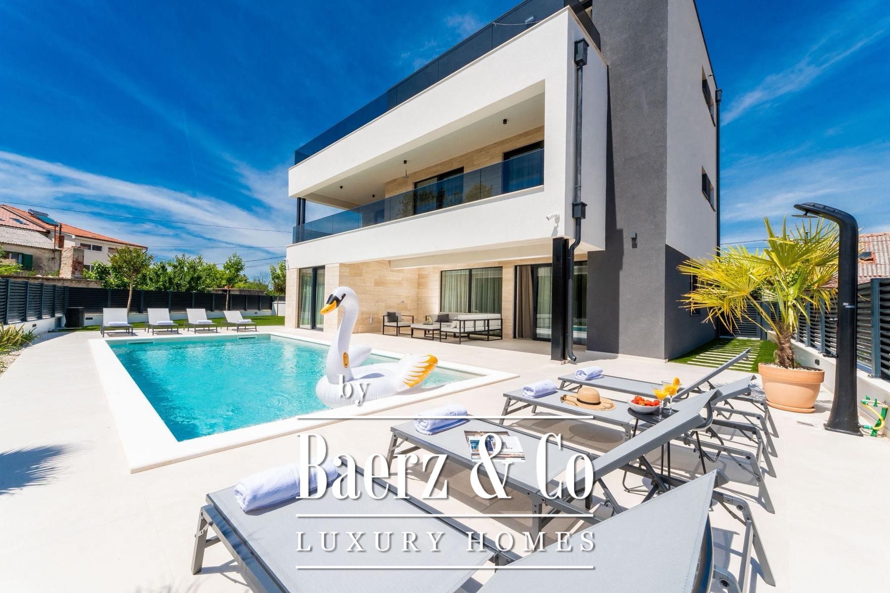 Overdekte en open terrassen vergroten de leefruimte, waar zon en schaduw harmonieus samenkomen. De fraai aangelegde tuin en zonneweide geven privacy, terwijl beveiligde parkeergelegenheid met cameratoezicht extra zekerheid biedt. Op slechts enkele passen van uitstekend onderhouden stranden combineert deze villa te koop in Privlaka architectonische elegantie met mediterrane ontspanning, geschikt als discrete gezinswoning of luxe vakantiewoning. Elk architectonisch detail staat garant voor functionaliteit en duurzame kwaliteit en creëert een sfeer van rust, comfort en licht.