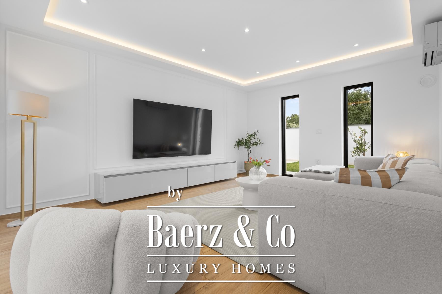 Buiten wacht een verwarmd zwembad van 32 m² met zoutwatersysteem, een fraai aangelegd zonneterras en een taverne van 25 m² met open haard; een privé domein voor rust of ingetogen samenzijn. Extra comfort wordt geboden door een garage van 35 m², drie extra parkeerplaatsen, videobewaking en alarmsysteem. Technische verfijning blijkt uit vloerverwarming, volledige airconditioning en maatwerk meubilair. Deze luxe villa te koop in Pula verenigt hedendaags design en werkelijk comfort in een serene setting.