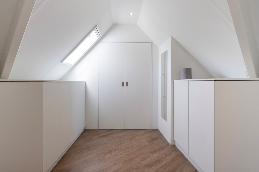 De overloop geeft toegang tot drie slaapkamers en een badkamer. De royale masterbedroom beschikt over een eigen en suite badkamer en is uitgerust met airconditioning voor extra comfort. De dubbele openslaande deuren van de slaapkamer geven u toegang tot een balkon, waar u een prachtig weids uitzicht heeft op de groene tuin. Grenzend aan de slaapkamer komt u in een ruime kastenkamer met daglicht. De tweede en derde slaapkamer liggen aan de voorzijde van het huis en beschikken beide over een ruime inbouwkast, ruimte voor een groot bed en een bureau, een openslaande deur naar het balkon aan de voorzijde en airconditioning. De schuine wanden, hoge nokken en zichtbare houten balken geven de hele verdieping een sfeervolle, karakteristieke uitstraling.