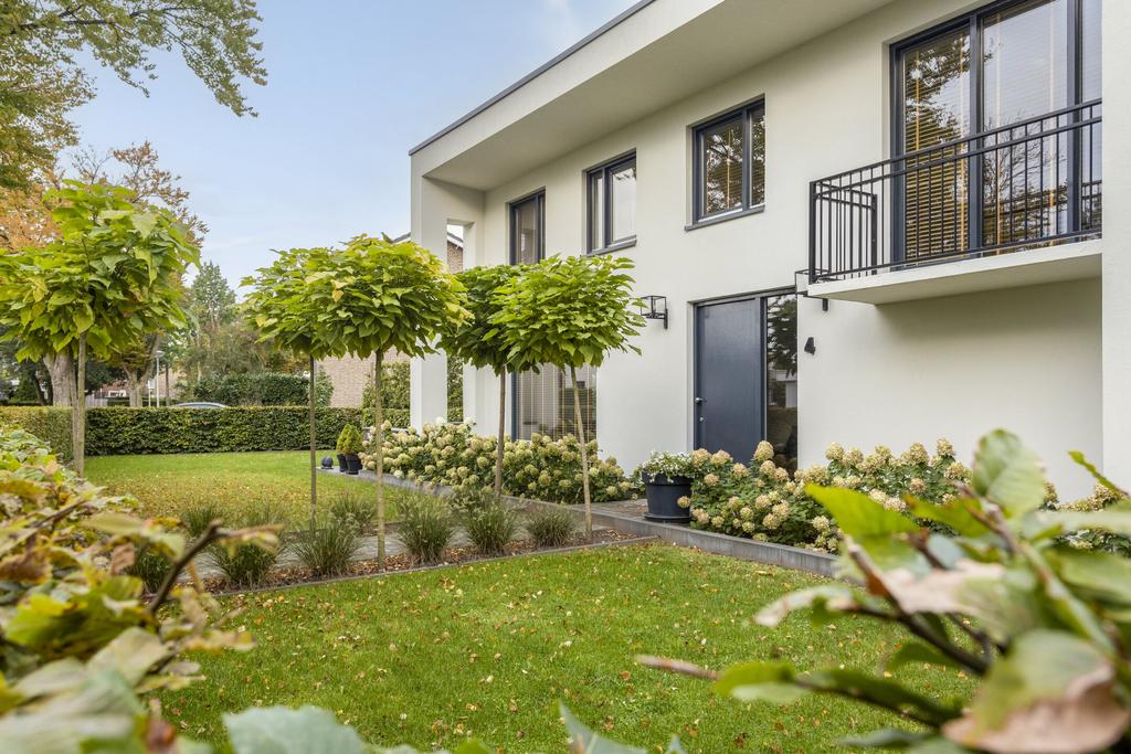 De geheel omsloten, fraai aangelegde achtertuin met fraai zwembad, gazon, diverse borders en terrassen is gelegen op het westen. Het straatbeeld, gekenmerkt door de vele boompartijen is sfeervol en rustiek.