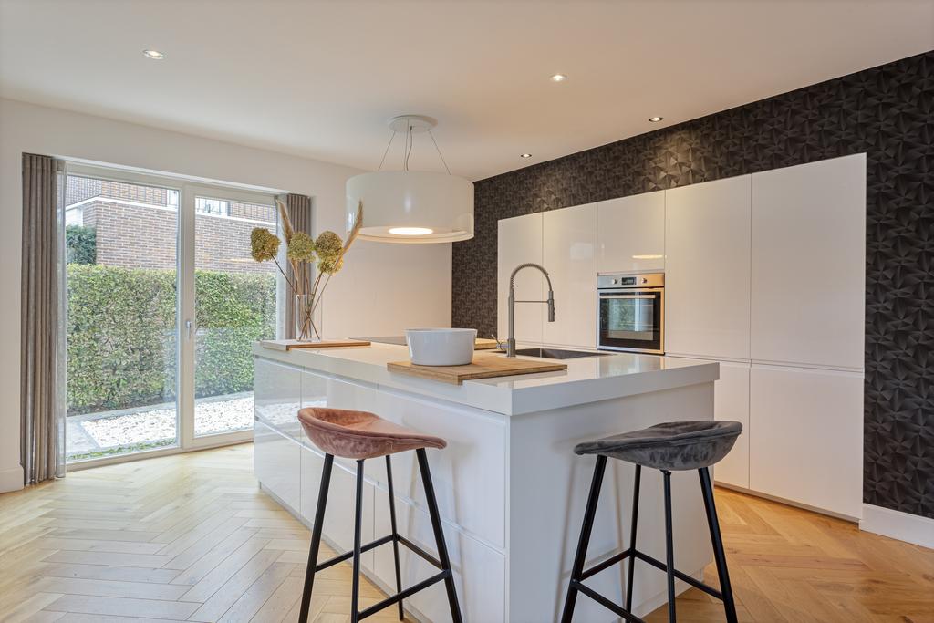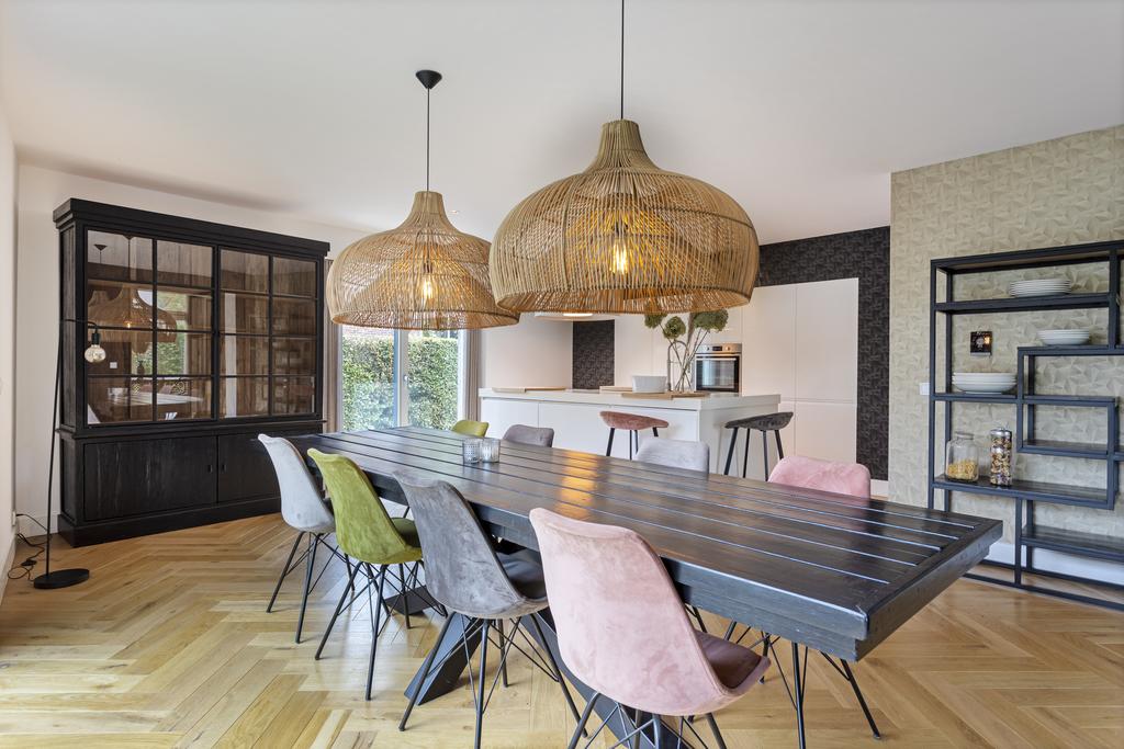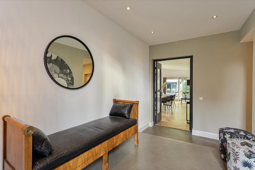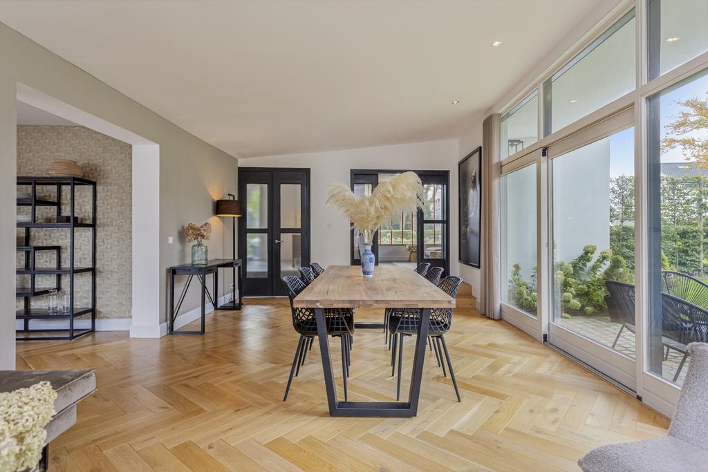 Begane grond: entree, ruime ontvangsthal en doorgang naar de linker- en achtervleugel van de woning met leuke, speelse hoogte verschillen en een knusse, doch ruime TV- kamer (ca. 22 m2) met haardpartij, eetkamer (ca. 30 m2) met fraai tuincontact en de zeer fraaie leef- keuken (ca. 36 m2) eveneens met prachtig tuincontact. De zij- en achtertuin zijn middels een viertal schuifpuien te bereiken. Alle ruimtes zijn of met een betonlook vloer of met een houten visgraad vloer afgewerkt. De keuken is uitgevoerd in een eilandopstelling en voorzien van alle benodigde inbouwapparatuur.