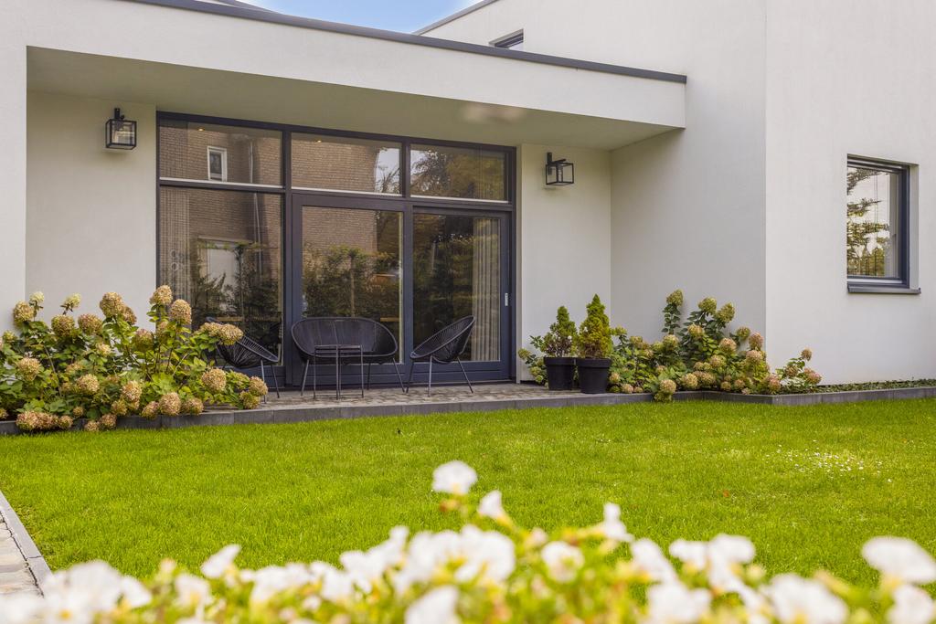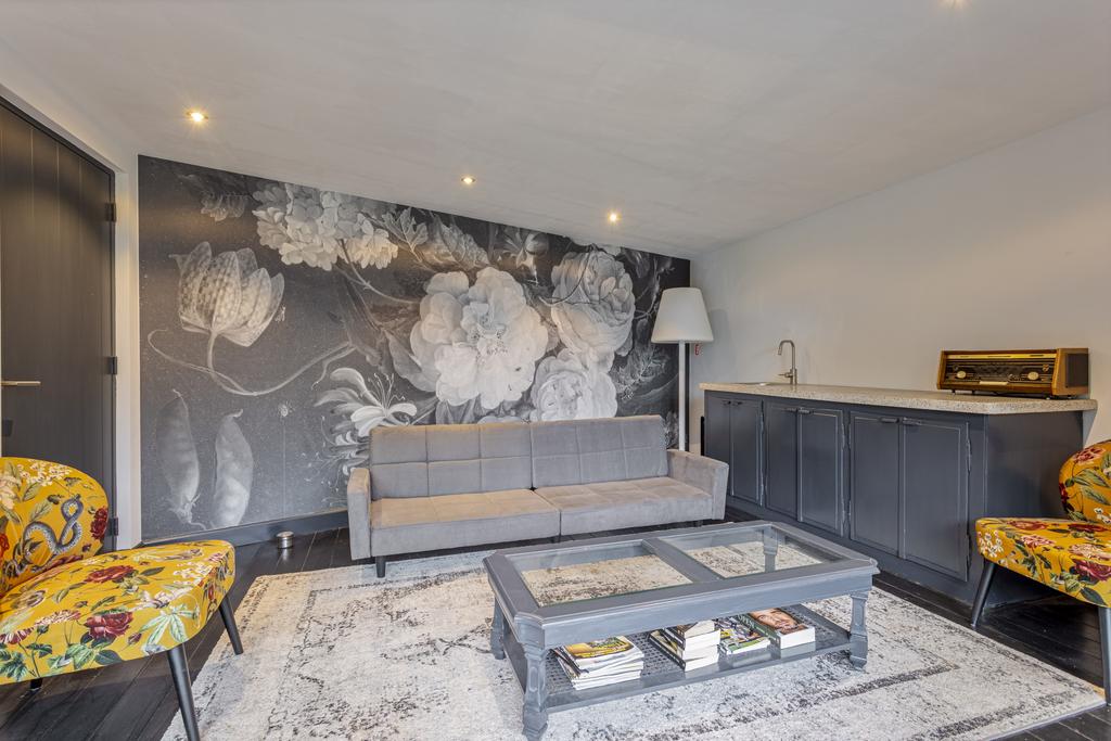Los van de vrijstaande garage rechts achter in de tuin is er links achter in de tuin een waar "gastenverblijf" gerealiseerd (ook ideaal voor opgroeiende kinderen of werken aan huis?). Dit verblijf is ca. 20 m2 groot en bestaat uit een woon- of werkkamer, doucheruimte, toilet, keukenwand en overdekt terras.