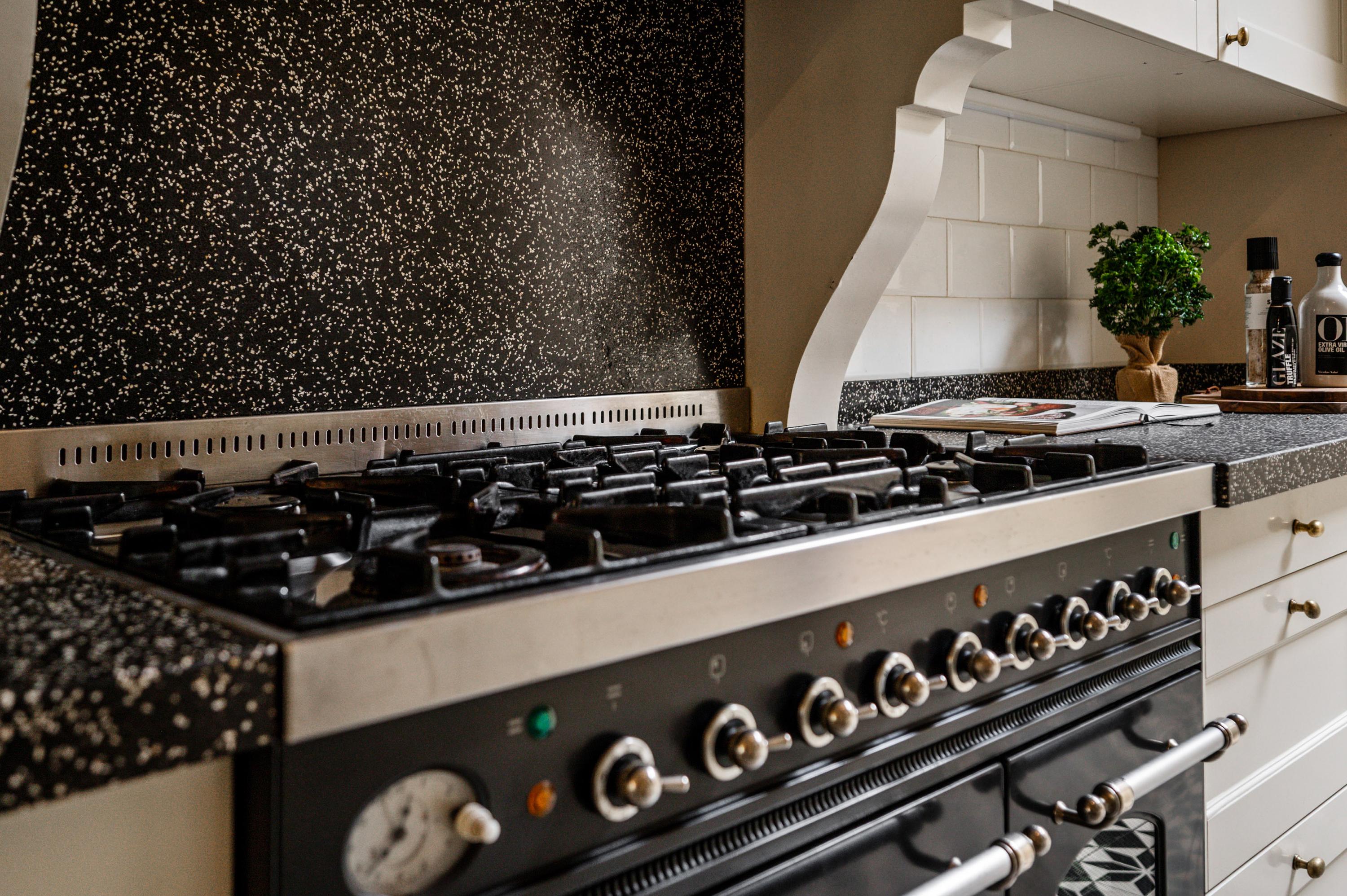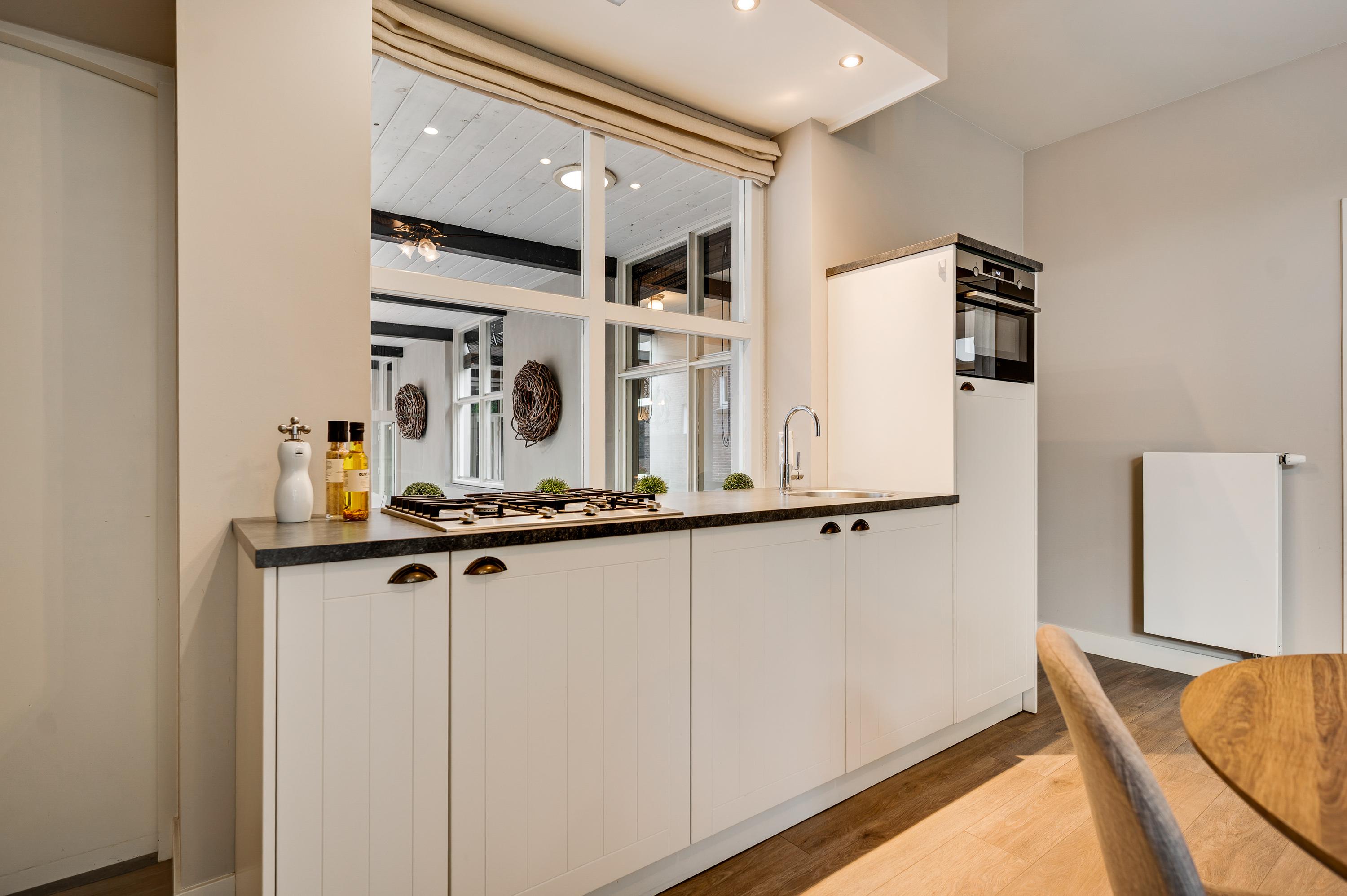 Vanuit de statige hal bereikt u de indrukwekkende woonkeuken van circa 25 m². Deze is uitgerust met een luxe keukenopstelling die klassiek vakmanschap combineert met modern gebruiksgemak. Het terrazzo werkblad, de 6-pits Boretti gasfornuis met dubbele oven, en de hoogwaardige inbouwapparatuur maken deze keuken tot het kloppende culinaire hart van het huis. De klassieke tegelvloer en de hoge paneeldeuren die de keuken van de eetkamer scheiden, benadrukken het verfijnde karakter van de woning.