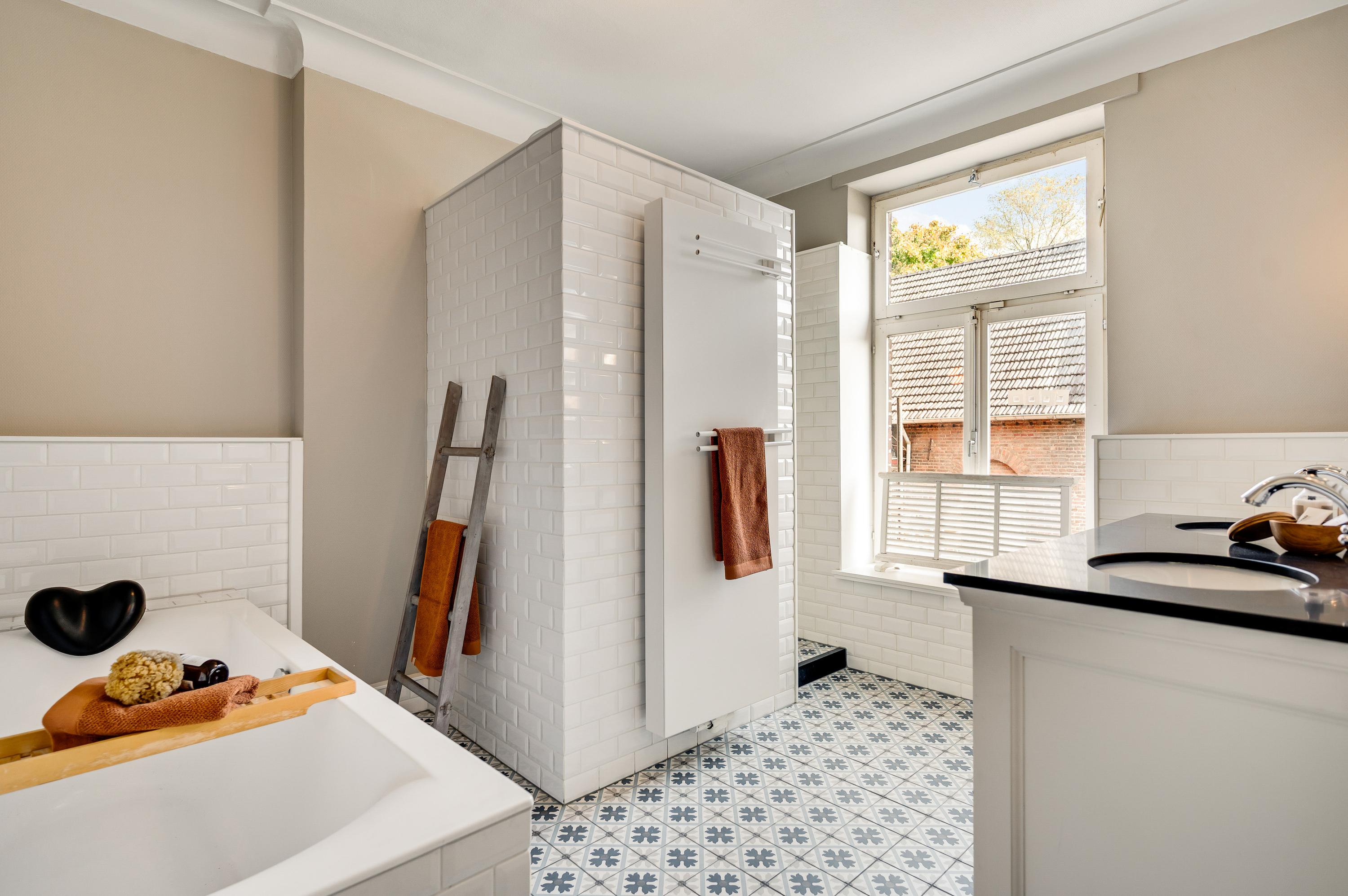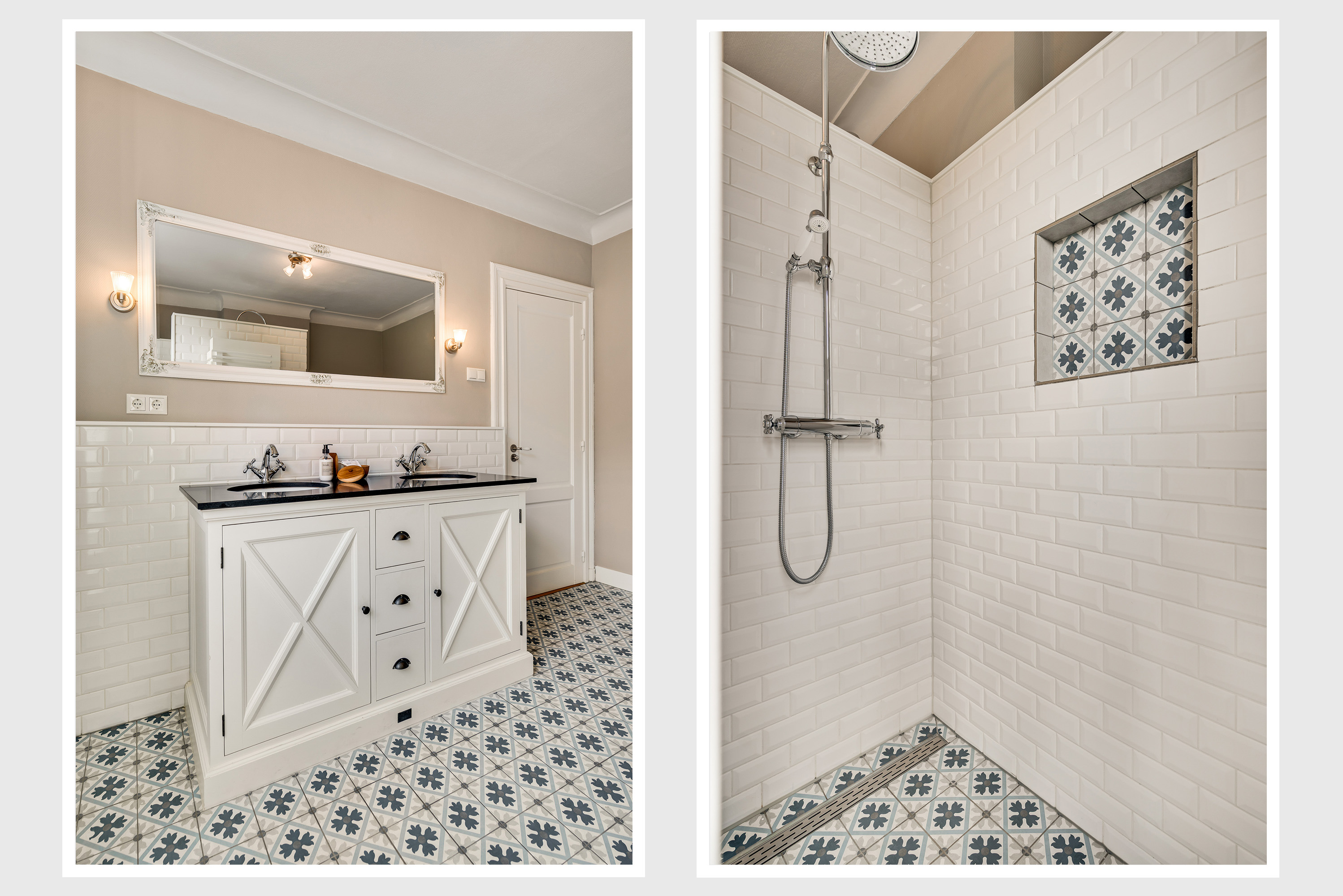 De badkamer is voorzien van een dubbele wastafel, ligbad en douche.