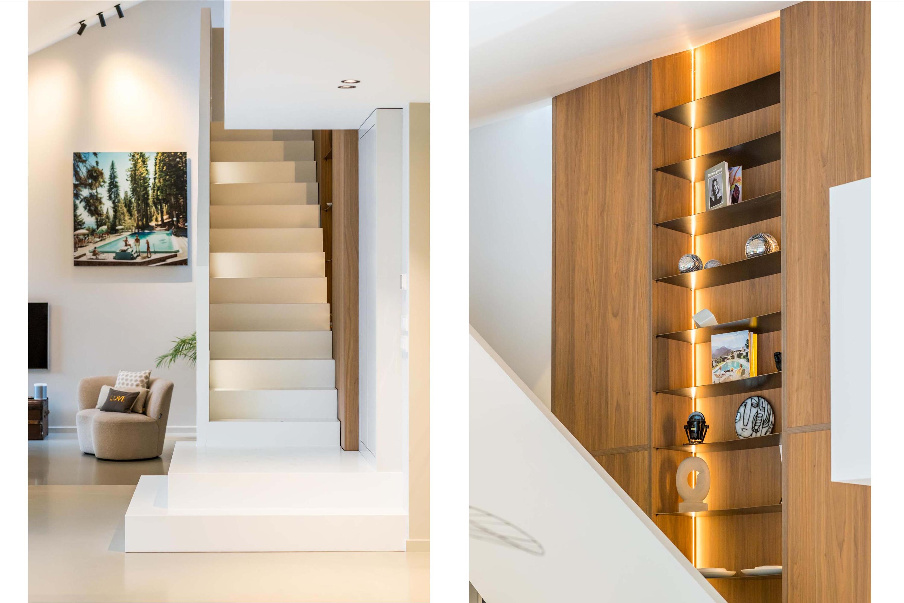 De trapopgang naar de eerste verdieping en vide is een echte eyecatcher en voorzien van een maatwerk vaste kast met prachtige verlichting.