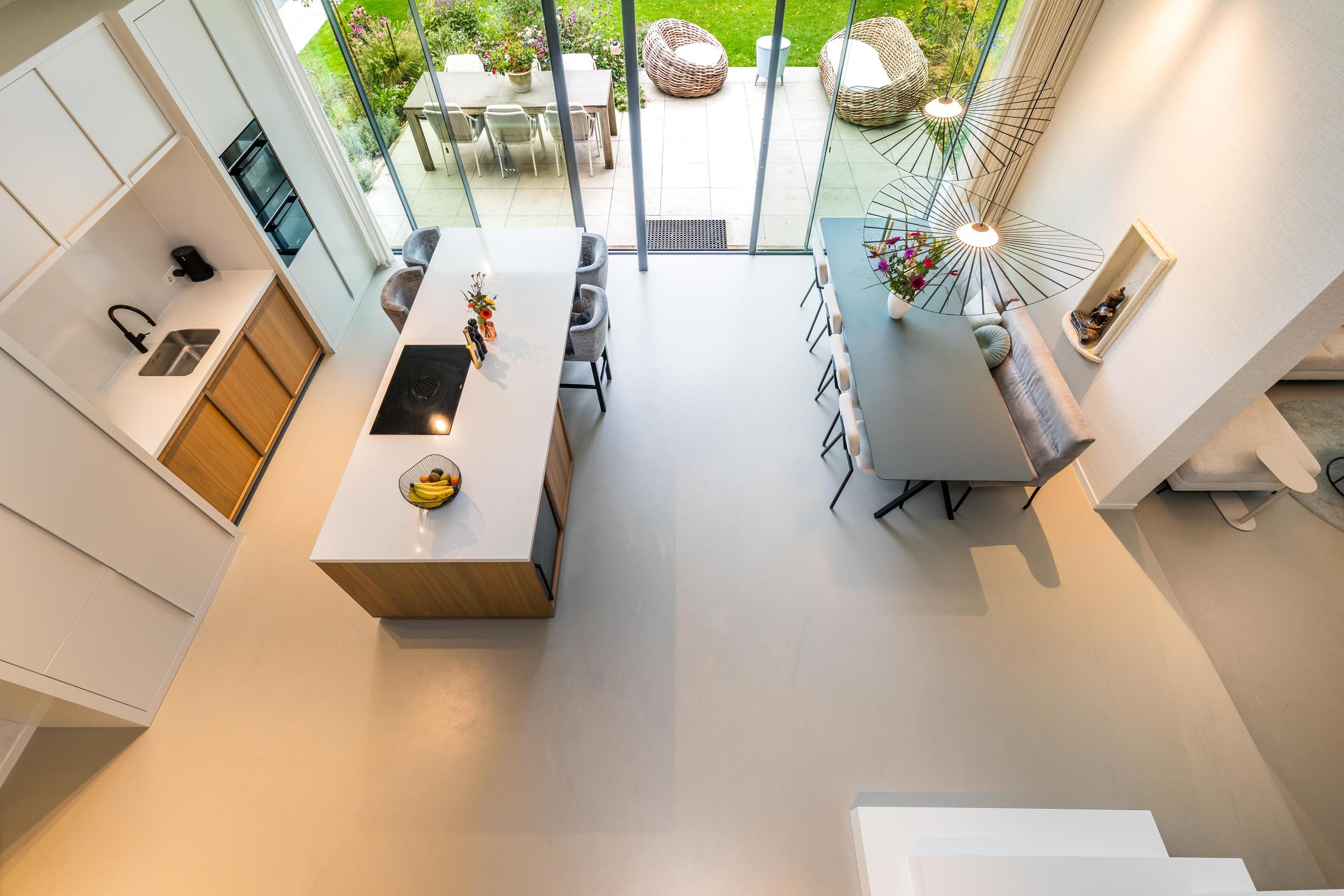 In het verlengde van de entreehal is er toegang tot de tuingerichte woonkeuken met een spectaculaire hoogte, een prachtige strakke keuken met kookeiland en voorzien van alle wenselijke inbouwapparatuur. Schuifpuien geven toegang tot het onderheide terras en de aantrekkelijke achtertuin.