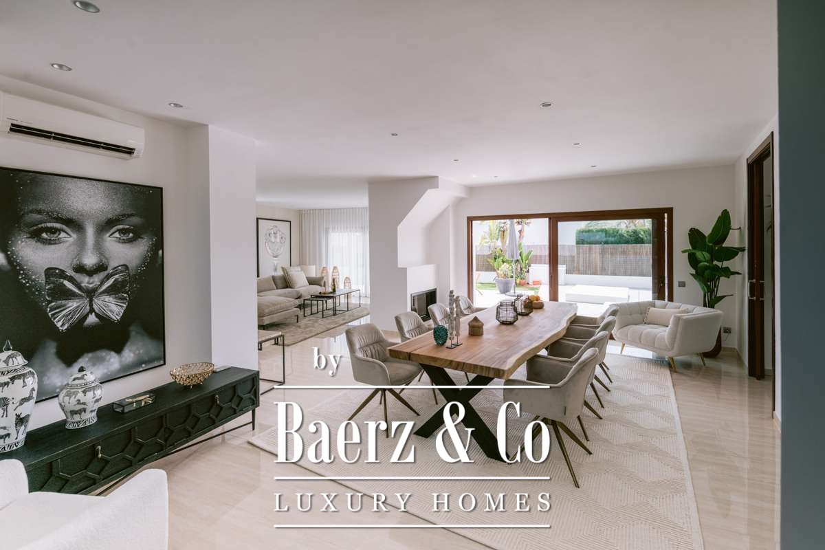 De omgevingDeze uitzonderlijke villa ligt in de pittoreske heuvels van Sa Carroca en biedt een idyllisch toevluchtsoord op de Balearen met maximale privacy in een serene woonwijk. De locatie is perfect voor het vinden van een grote verscheidenheid aan prachtige stranden, allemaal binnen 15 minuten rijden. Het dichtstbijzijnde strand is Playa d'en Bossa, een levendig en breed zandstrand met een lange promenade, restaurants aan zee en levendige strandclubs. Als u op zoek bent naar meer afgelegen en idyllische stranden, ontdek dan de baaien zoals Playa Jondal, waar prestigieuze beachclubs gevestigd zijn zoals Blue Marlin, Jondal en Yemanja. Of verken Cala Sa Caleta, een ongerept strand, aangevuld met het beroemde gelijknamige restaurant dat voortreffelijke paella's serveert. Playa Ses Salines, met zijn ongeëvenaarde kristalheldere azuurblauwe water en witte zandstranden, ligt ook binnen handbereik voor een nog serenere strandervaring. Deze villa ligt in een rustige woonwijk, maar binnen 10 minuten kunt u zich onderdompelen in de levendige sfeer van Playa d'en Bossa of de charmante oude binnenstad van Ibiza, waar u lokale restaurants, bars, winkels en cultureel erfgoed vindt, waaronder de iconische Dalt Vila. Reizen van en naar het eiland is eenvoudig, aangezien de luchthaven op slechts 7 minuten rijden ligt. Dit verblijf biedt de perfecte thuisbasis, met gemakkelijke toegang tot alle belangrijke bezienswaardigheden die Ibiza te bieden heeft. Bovendien biedt het een comfortabele en luxueuze lifestyle.De villaStap binnen in deze prachtige villa, ontworpen door een gerenommeerde architect van het eiland, die moderne vormen combineert met natuurlijke elementen. De halfopen woon- en eetkamer creëren een uitnodigende sfeer, waar grote schuifdeuren de ruimte vullen met natuurlijk licht. Op de begane grond vindt u een moderne woonkamer in Ibiza-stijl, die een perfecte omgeving vormt voor samenzijn met het gezin. Terwijl de kinderen spelletjes spelen of tv kijken in de woonkamer, kunnen de ouders genieten van gesprekken onder het genot van een glas wijn in de eetkamer, gescheiden door een gedeeltelijke muur en een moderne doorkijkhaard. De woonkamer is ingericht met elegante nissen in Balearische stijl en biedt toegang tot de volledig uitgeruste keuken. De traditionele en toch moderne U-vormige keuken is uitgerust met hoogwaardige inbouwapparatuur, waaronder een grote dubbeldeurs koelkast en vriezer, grote oven, magnetron en een gloednieuwe inductiekookplaat. Deze ruimte is ideaal voor sociaal koken, waar familie en vrienden zich rond de bar kunnen verzamelen terwijl u culinaire hoogstandjes creëert. Grenzend aan de keuken vindt u een bijkeuken en een aparte wasruimte. Op de begane grond vindt u ook een van de vier slaapkamers. Beklim de luxueuze trap naar de bovenverdieping, waar de hoofdslaapkamer en twee extra slaapkamers op u wachten. De hoofdslaapkamer heeft een jacuzzi, een moderne maar gezellige open haard en toegang tot een groot balkon met uitzicht op de weelderige tuin en de bergen. De andere drie slaapkamers stralen een rustige en serene sfeer uit, met eigen of aparte badkamers, allen versierd met luxe natuurlijke tegels en marmeren afwerkingen. Deze fantastische villa beschikt over voorzieningen zoals veel bergruimte, een geavanceerd alarmsysteem, airconditioning die gedurende het hele jaar voor comfort zorgt evenals ramen met dubbele beglazing. Bovendien beschikt het pand ook over zonnepanelen voor een duurzame levensstijl onder de Spaanse zon.De buitenruimtesStap buiten in de weelderige en ruime tuin, prachtig aangelegd in een moderne en toch tropische stijl die het hele jaar door vakantie uitstraalt. Deze geweldige villa heeft een groot zwembad met een luxe resort-stijl, inclusief comfortabele ligstoelen. U vindt er een overdekte eethoek met een buitenkeuken inclusief gootsteen, twee gaspitten en een authentieke, ingebouwde barbecue om te genieten van heerlijke maaltijden vers van het houtskool. Het terrein is volledig omheind en biedt een carport garage om uw auto te parkeren, met daarnaast voldoende buiten parkeergelegenheid op het terrein. Het huis heeft veel gezellige buitenzitjes en balkons, waar u kunt genieten van het prachtige panoramische uitzicht vanuit elke hoek, van zonsopgang tot zonsondergang. Ervaar de perfecte mix van luxe en comfort terwijl u de ultieme Balearische levensstijl zowel binnen als buiten beleeft in deze prachtige woning die u uw droomhuis mag noemen.