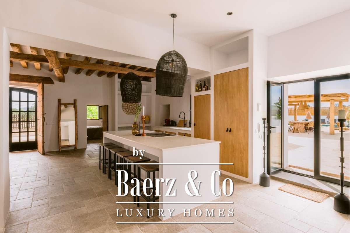 De omgevingDit uitzonderlijke pand is genesteld in het hart van Sant Jordi, Ibiza, en biedt een unieke locatie op slechts 3 minuten rijden van de luchthaven en op 10 minuten rijden van de bruisende Ibiza-stad. Bovendien vindt u binnen 10 minuten rijden ook de befaamdste kust pareltjes van het eiland, waaronder Las Salinas, Sa Caleta, Cala Jondal en de exclusieve Blue Marlin Beach Club. Deze prachtige stranden en hotspots liggen vlakbij deze woning, in het hart van de bruisende levensstijl van het eiland. Dit is een perfecte locatie voor wie op zoek is naar privacy en toch graag dicht bij het centrum wilt wonen. Deze residentie biedt een harmonieuze mix van sereniteit en goede bereikbaarheid.De villaDeze prachtige villa, gerenoveerd in 2023 met hoogwaardige materialen, straalt een unieke bohemian chique stijl uit. Bij binnenkomst wordt u verwelkomd door de open woon- en eetkamer, die over verschillende vloerniveaus beschikt. Deze lopen naadloos in elkaar over en zorgen direct voor een uitnodigende en knusse sfeer. De finca is voorzien van een compleet uitgeruste design keuken met moderne apparatuur. Ook is elk detail van het huis zorgvuldig uitgekozen en de nieuwe moderne stijl sluit feilloos aan bij de authentieke Ibicencan charme. De hoofdwoning bestaat uit 5 ruime, prachtige slaapkamers, elk met een ensuite badkamer die voorzien is van luxe regendouches. De master bedroom beschikt ook over een comfortabel ligbad. Daarnaast is er een charmant gastenverblijf, de "casita", bestaande uit een volledig uitgeruste open woon-eetkamer, twee slaapkamers en een gedeelde badkamer.