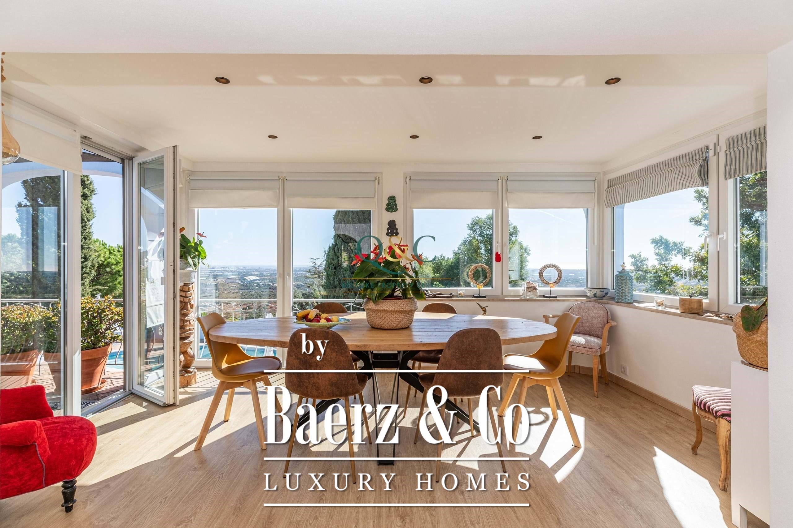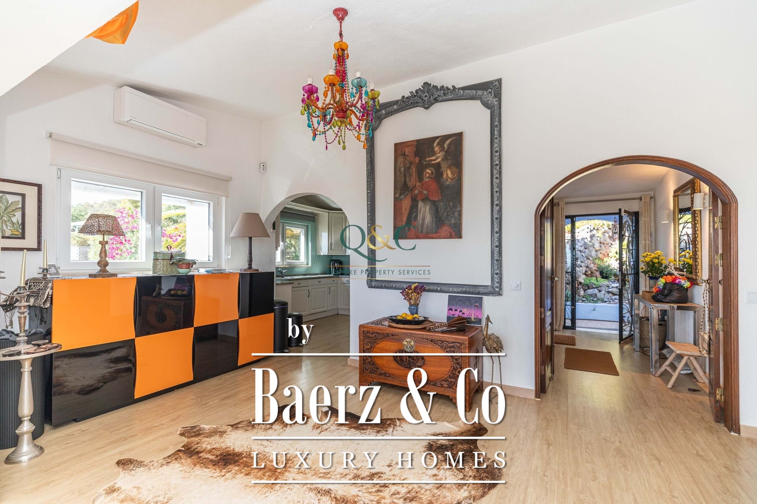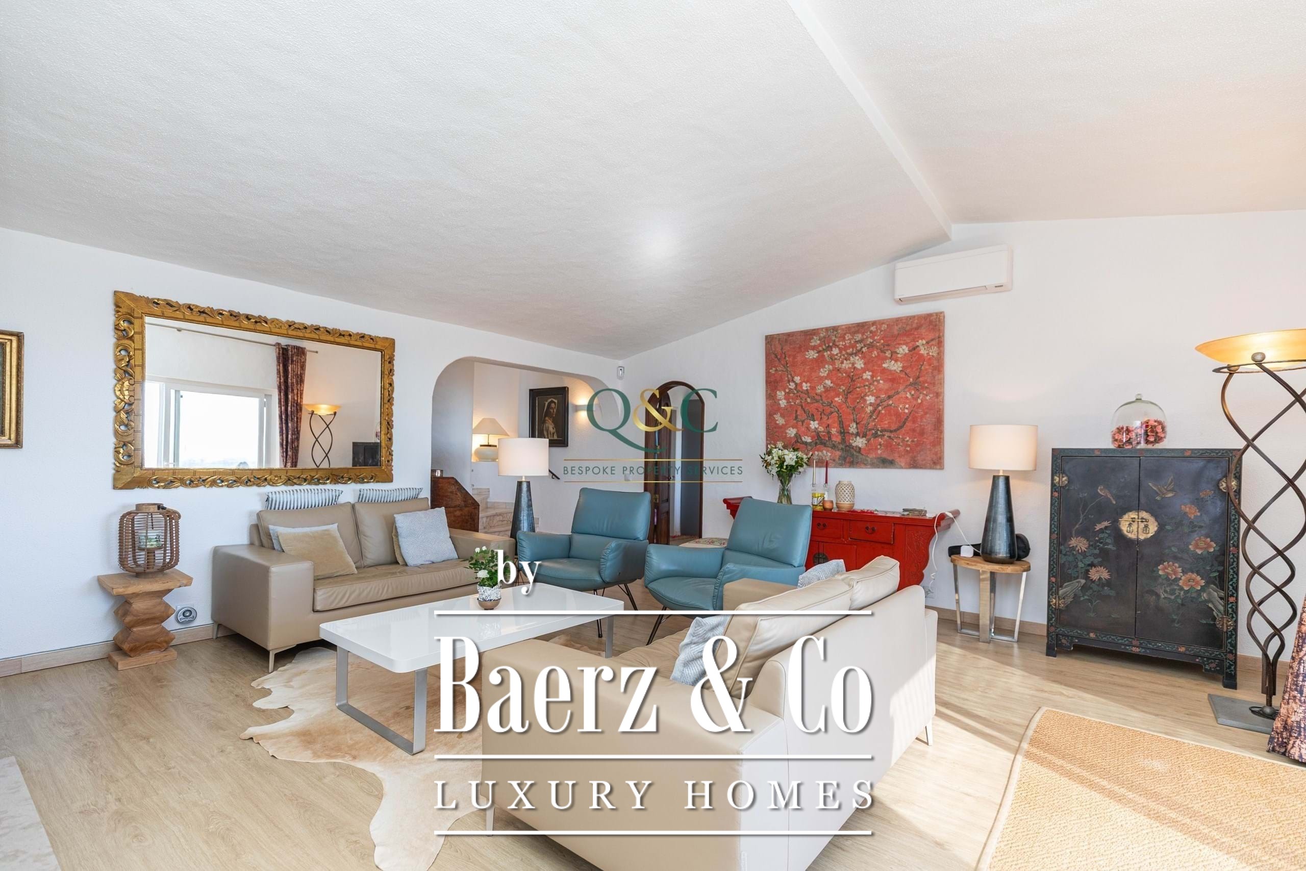 De hoofdwoning omvat 292 m² verdeeld over twee verdiepingen, waarbij traditioneel karakter is gecombineerd met verfijnde, hedendaagse updates. De royale living met open haard en panoramisch uitzicht sluit naadloos aan op de volledig uitgeruste keuken en loopt door naar een overdekt terras. Deze buitenruimte, ideaal bij zonsopkomst en zonsondergang, kijkt uit op fraai aangelegde tuinen met droogteresistente beplanting en een sereen zwembadgedeelte onder volwassen bomen.