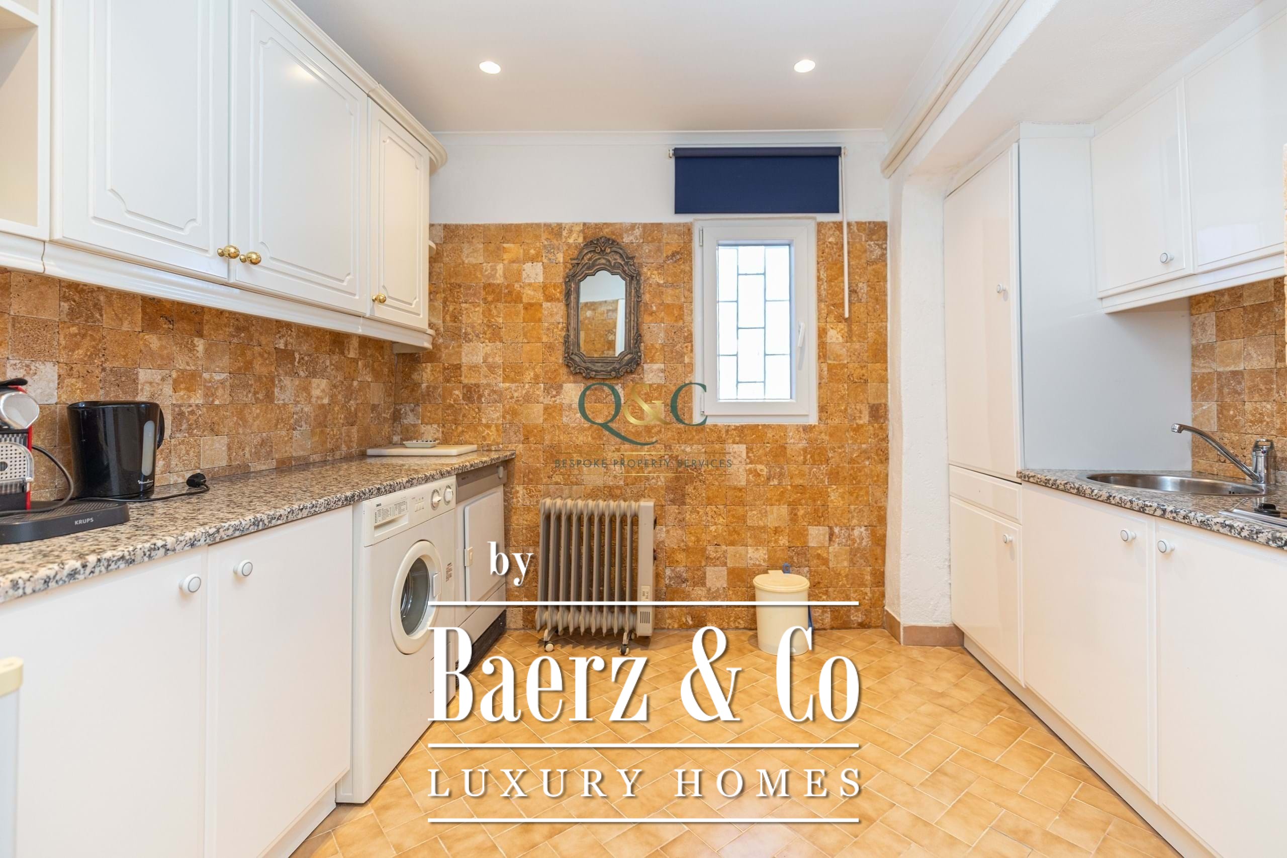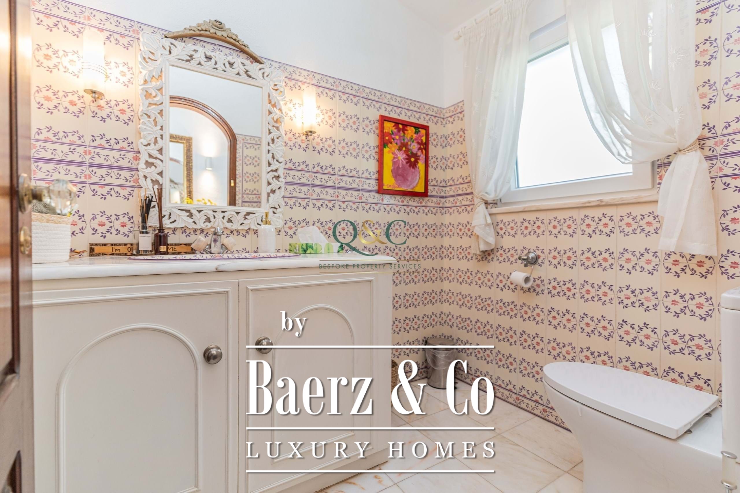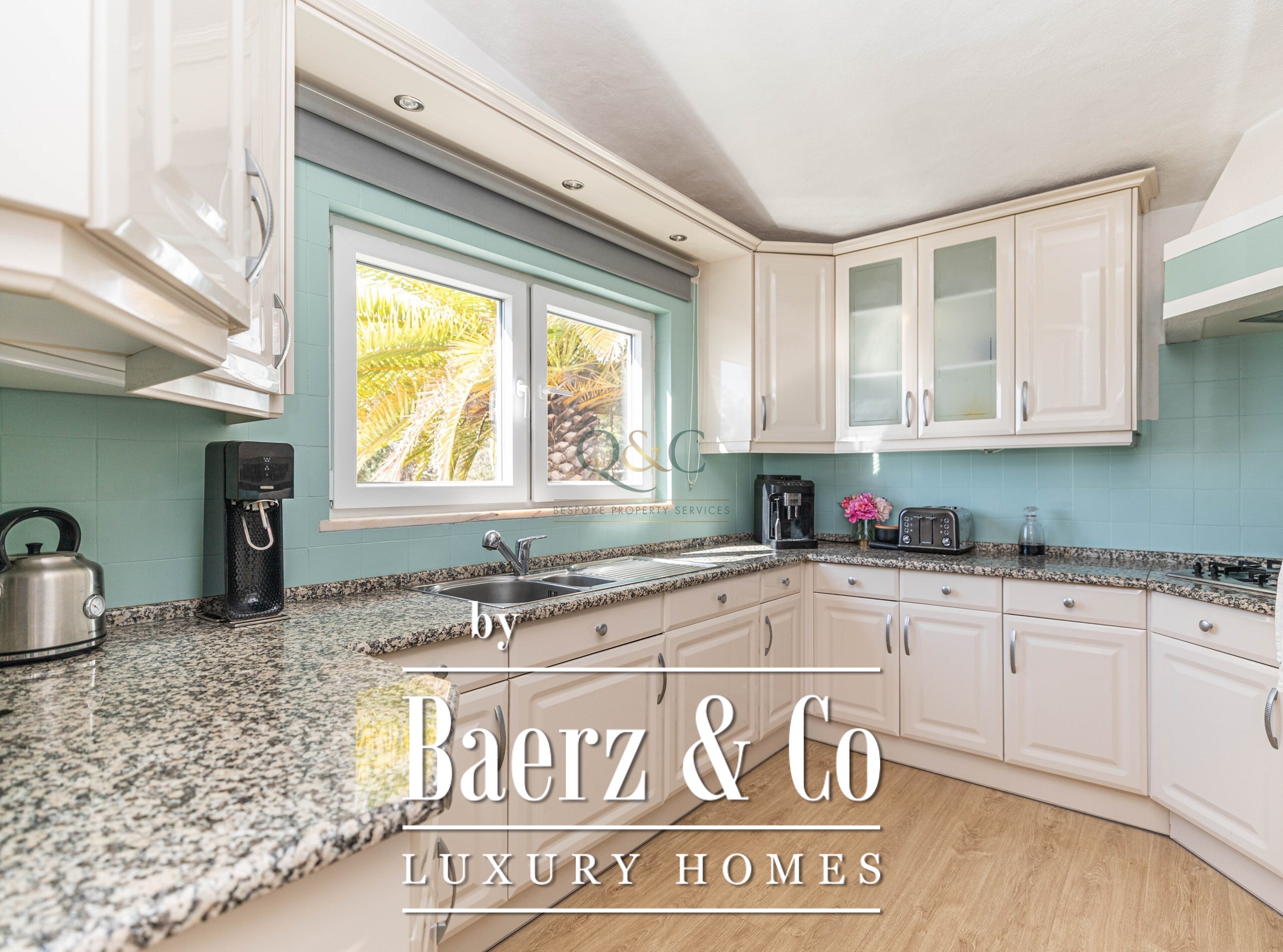 De hoofdwoning omvat 292 m² verdeeld over twee verdiepingen, waarbij traditioneel karakter is gecombineerd met verfijnde, hedendaagse updates. De royale living met open haard en panoramisch uitzicht sluit naadloos aan op de volledig uitgeruste keuken en loopt door naar een overdekt terras. Deze buitenruimte, ideaal bij zonsopkomst en zonsondergang, kijkt uit op fraai aangelegde tuinen met droogteresistente beplanting en een sereen zwembadgedeelte onder volwassen bomen.