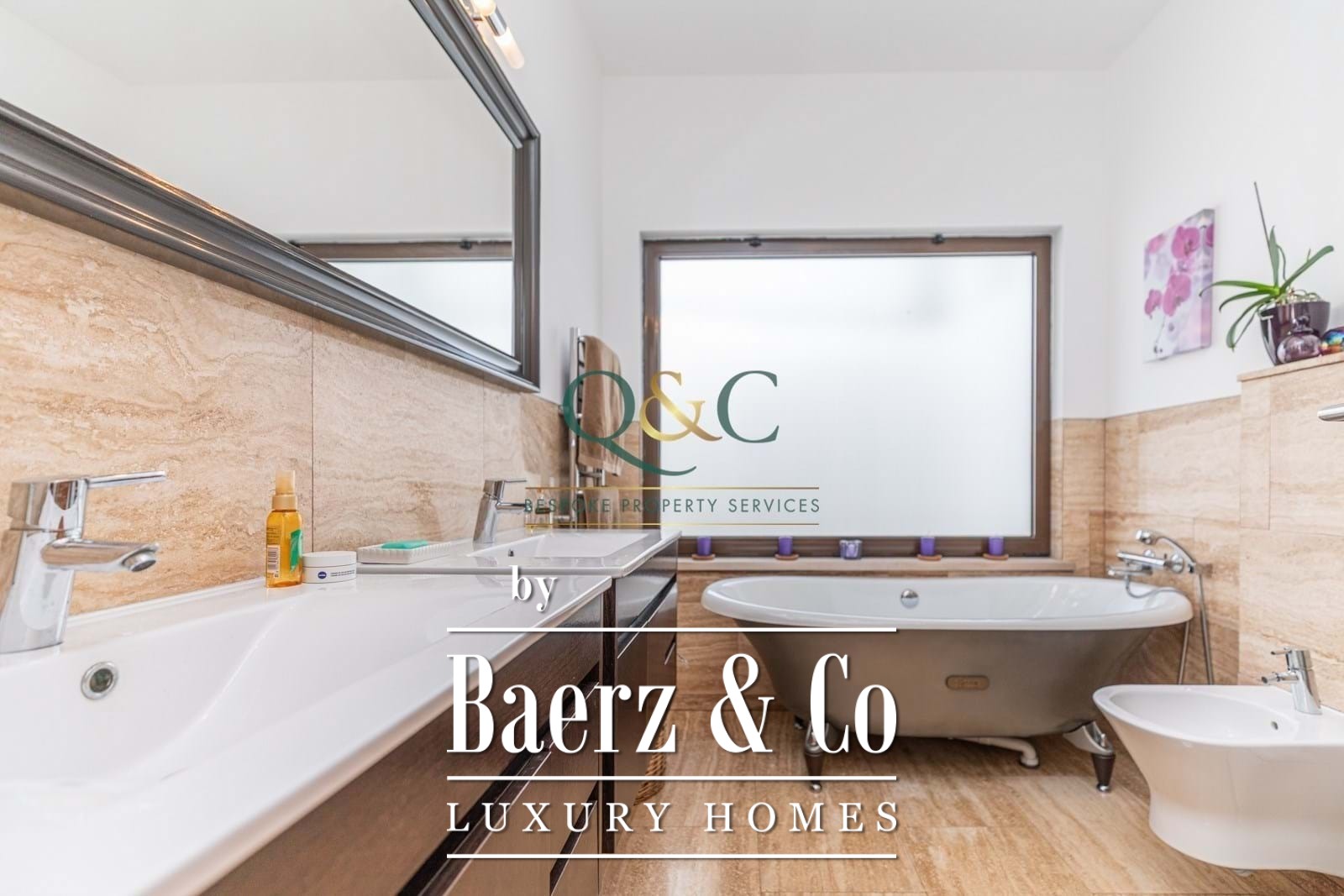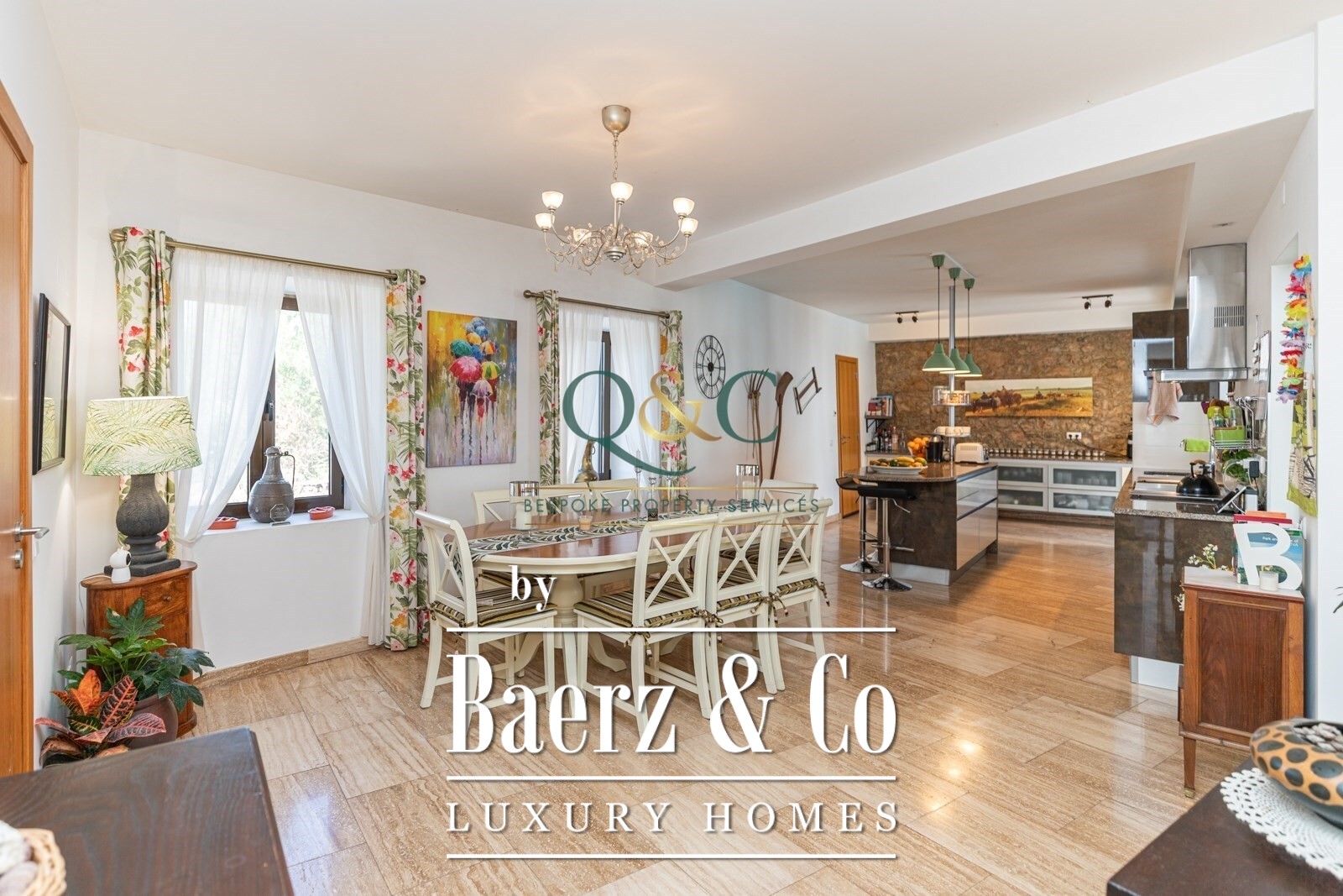 Een calçada-oprit markeert de entree van het landgoed en leidt naar een royale garage en praktische bijkeuken, rechtstreeks verbonden met het hart van de woning: de volledig uitgeruste keuken en eetruimte. De ontvangstruimte baadt in het licht en biedt uitzicht op de tuin, en loopt moeiteloos door naar de woon- en entertainmentruimtes. De hoofdsuite, gelegen aan twee zijden van de tuin, beschikt over een en-suite badkamer met vrijstaand bad en inloopdouche, en vormt zo een exclusieve privévertrek binnen het huis. Alle vier slaapkamers hebben een eigen badkamer; één van de kamers beschikt over een vide die ideaal is als werk- of ontspanningsruimte, met toegang tot een beschut dakterras.