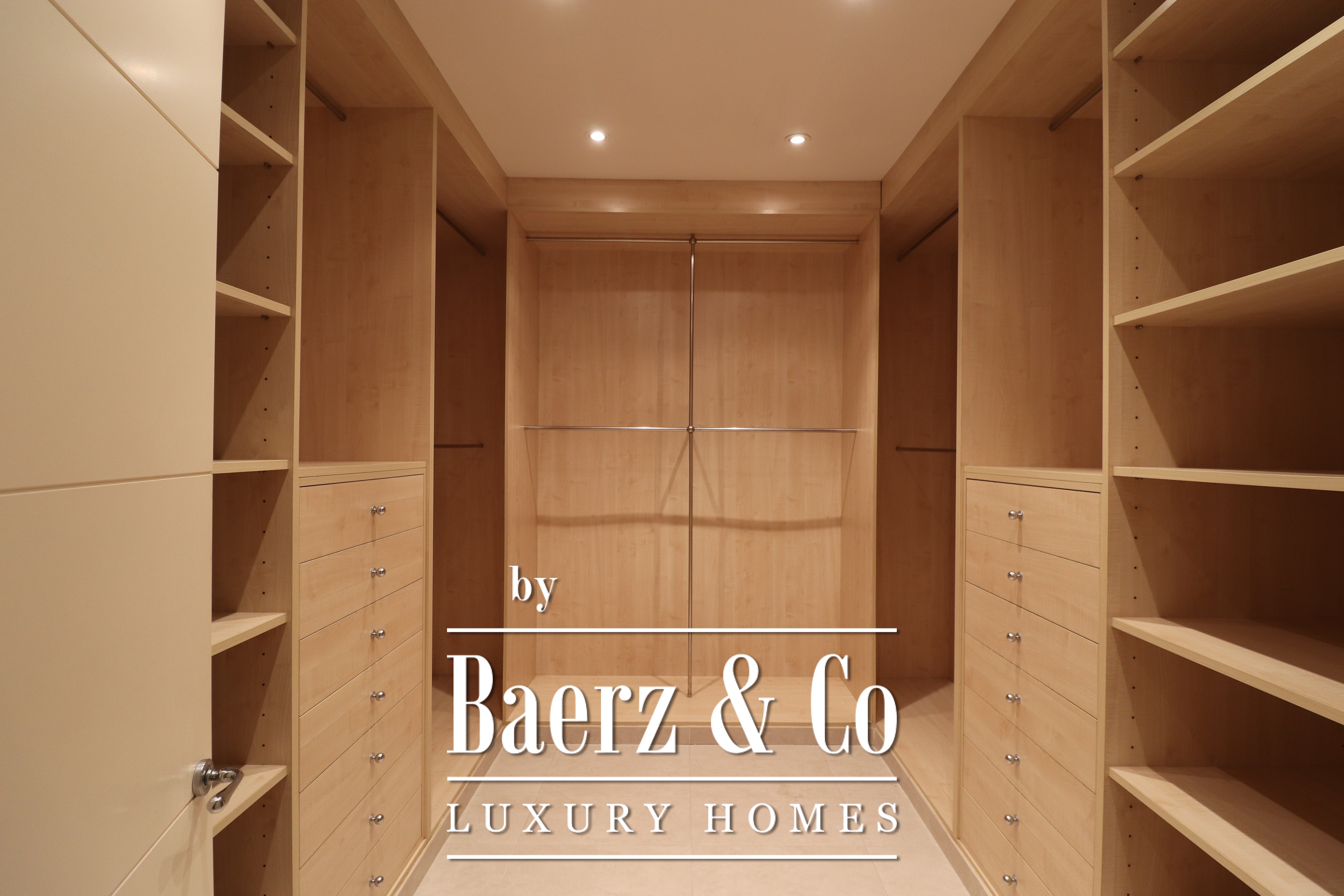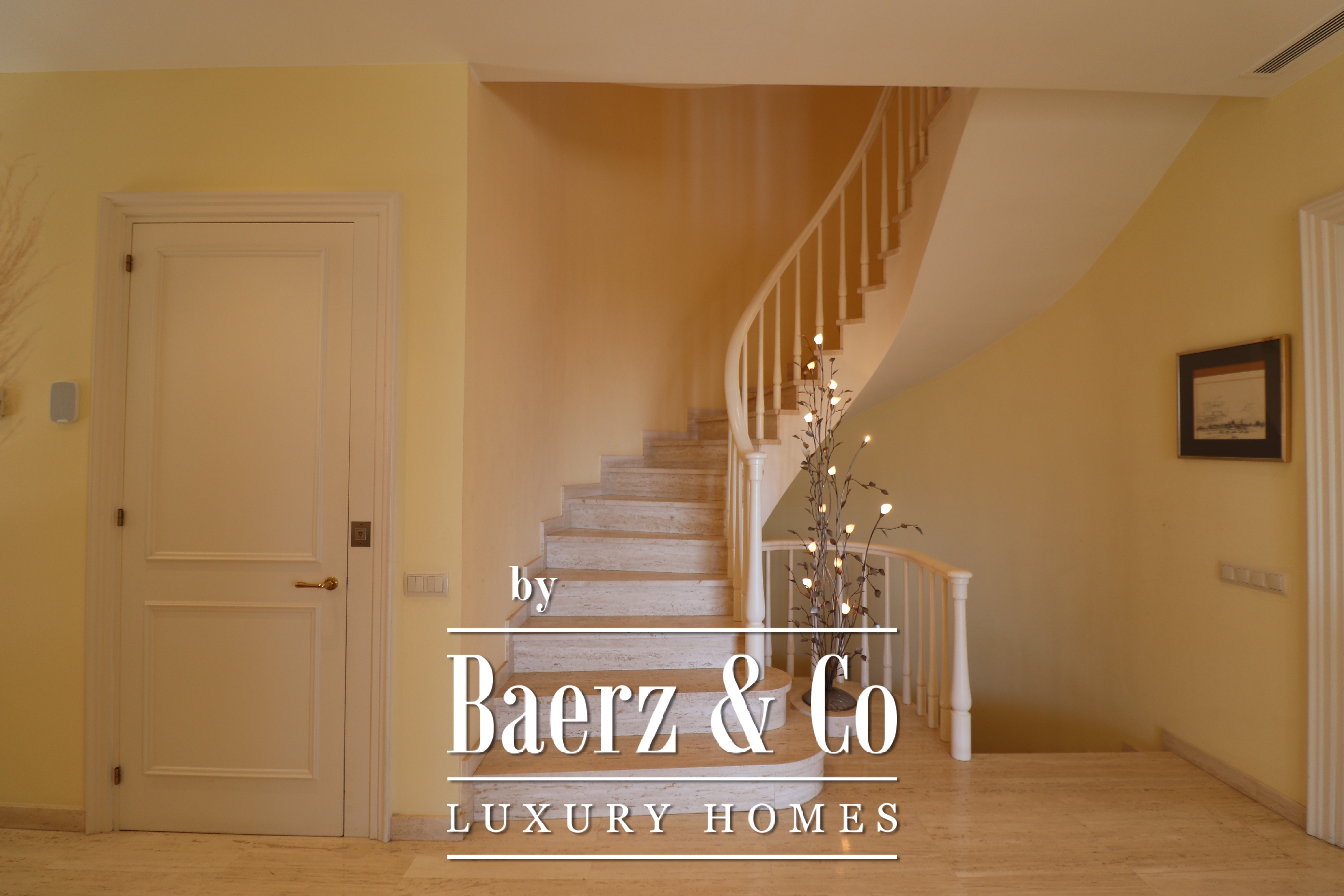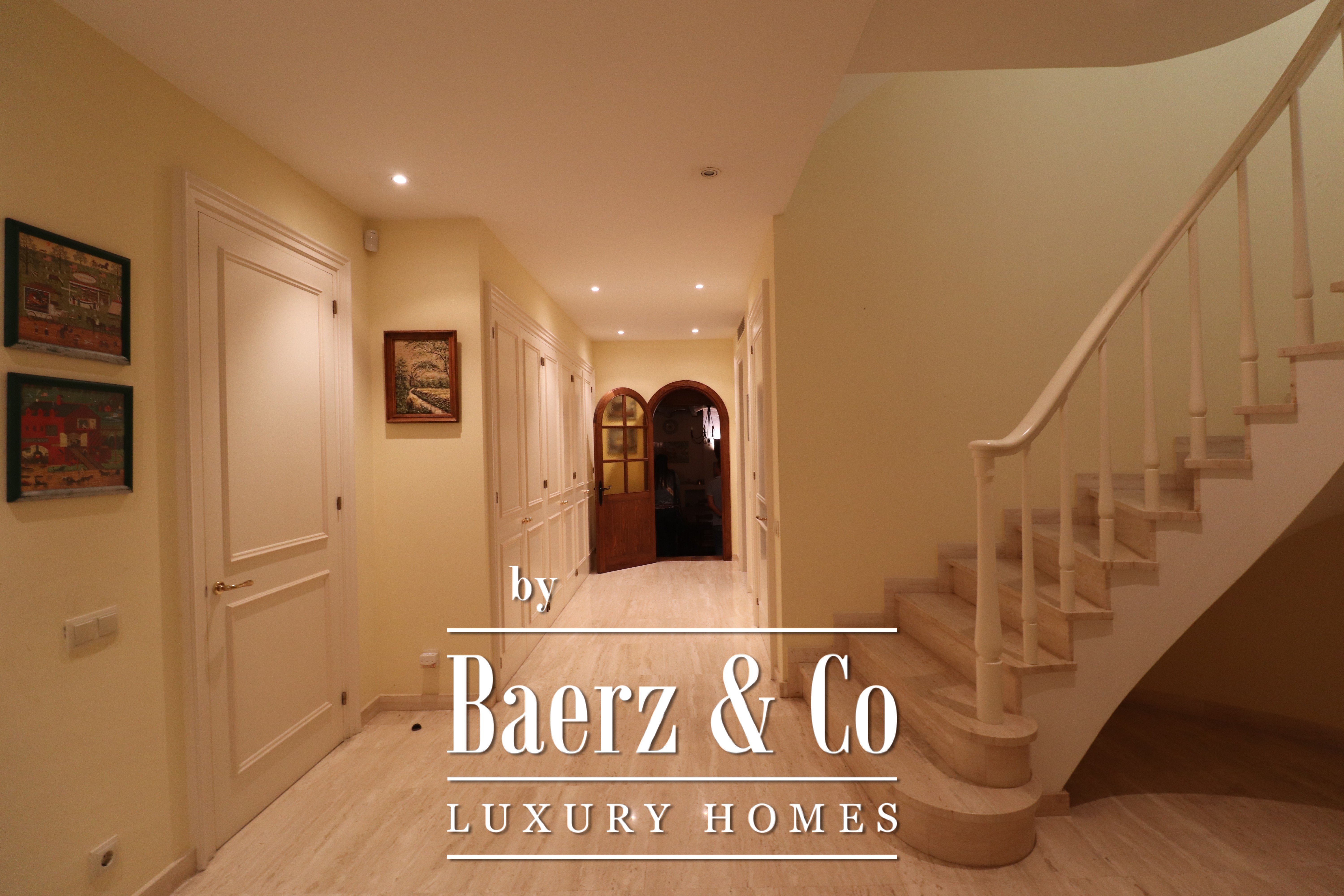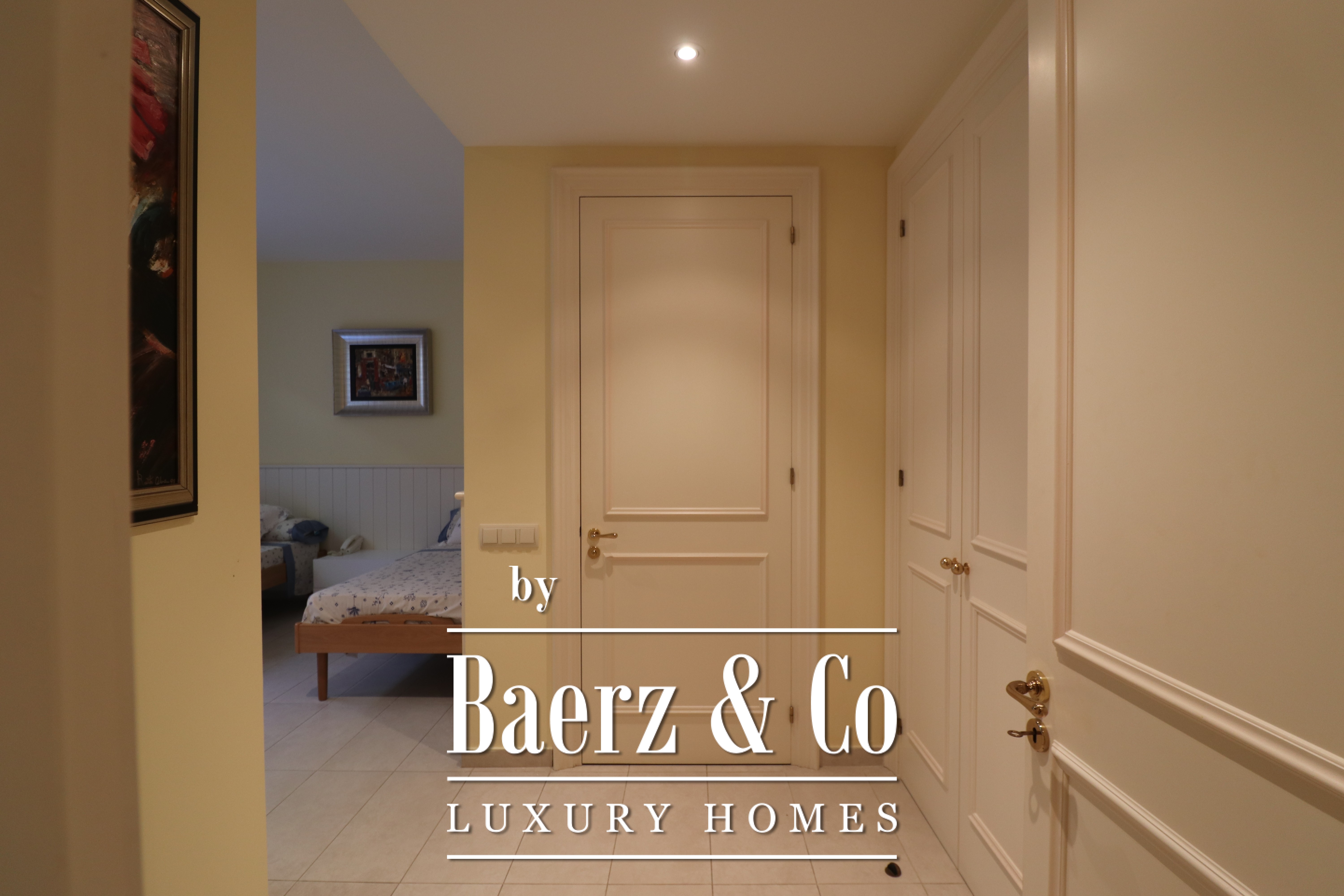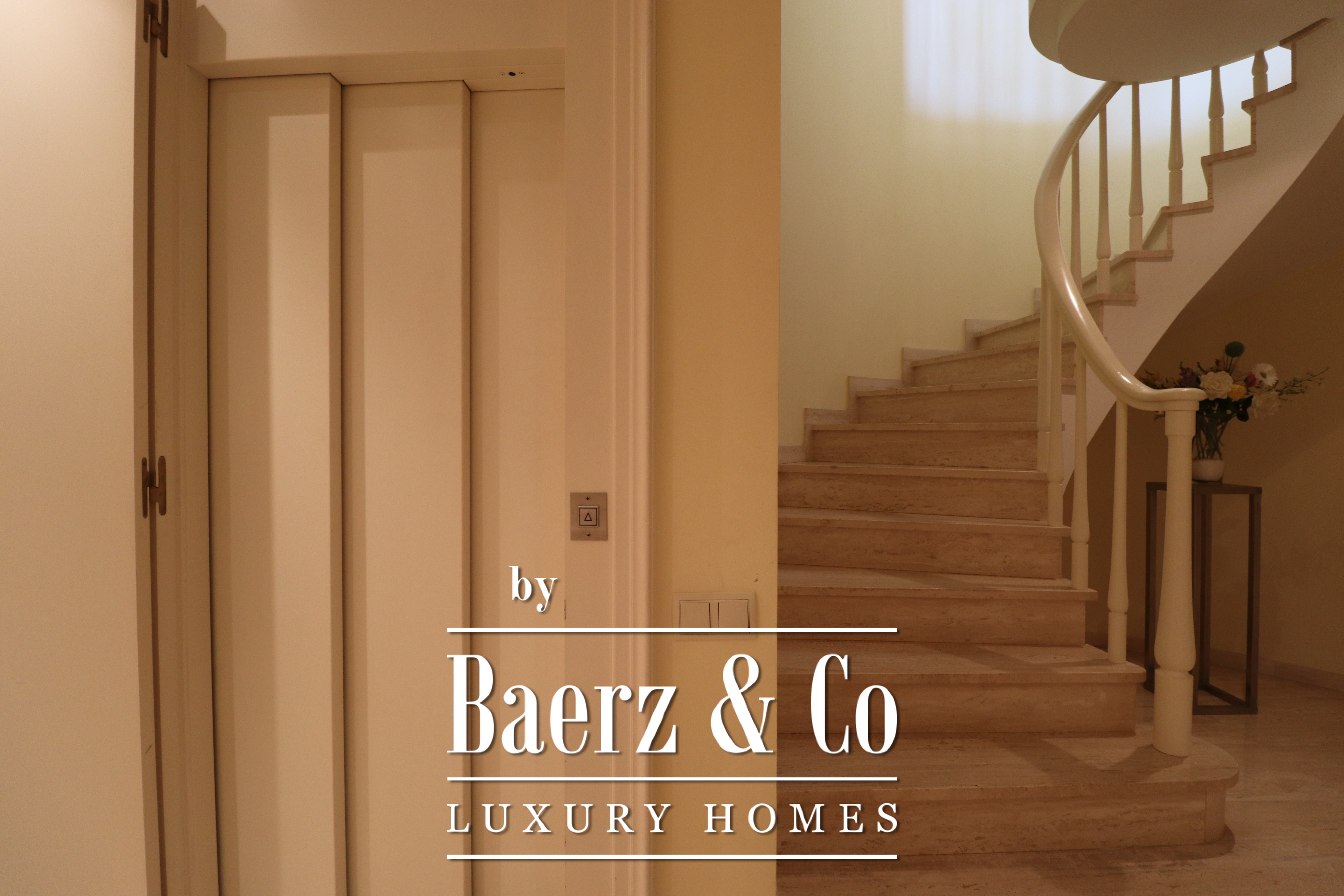 Ontworpen met oog voor discretie en comfort, spreidt de villa zich uit over drie verdiepingen, verbonden door een privé-lift. De hoofdverdieping begint met een stijlvolle entreehal en vloeit over in een open leefruimte met een salon en eetkamer, een mediaruimte, en een volledig uitgeruste keuken met aangrenzende bijkeuken en een dedicated kantoor. Vijf slaapkamers en acht badkamers bieden ruimte aan gezinsleven én grootschalig ontvangen.