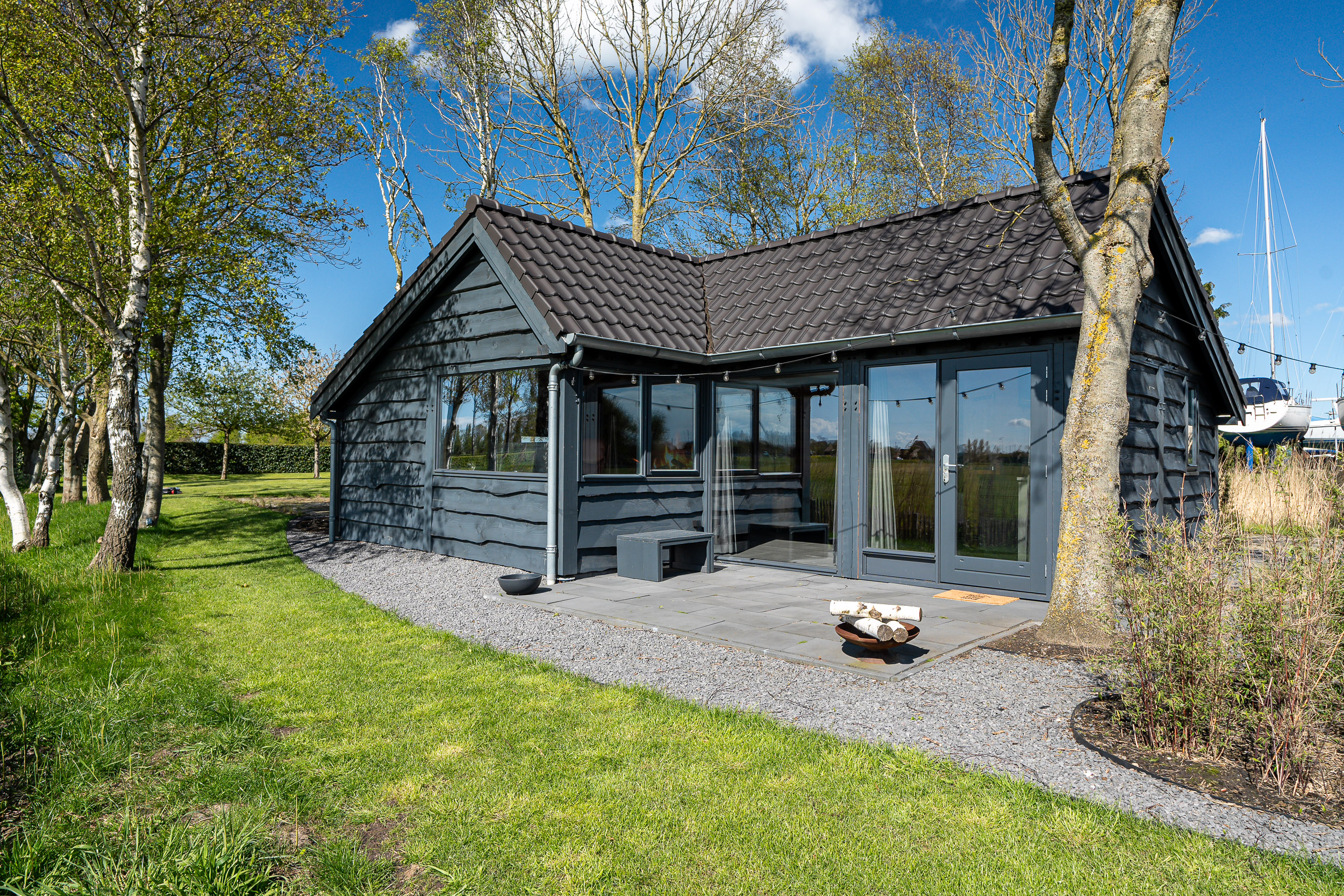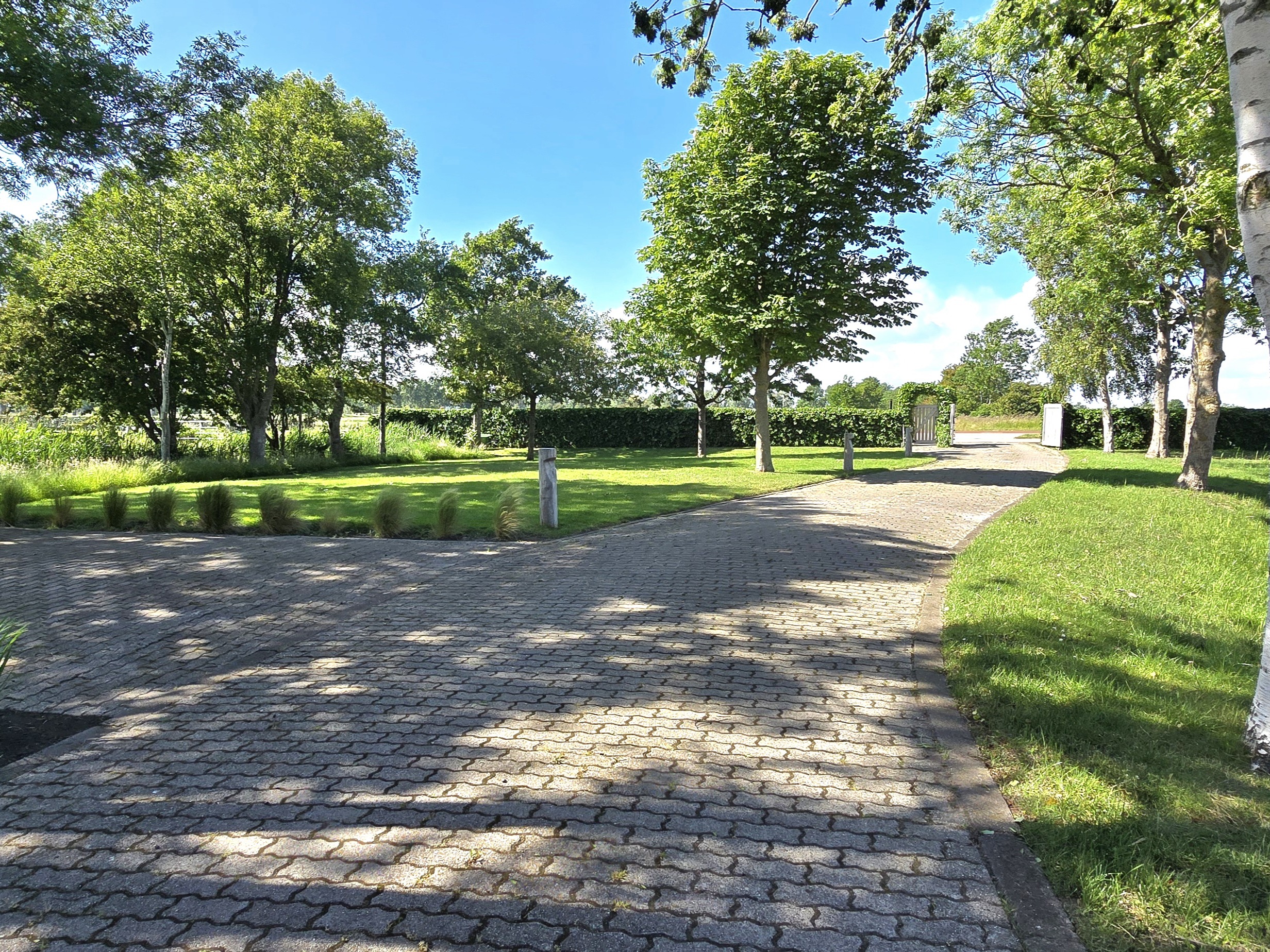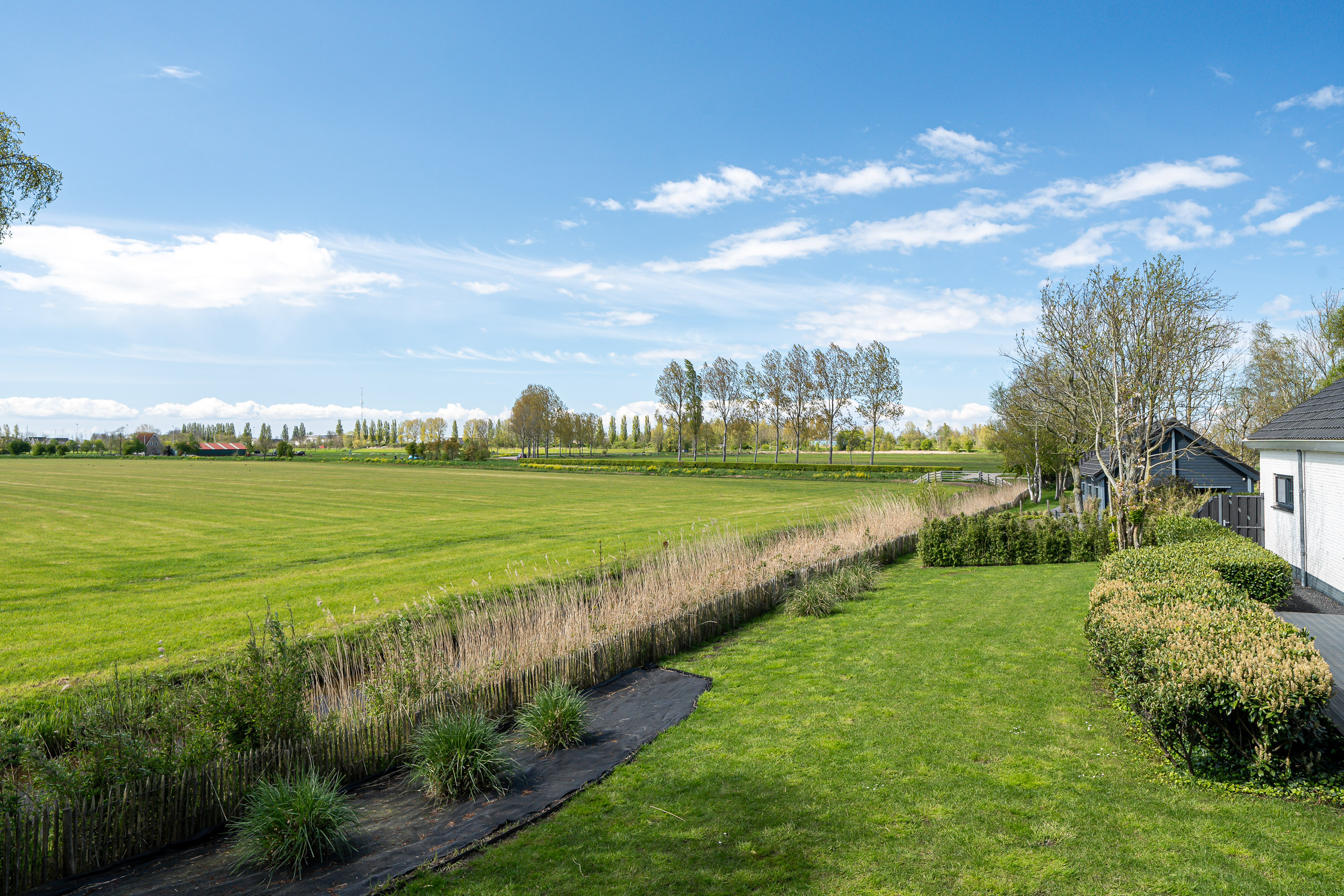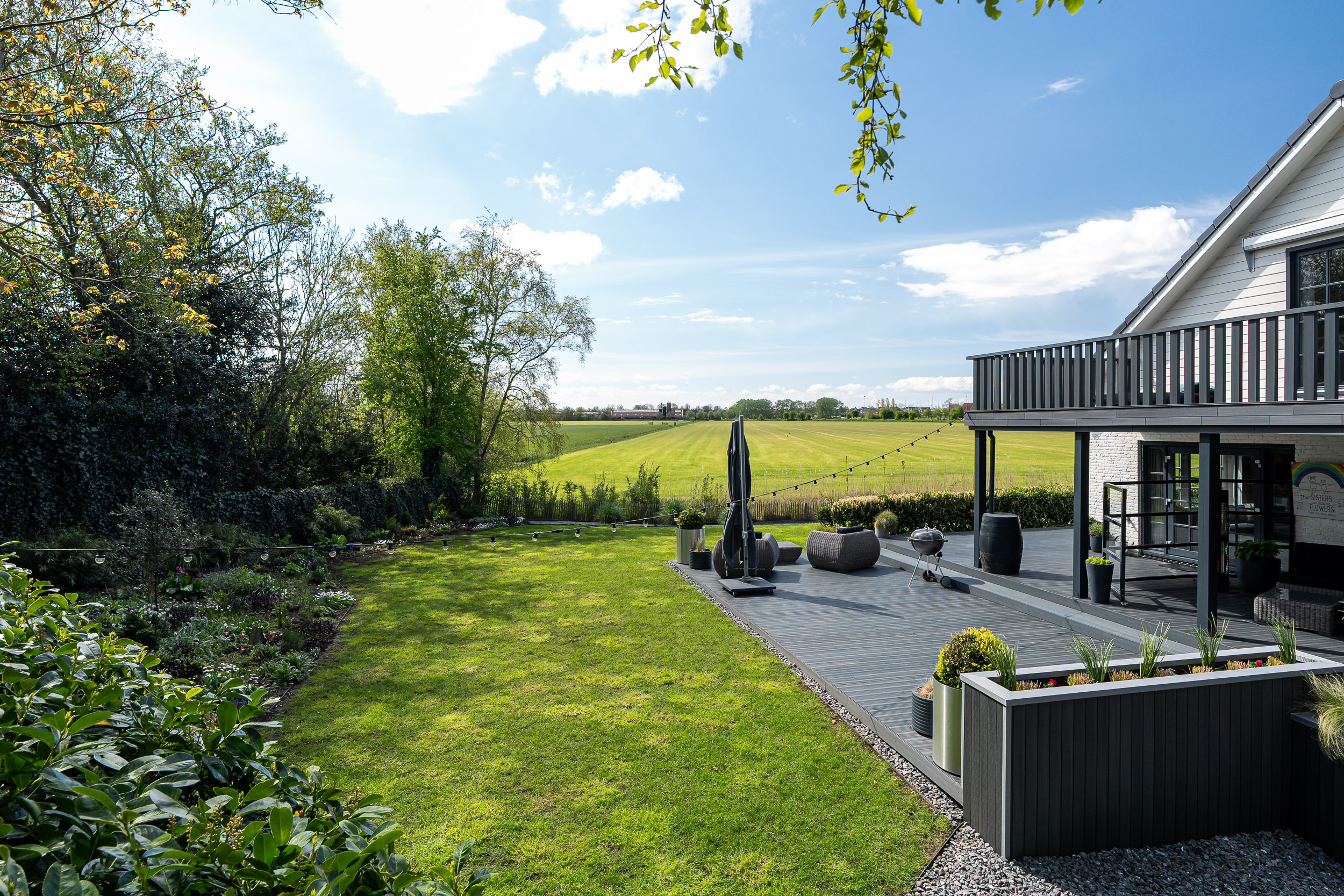 De onder architectuur aangelegde tuin met de robotmaaier is praktisch in onderhoud en speels aangelegd met diverse (fruit) boompartijen, hagen en rietkragen langs het water. De stijlvol aangelegde bestrating van de oprijlaan en toegangspoort accentueren de overgang naar de jaarrond groene tuin. Zowel het woonhuis als het gastenverblijf hebben het terras aan de zonkant waar je kunt genieten van de prachtige vergezichten over het Friese landschap en tot laat in de avond de meest spectaculaire zonsondergangen kunt zien.