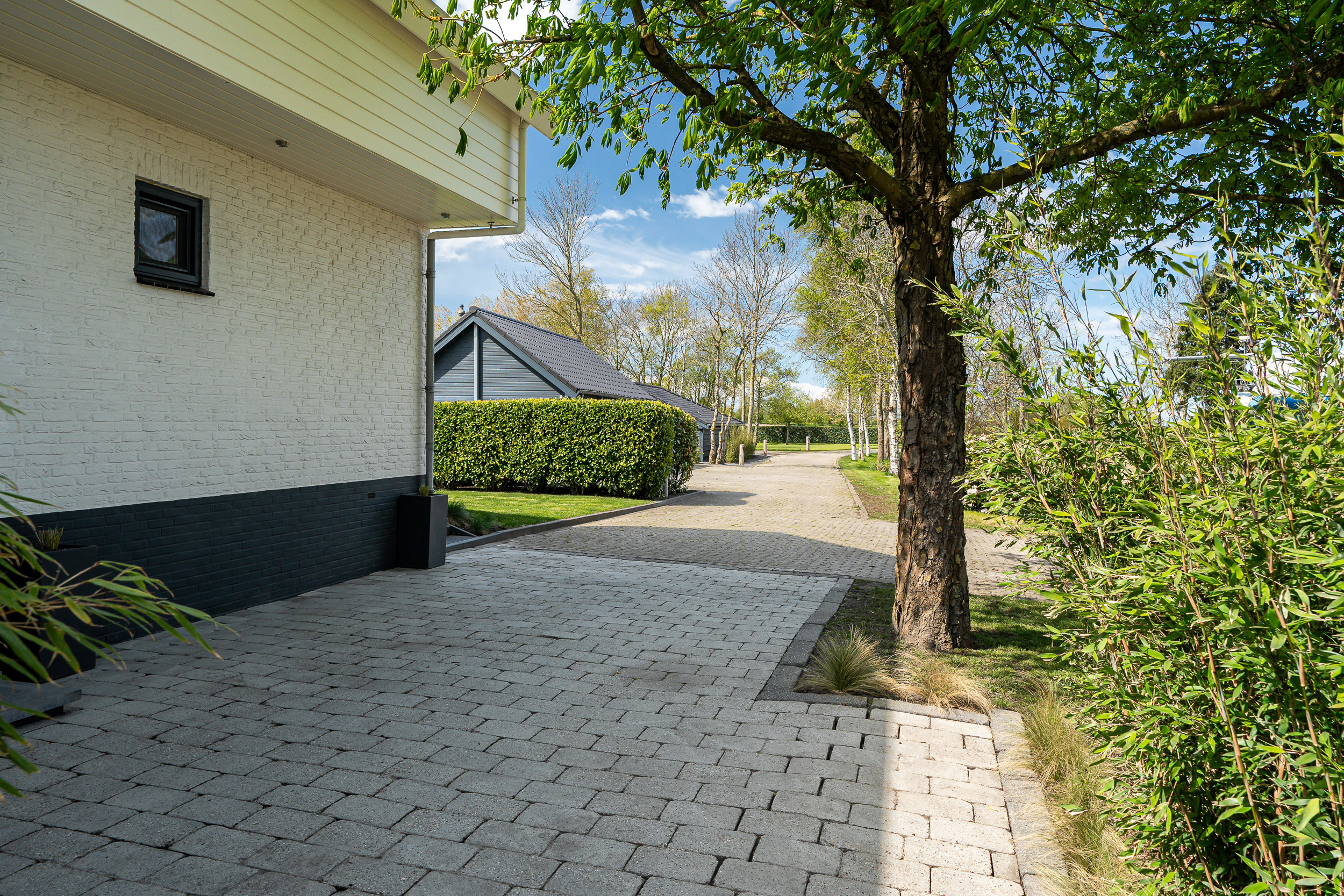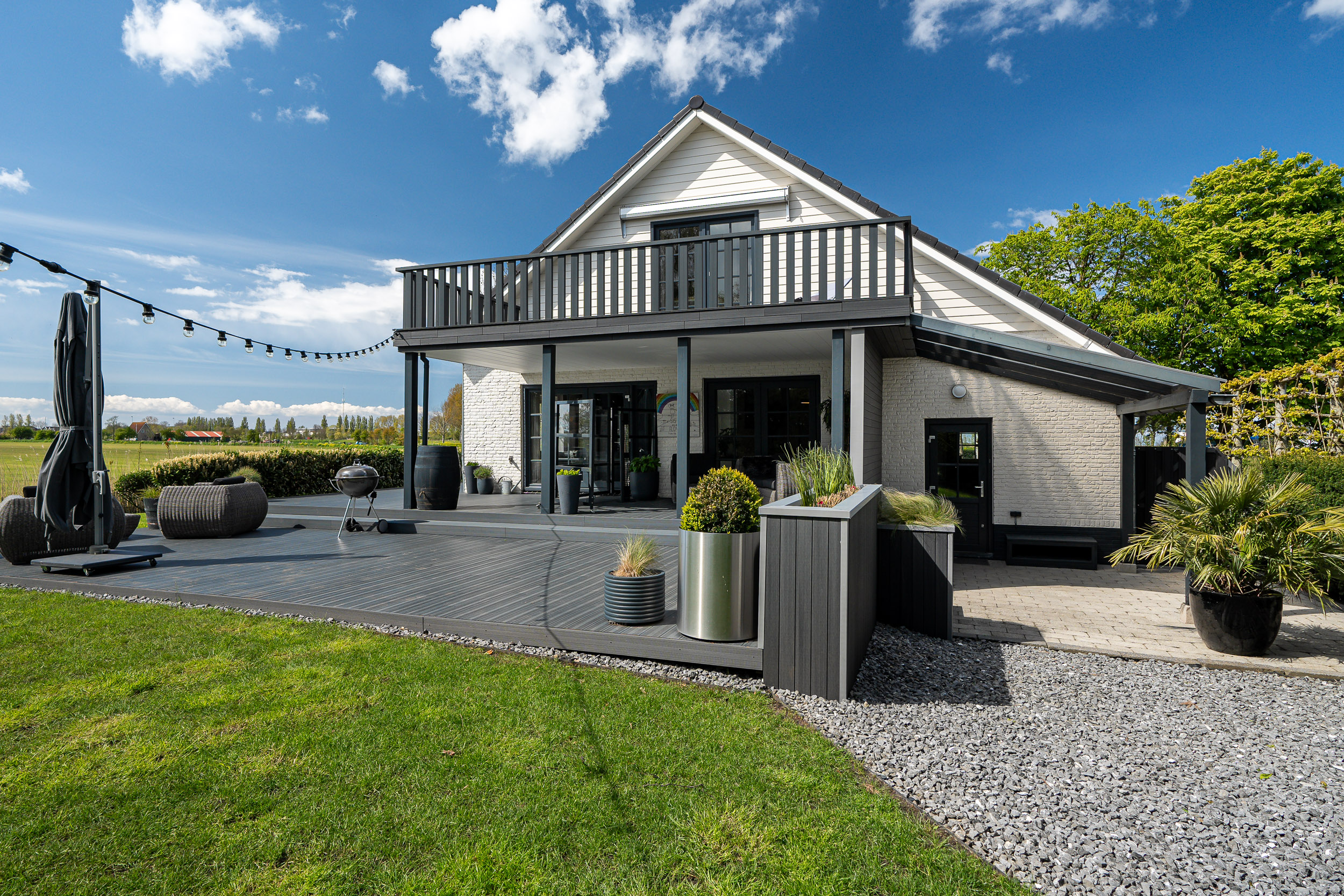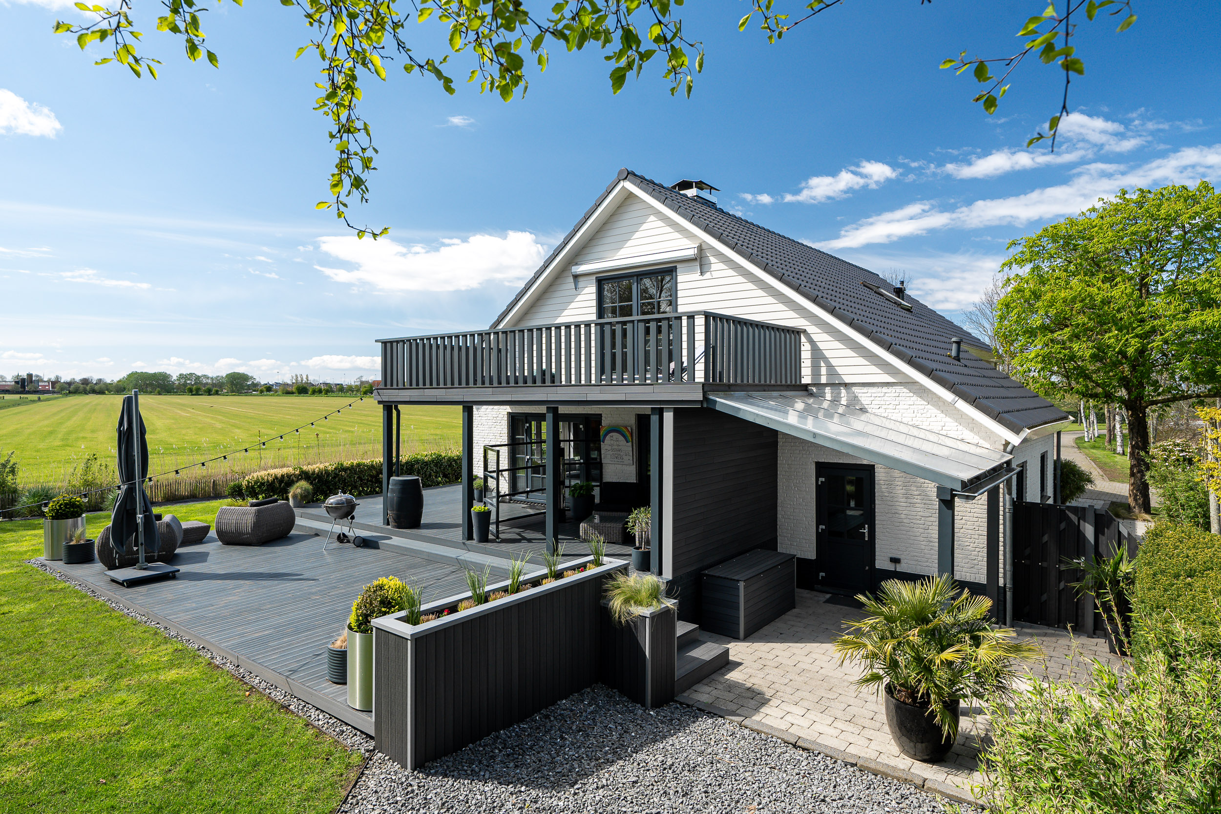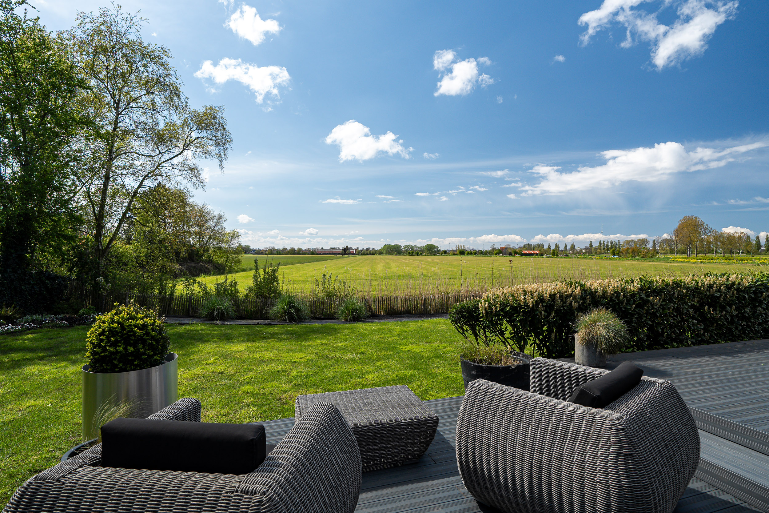 De onder architectuur aangelegde tuin met de robotmaaier is praktisch in onderhoud en speels aangelegd met diverse (fruit) boompartijen, hagen en rietkragen langs het water. De stijlvol aangelegde bestrating van de oprijlaan en toegangspoort accentueren de overgang naar de jaarrond groene tuin. Zowel het woonhuis als het gastenverblijf hebben het terras aan de zonkant waar je kunt genieten van de prachtige vergezichten over het Friese landschap en tot laat in de avond de meest spectaculaire zonsondergangen kunt zien.