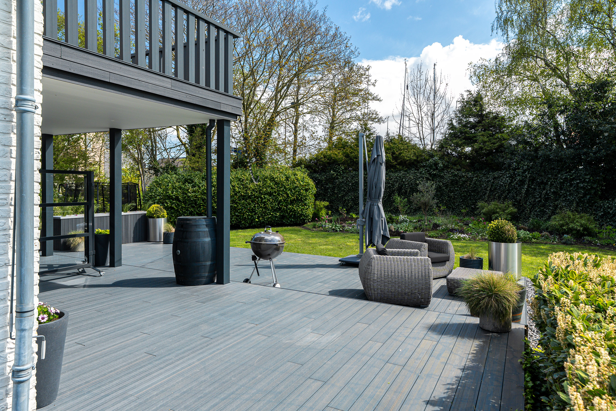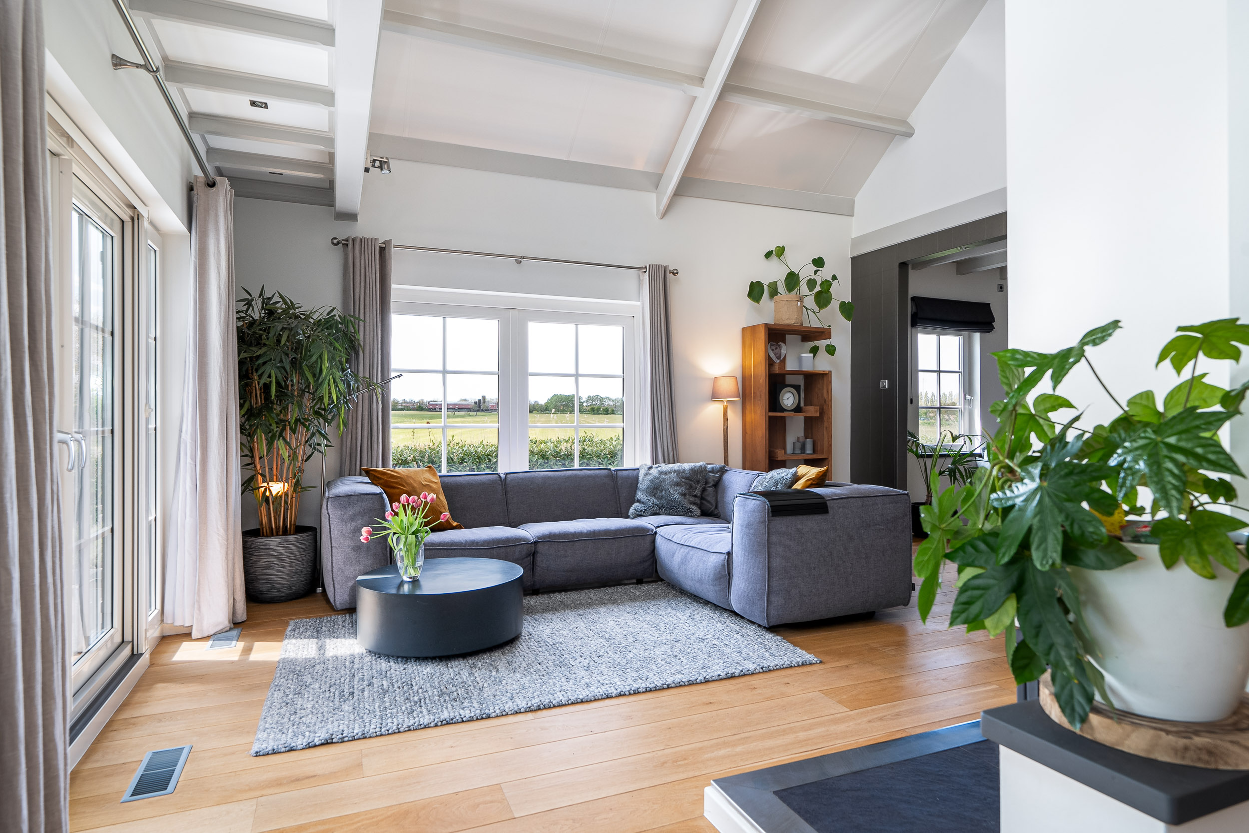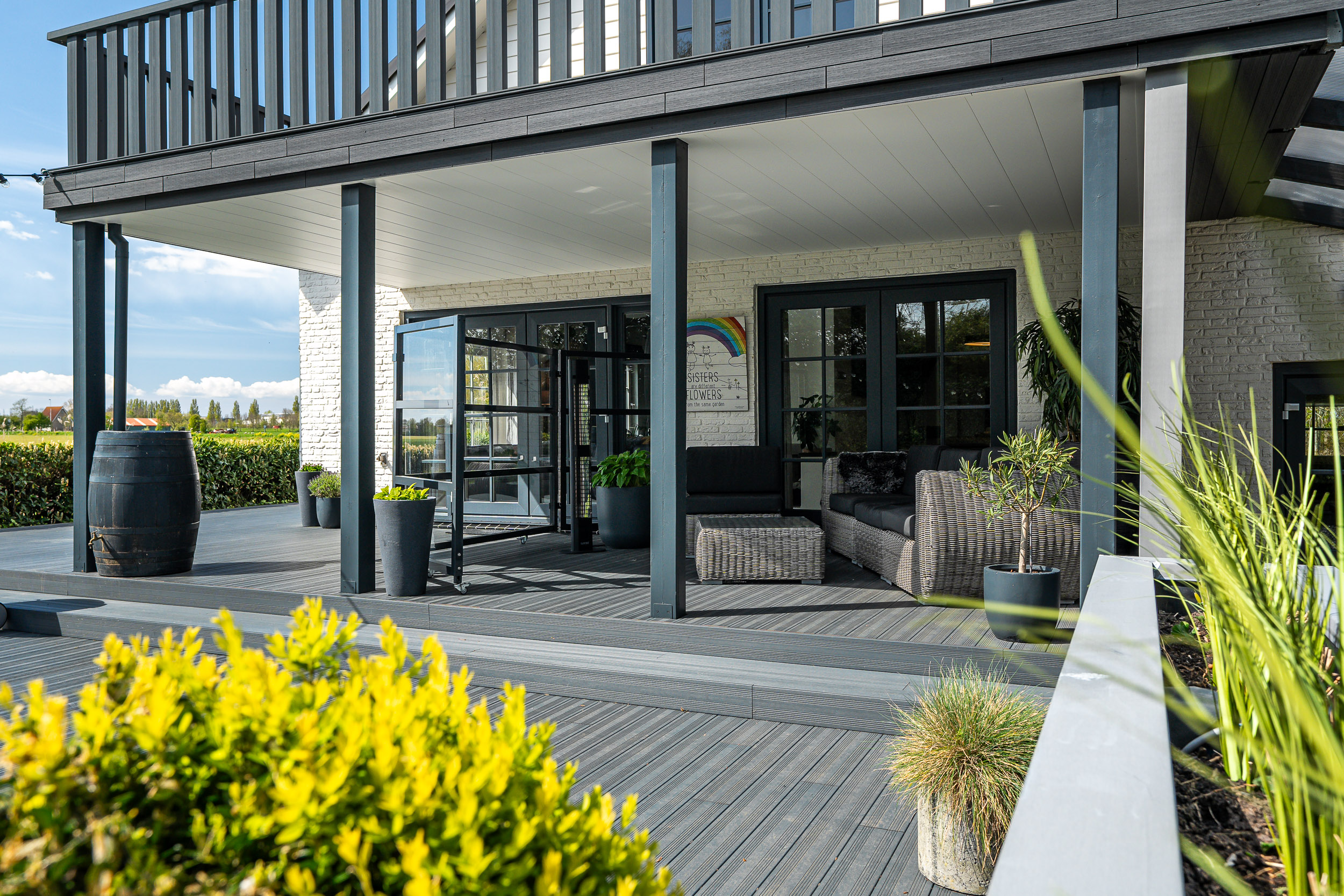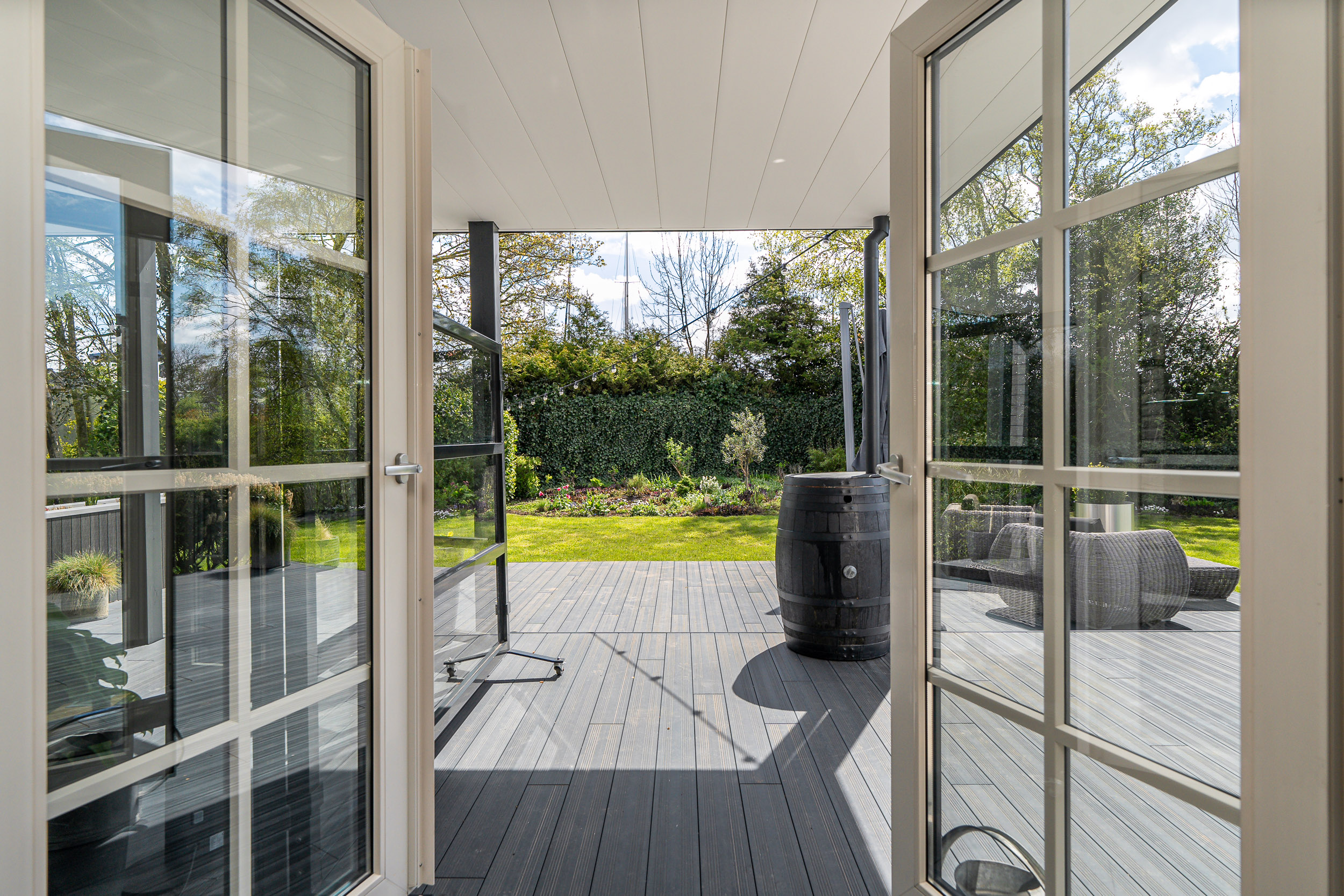 De onder architectuur aangelegde tuin met de robotmaaier is praktisch in onderhoud en speels aangelegd met diverse (fruit) boompartijen, hagen en rietkragen langs het water. De stijlvol aangelegde bestrating van de oprijlaan en toegangspoort accentueren de overgang naar de jaarrond groene tuin. Zowel het woonhuis als het gastenverblijf hebben het terras aan de zonkant waar je kunt genieten van de prachtige vergezichten over het Friese landschap en tot laat in de avond de meest spectaculaire zonsondergangen kunt zien.