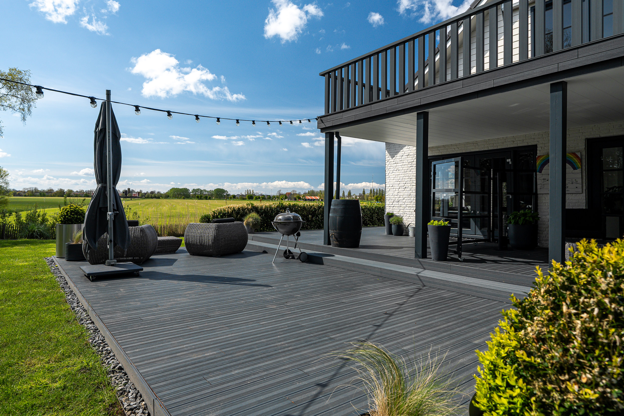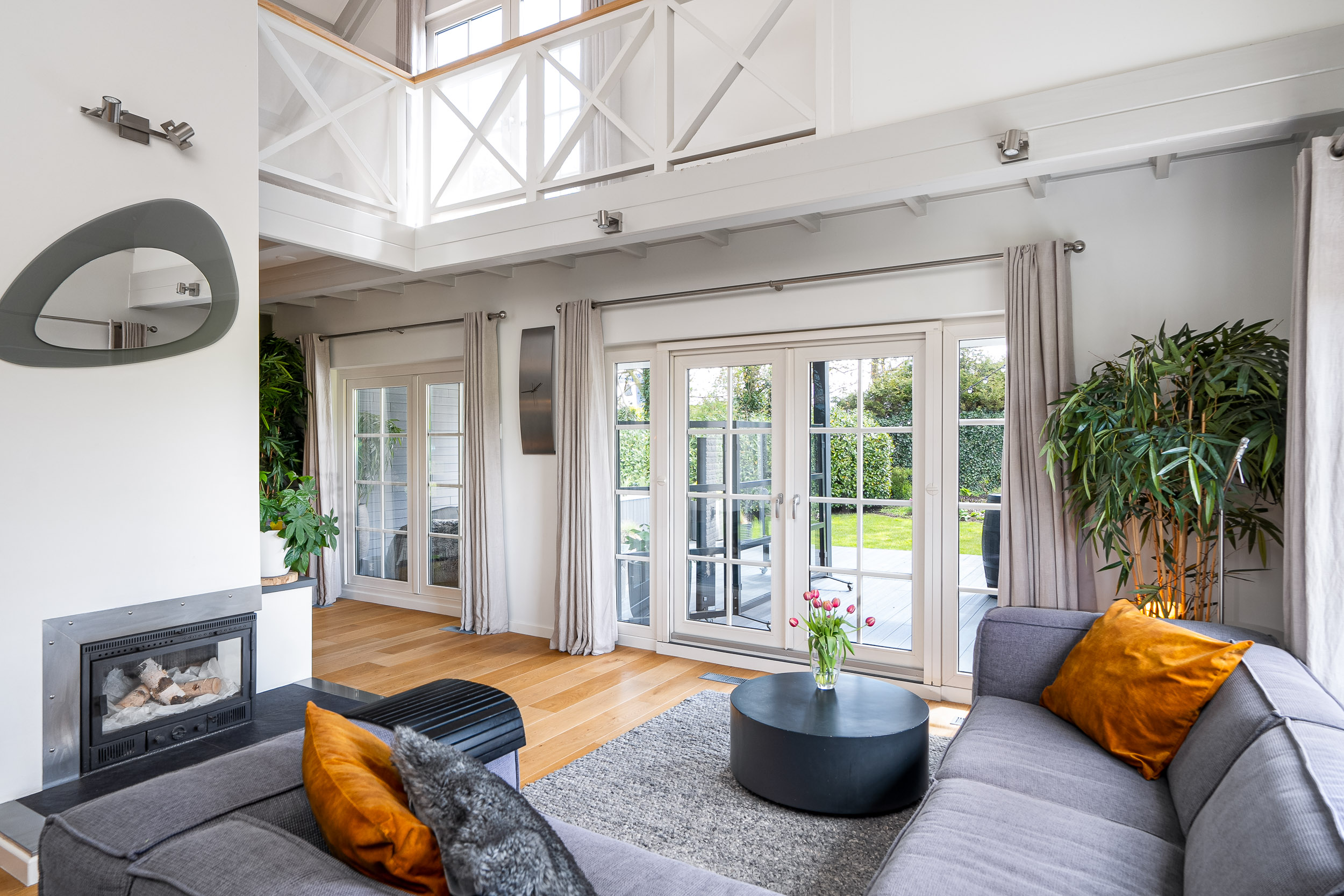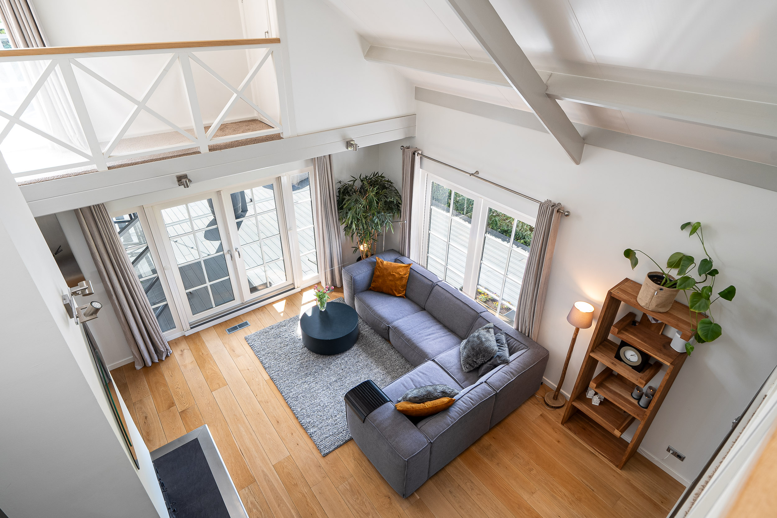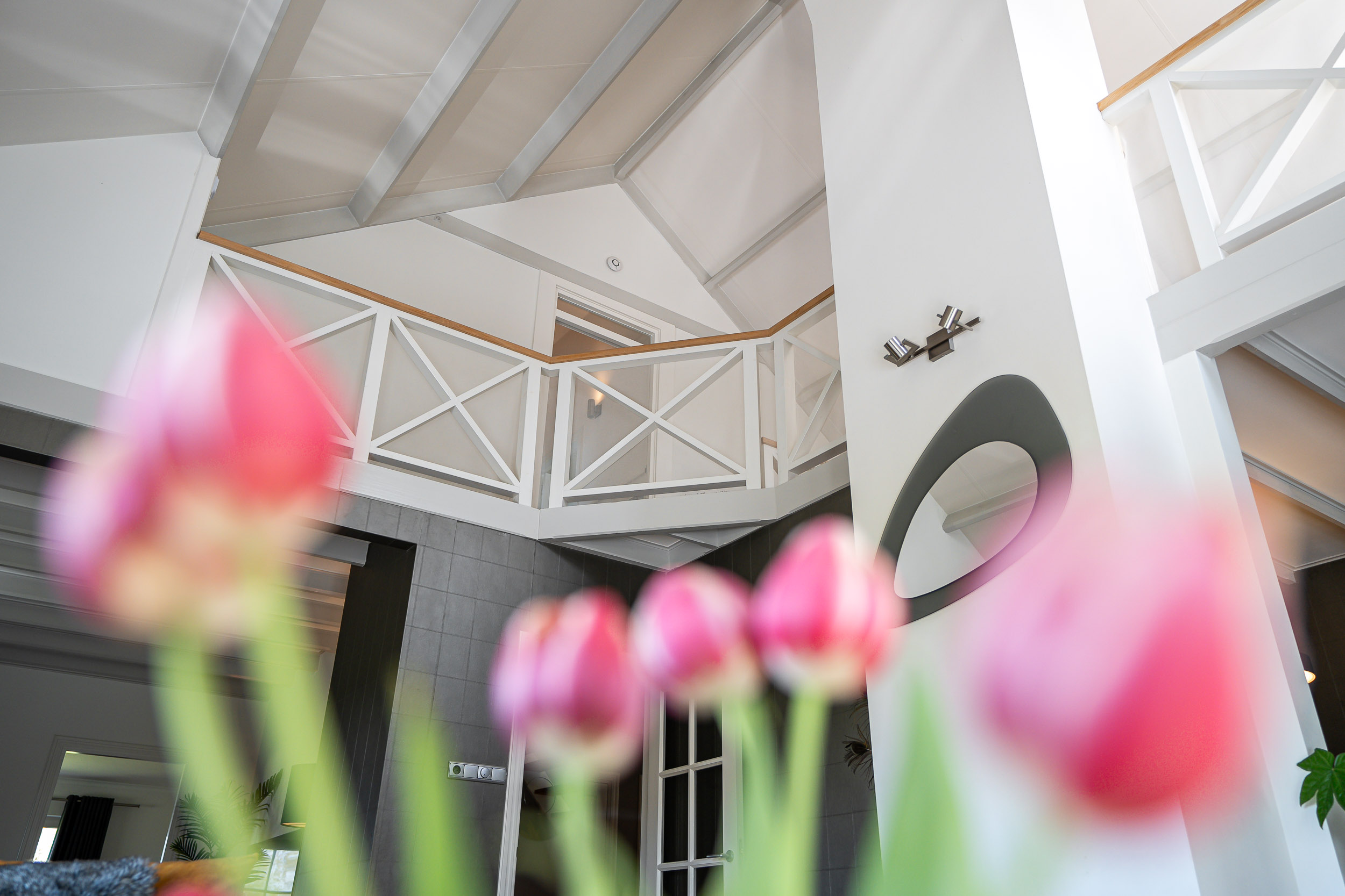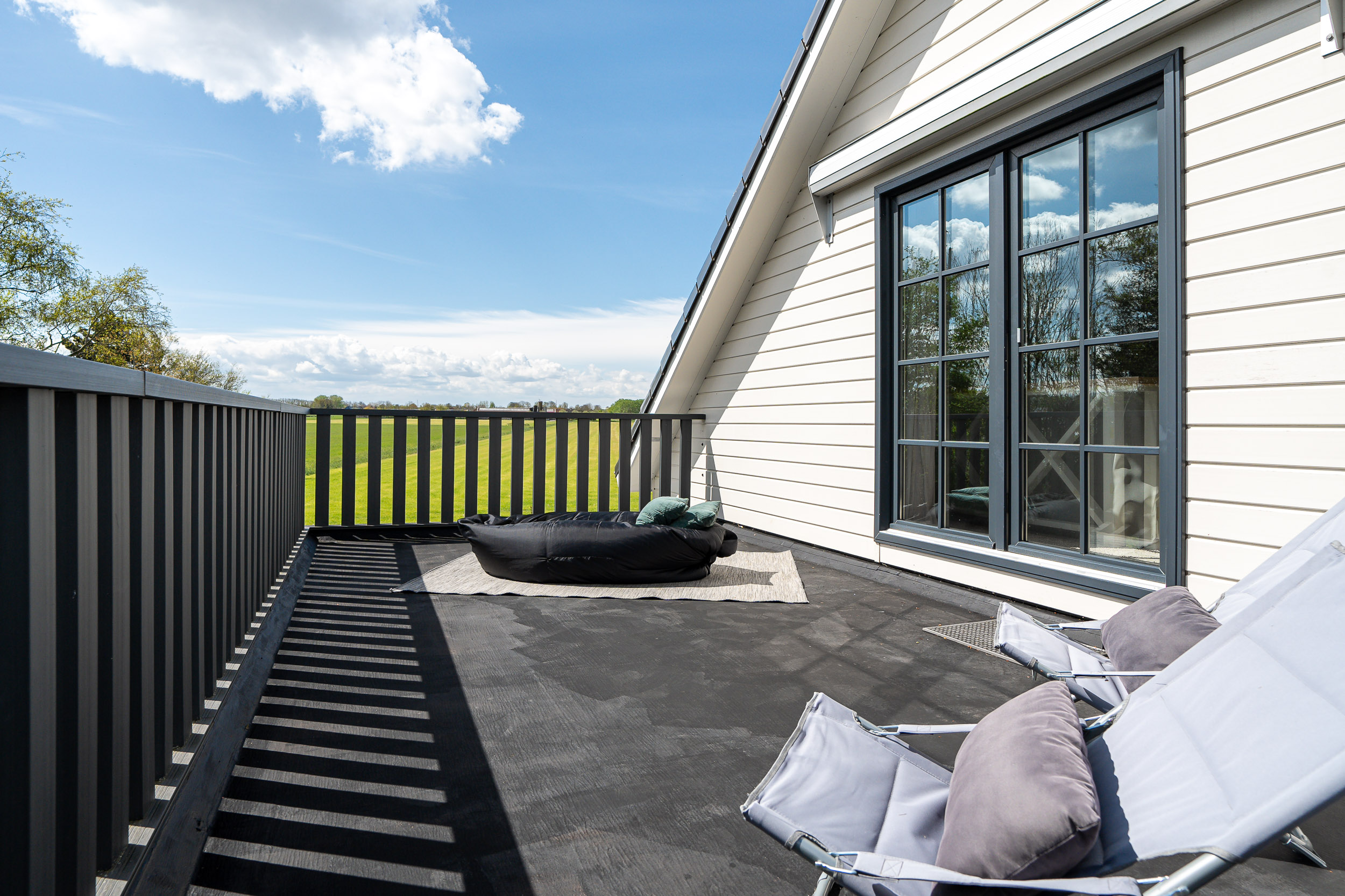 De overloop met vide kijkt uit op de woonkamer en heeft openslaande deuren naar een riant zonneterras (balkon) op het zuiden. Een geweldige plek om de mooiste zons-opgang en -ondergang te beleven. Ook hier voel je volledig privé door de beschutting van de tuin. De vide biedt voldoende plaats voor een gezellige speelhoek, werkplek of bibliotheek.