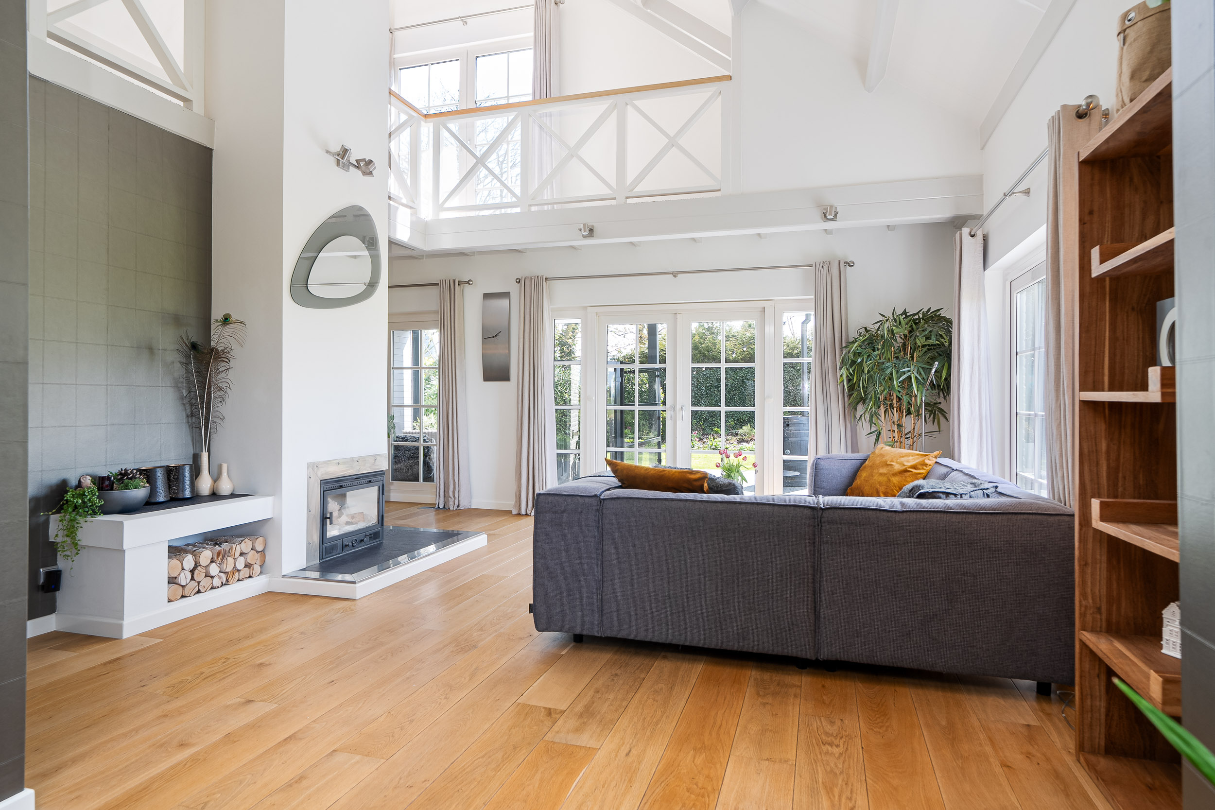 De woonkamer krijgt door de vele raampartijen en de vide veel licht en het uitzicht door elk raam is gefocust op de natuur. De adembenemende vergezichten vervelen hier nooit. De woonkamer heeft diverse sfeerhoeken als een zithoek rond de houthaard, een entertainment hoek en een eethoek. Er ligt een prachtige warme houten vloer voorzien van hete lucht verwarming en de openslaande tuindeuren geven direct toegang tot de gezellige veranda en het terras dat rondom alle privacy biedt.
