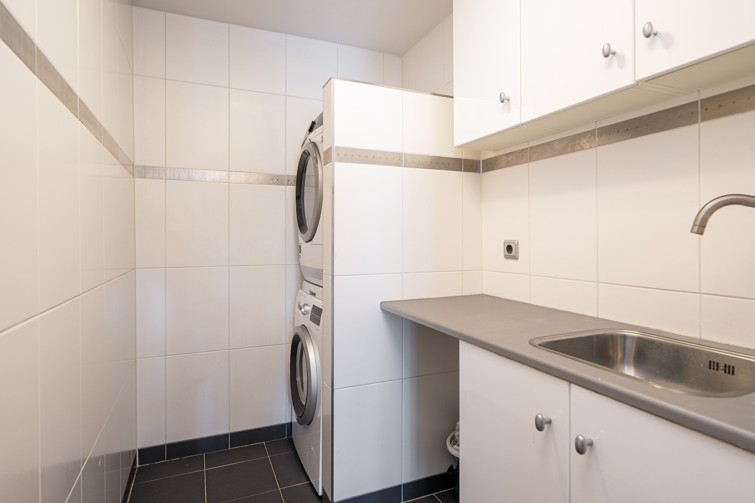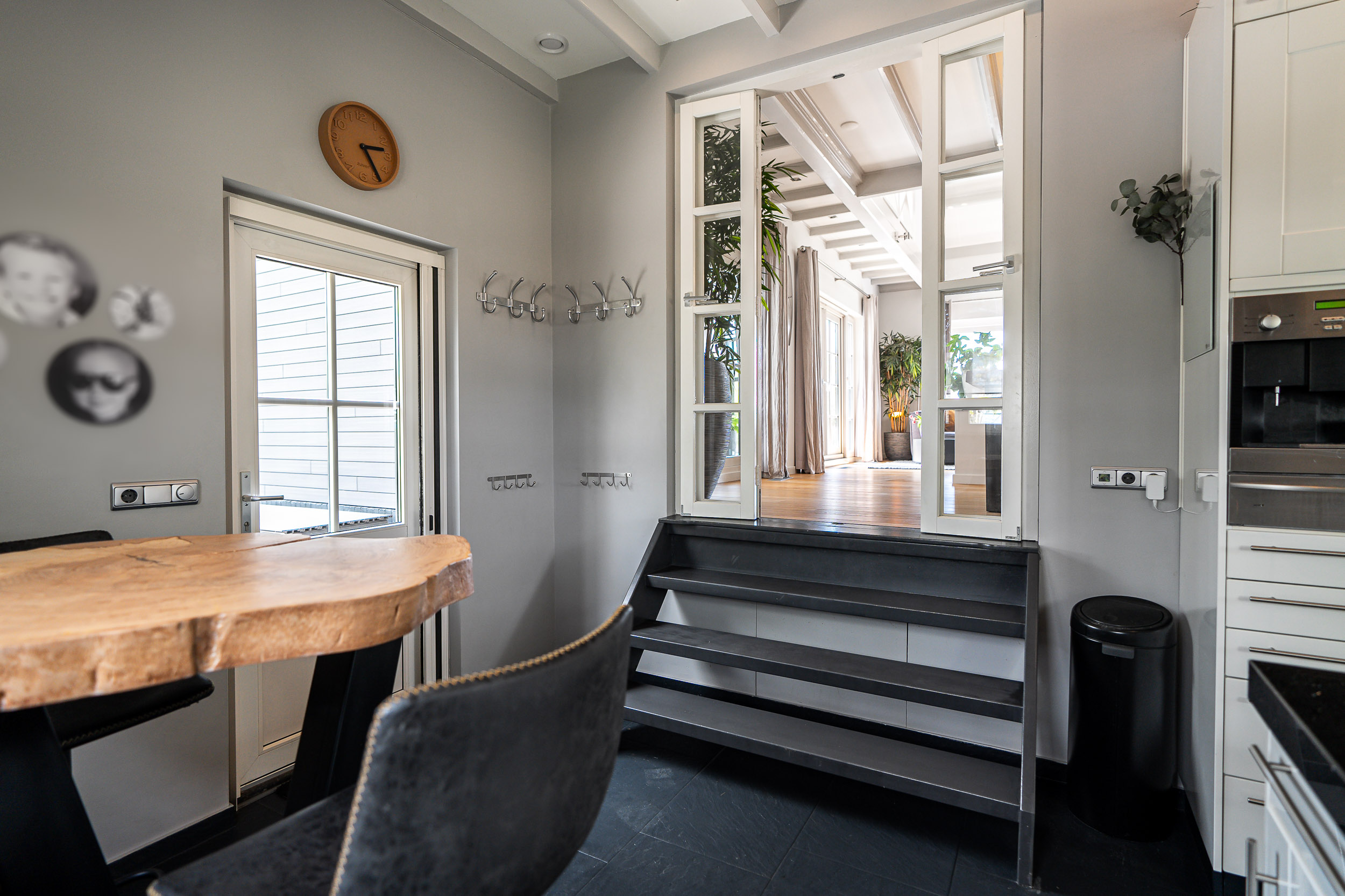 Direct bij het betreden van de woning is het ruimtelijk effect in de hal al voelbaar. Deze geeft toegang naar het gastentoilet, de bijkeuken, de meterkast en de trapopgang.