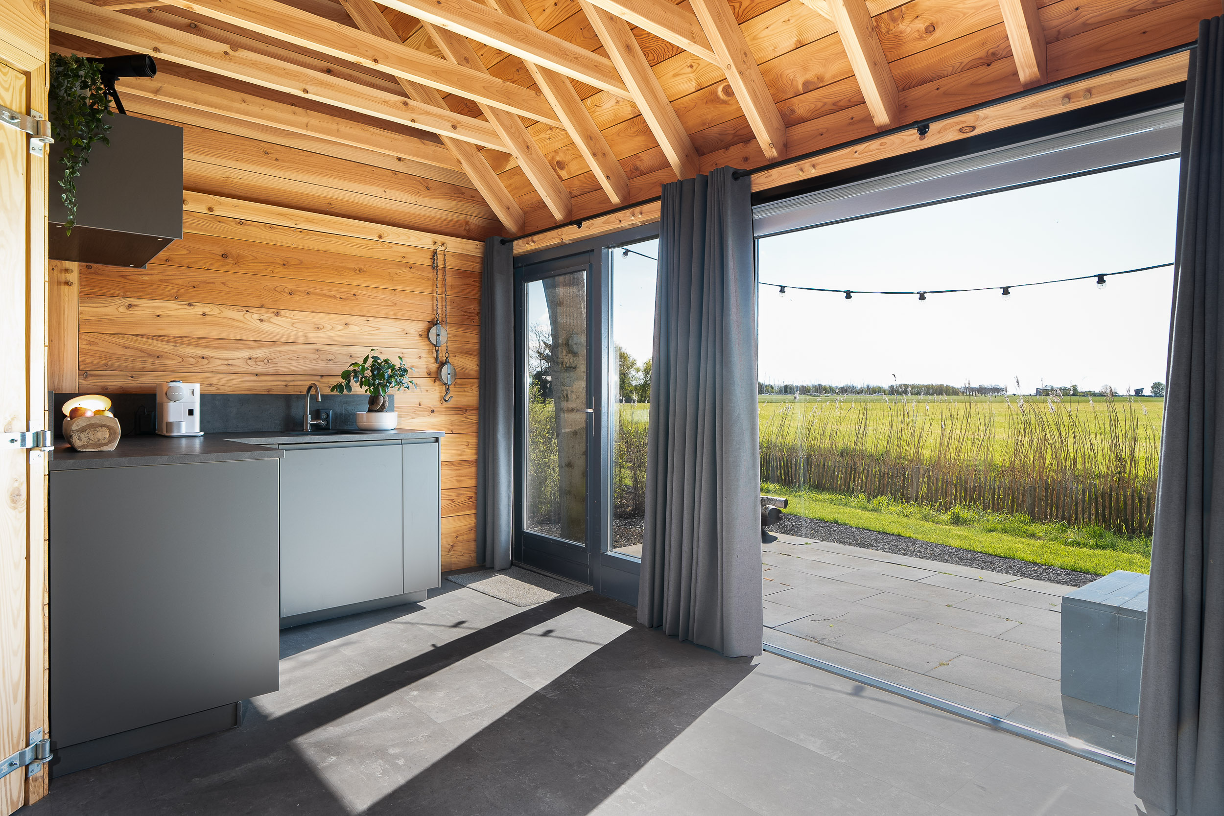 Recentelijk is in de tuin een volledig geïsoleerd gastenverblijf/atelier/thuiskantoor gebouwd. Deze beschikt over een kitchenette- en badkamerruimte waardoor het voor verschillende doeleinden gebruikt kan worden. De op het zuidwesten gerichte extra grote raampartijen van dit verblijf bieden inspirerende vergezichten op de natuur richting het IJsselmeer met de steeds veranderende Friese luchten.
