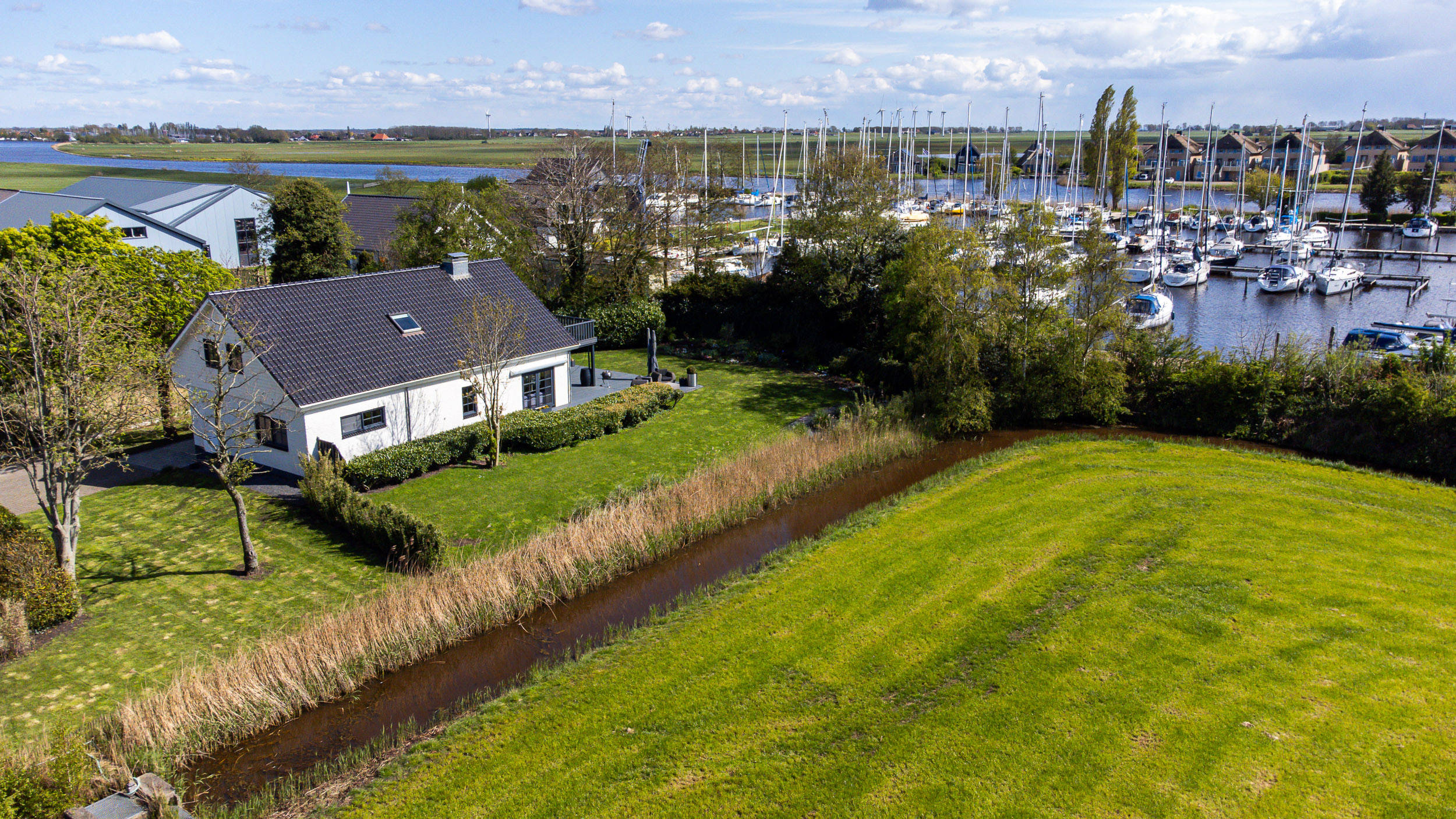 Op een toplocatie nabij het IJsselmeer naast een jachthaven met toegang naar alle waterwegen in Friesland, is deze in 2004 volledig vernieuwde villa gelegen op een omheind royaal perceel met alle privacy en prachtige Friese vergezichten. De rust, de natuur, het water, de steeds veranderende luchten en het gevoel van vrijheid zijn hier wel de speerpunten. Deze ruime goed geïsoleerde villa van 245m2 biedt levensloopbestendig wonen heeft een royale living, 4 slaapkamers, 2 badkamers een luxe keuken met bijkeuken en een prachtige veranda met vergezichten. Ook biedt de dubbele garage met verdieping, een zee aan ruimte en mogelijkheden. Het volledig geïsoleerde thuiskantoor/atelier of gastenverblijf met het geweldige uitzicht op de natuur is een inspiratiebron op zich. De onder architectuur aangelegde tuin met de robotmaaier is praktisch in onderhoud en speels aangelegd met diverse (fruit) boompartijen, hagen en rietkragen langs het water. De stijlvol aangelegde bestrating van de oprijlaan en toegangspoort accentueren de overgang naar de jaarrond groene tuin.