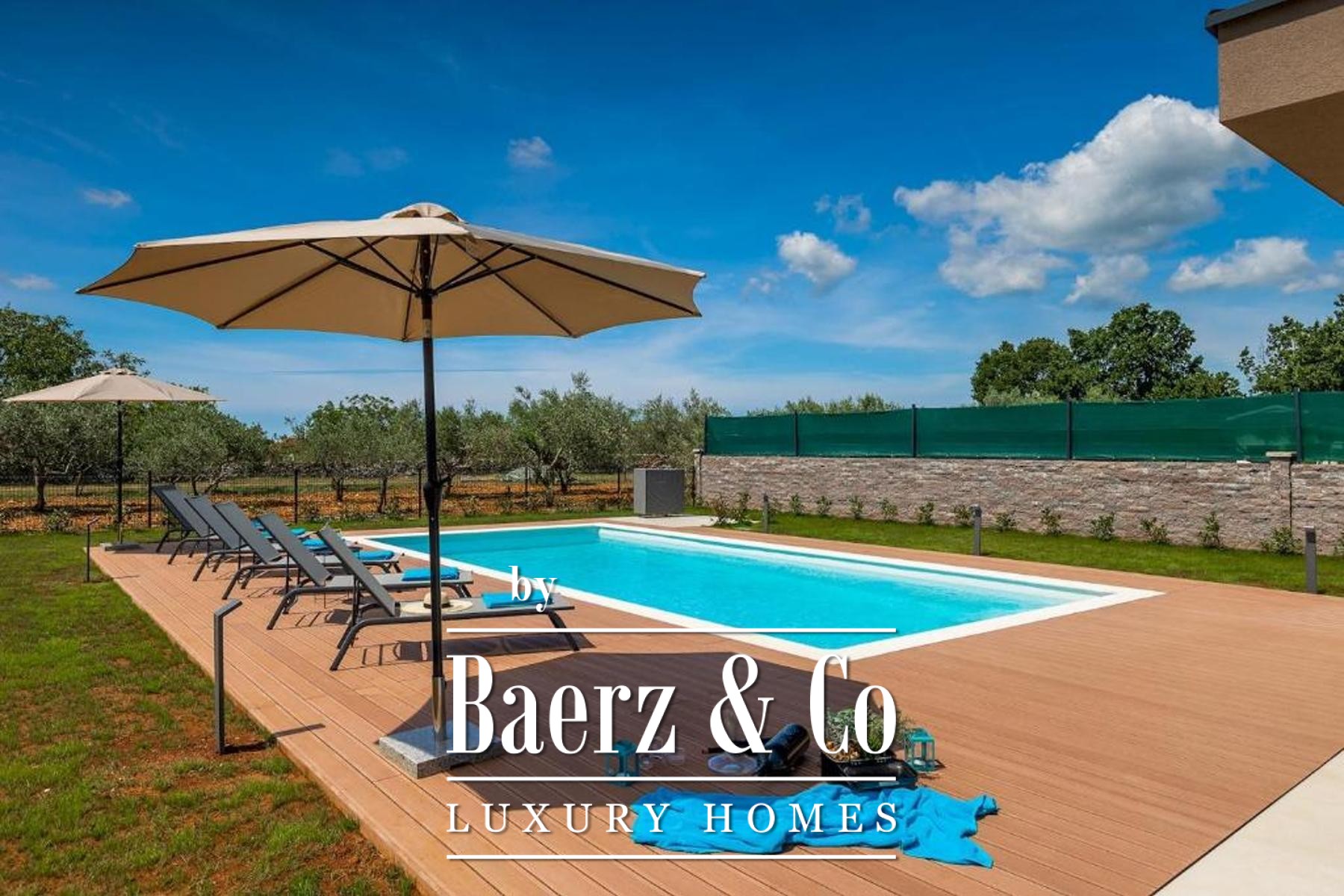 Buiten nodigt een volledig omheinde tuin uit tot ontspanning, met als middelpunt een verwarmd zwembad van 50 m² afgewerkt met keramische tegels en omzoomd door een rustige zonneweide. Moderne verwarmings- en koelsystemen garanderen jaarrond comfort, of het nu gaat om een permanente woning, een vakantieverblijf of een luxe villa te koop in Svetvinčenat. De omgeving, zowel natuurlijk als architectonisch, weerspiegelt een keuze voor privacy, kwaliteit en de ontspannen elegantie van het Istrische leven.