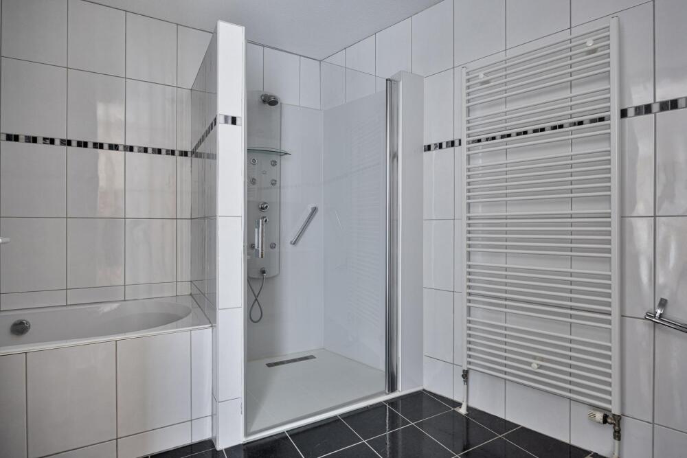 betegelde badkamer, voorzien van een ligbad, douchecabine met jets en massagepaneel voorzien van een lage instap, toilet, badkamermeubel met een dubbele wastafel en een designradiator;