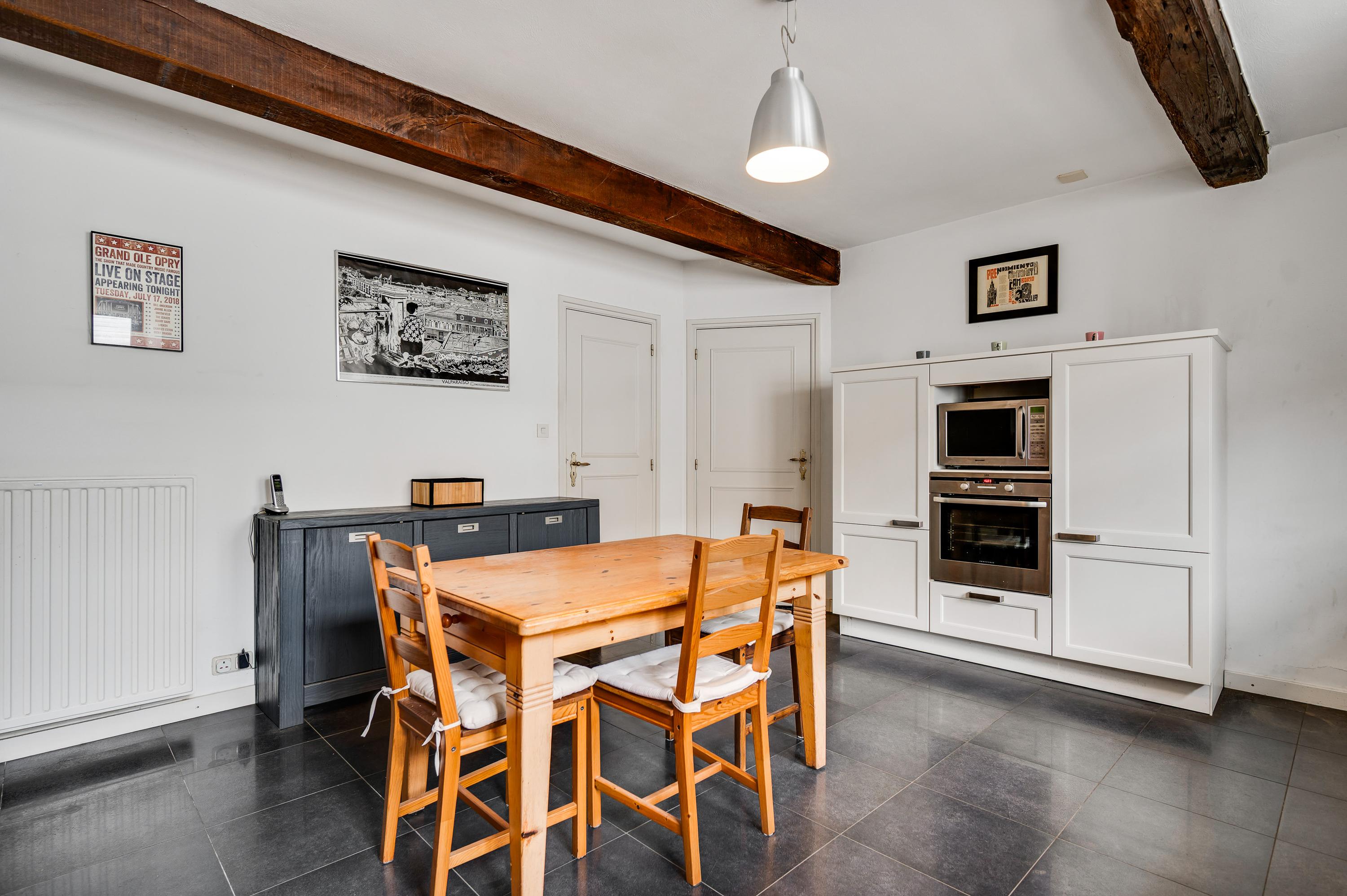 De royale woonkeuken (± 21 m²) is een droom voor iedere kookliefhebber. Deze luxe aanbouwkeuken in lichte tinten is volledig uitgerust met koelkast, 6-pits kookplaat, oven, magnetron, afzuigkap en vaatwasser. Hier geniet u met gemak van heerlijke maaltijden. De keukenvloer is afgewerkt met dezelfde fraaie tegels als in de woonkamer.