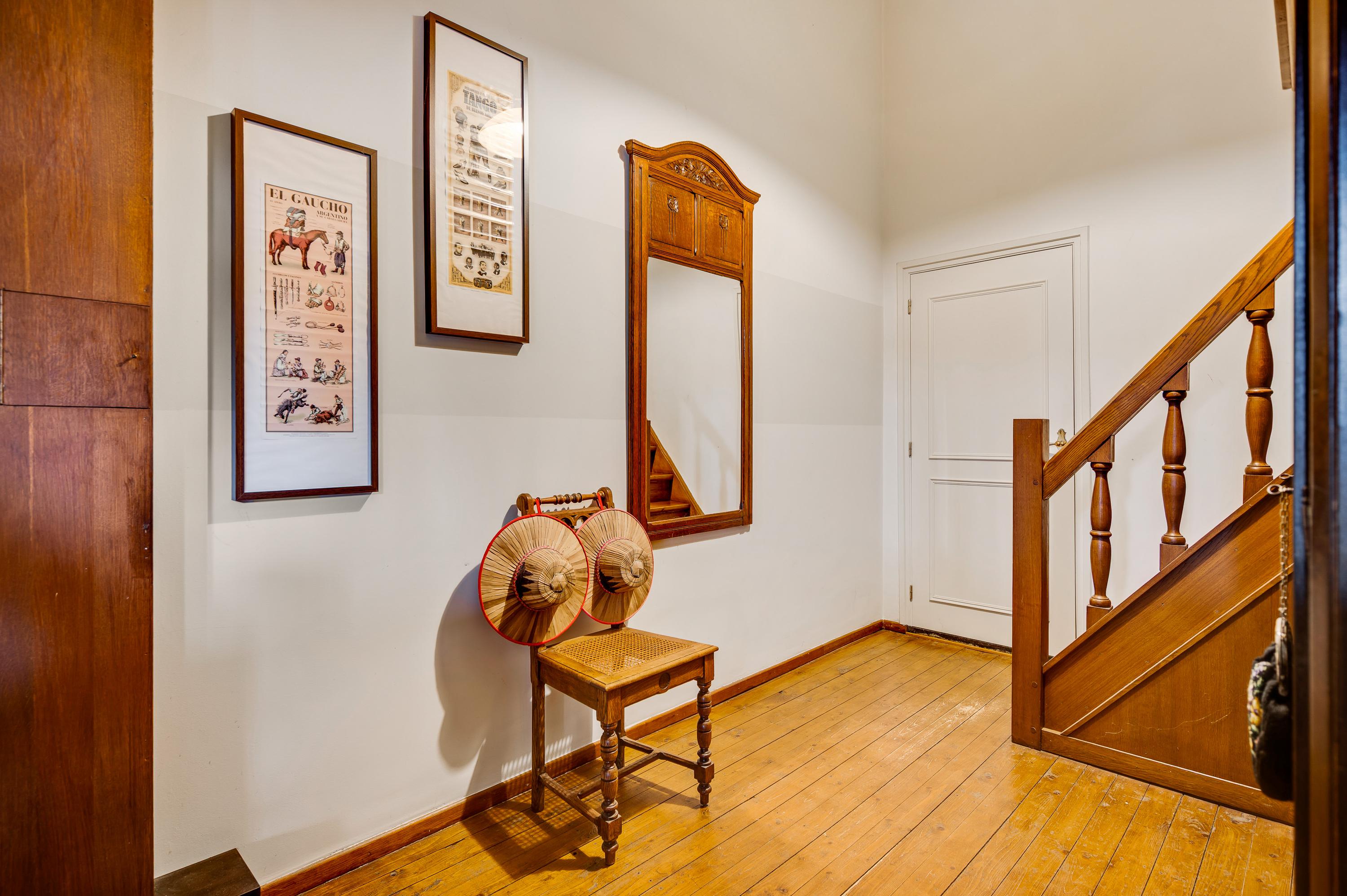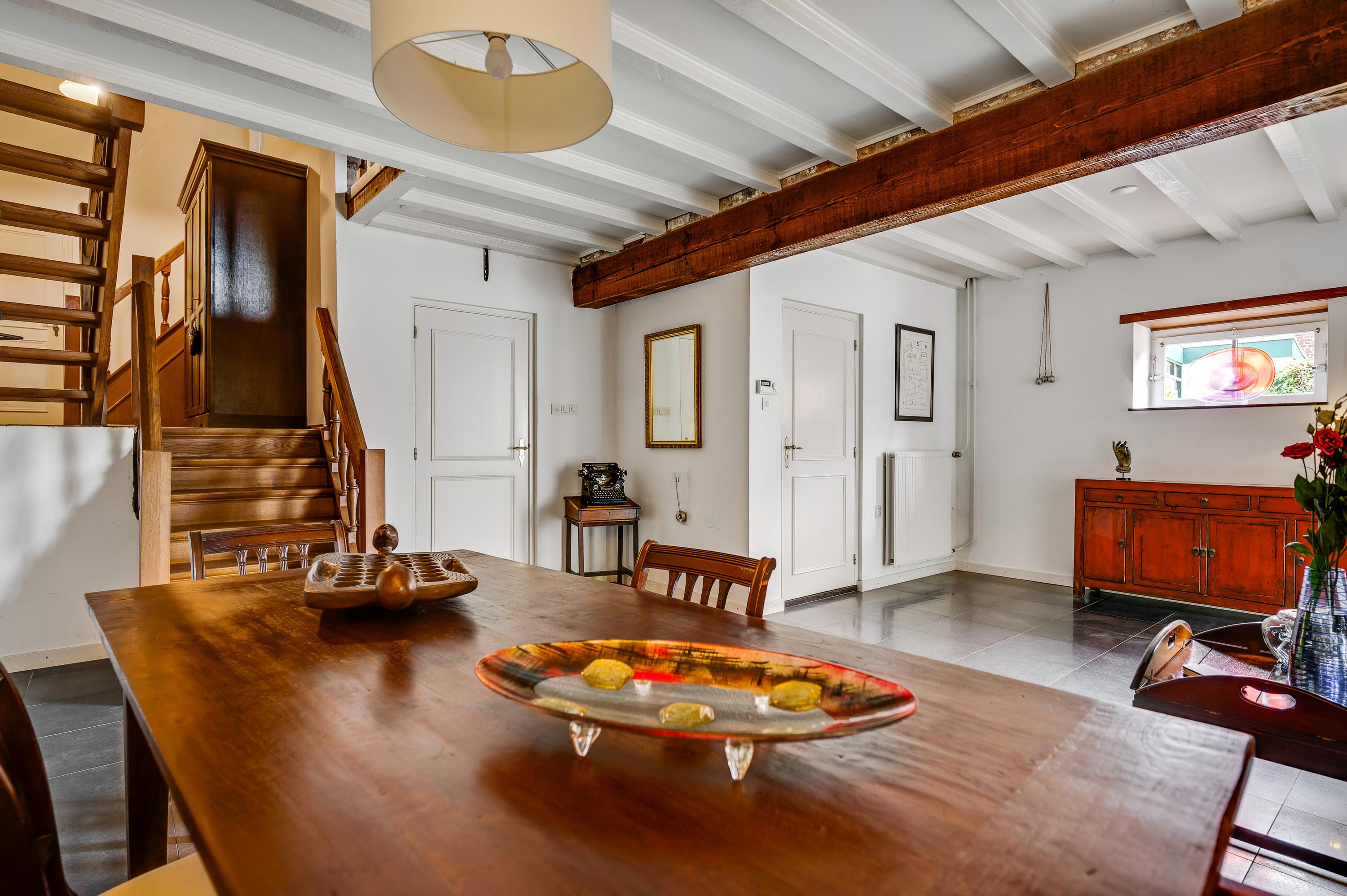 De royale hal met schouw en meterkast geeft toegang tot de toiletruimte, een slaapkamer met aparte badkamer en de keuken. Vanuit de hal bereikt u ook de trap naar de eerste verdieping. De hal is tevens de voormalige zitkamer van de B&B. Deze ruimte kan dienst doen voor verschillende doeleinden.