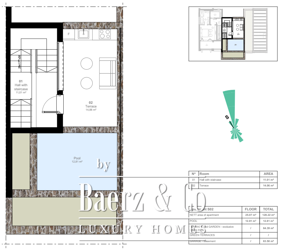 The townhouse has 4 levels. It has a pool that is on the top of the house. The house has a garage spot. It is connected by an asphalt road to the main road.