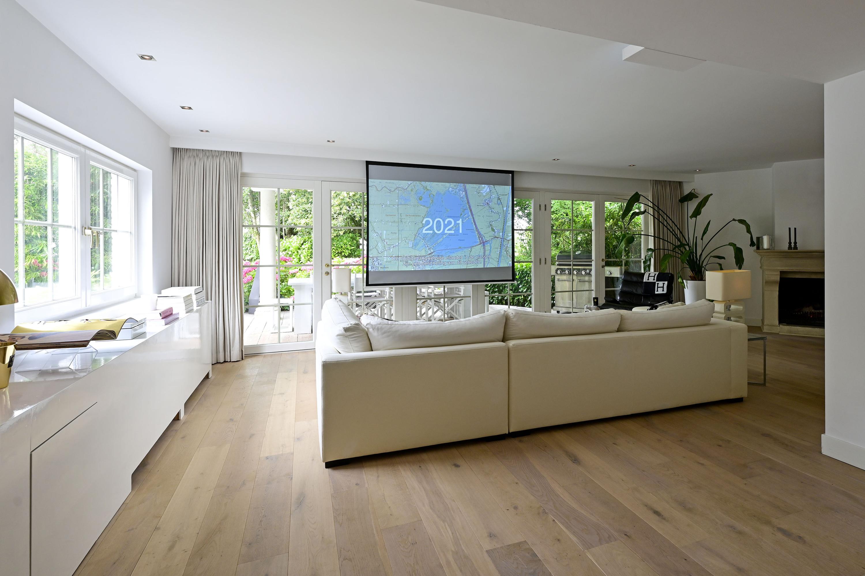 De woonkamer is stijlvol ingericht met open haard, diverse zitjes, een ruime eetkamer en een ingebouwde beamer voor een echte thuisbioscoopervaring. Er is tevens een modern kantoor met elegante taatsdeuren, perfect voor wie in stijl wil thuiswerken.