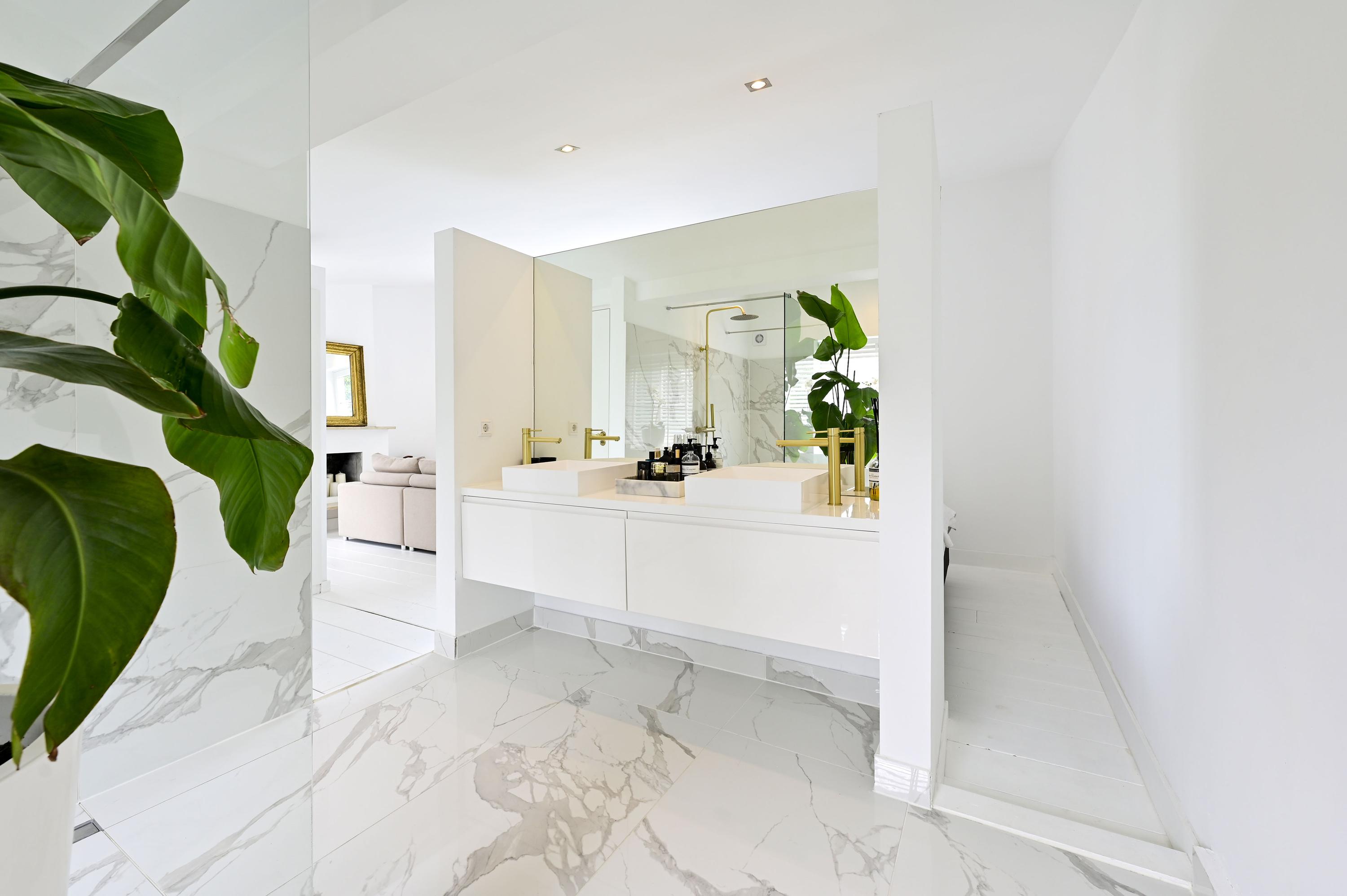 De villa telt drie ruime slaapkamers, elk met een eigen badkamer en suite – inclusief een indrukwekkende master suite op de bovenverdieping met walk-in closet en loungehoek. Deze ruimte is desgewenst op te splitsen in twee aparte slaapkamers.