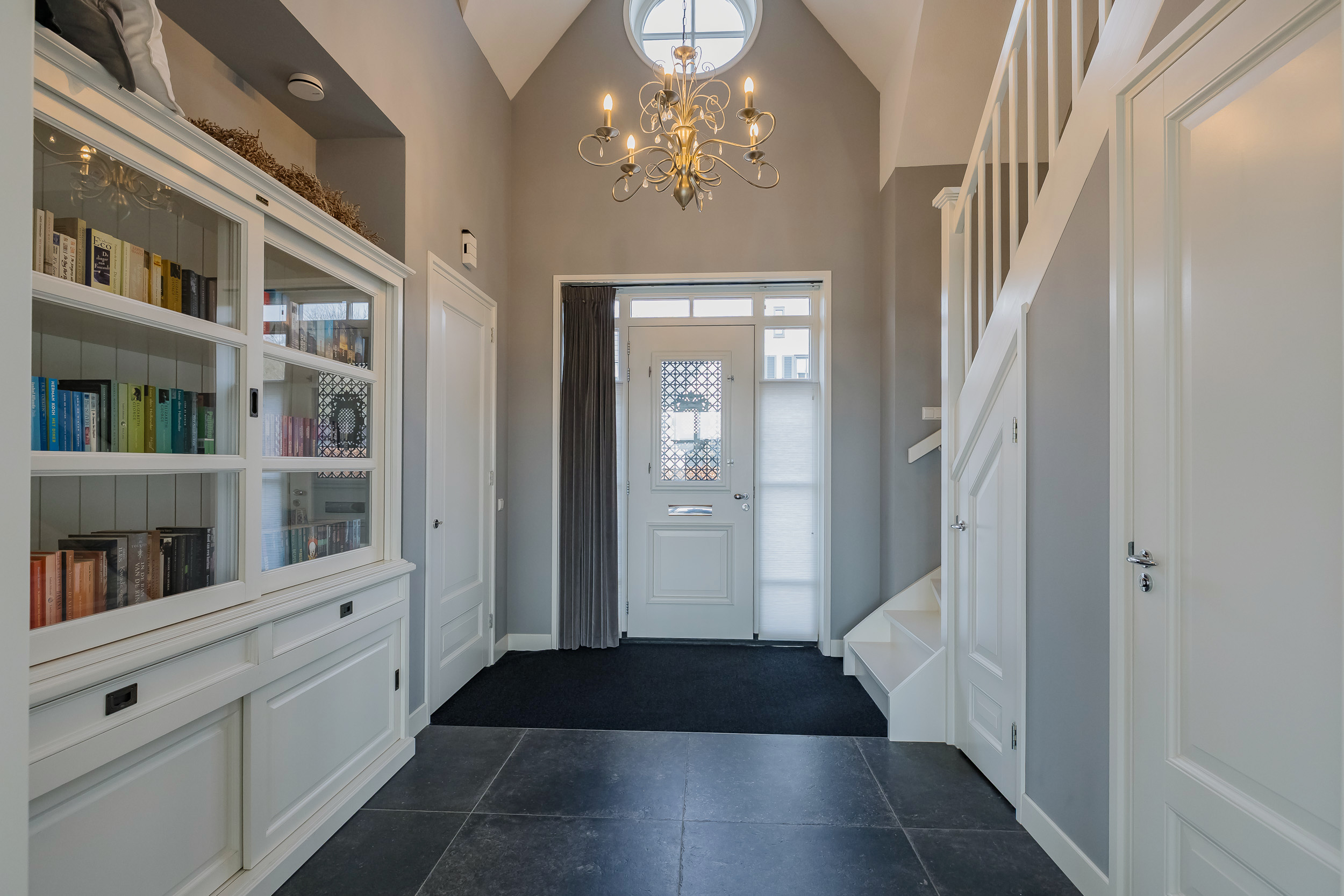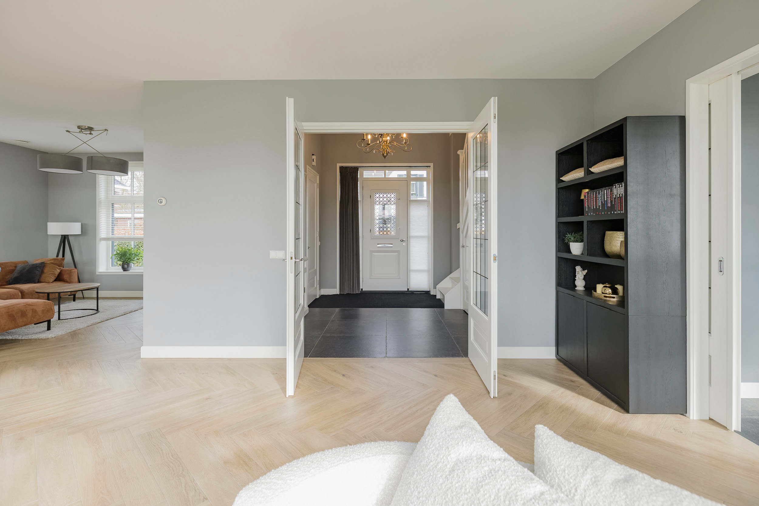 Zodra je binnenkomt, ervaar je de rust en het hoogwaardige afwerkingsniveau. De imposante hal met vide geeft toegang tot de royale woonkamer. Overal zie je de strakke ton-sur-ton afwerking in grijstinten gecombineerd met veel wit, wat zorgt voor een lichte en moderne uitstraling.