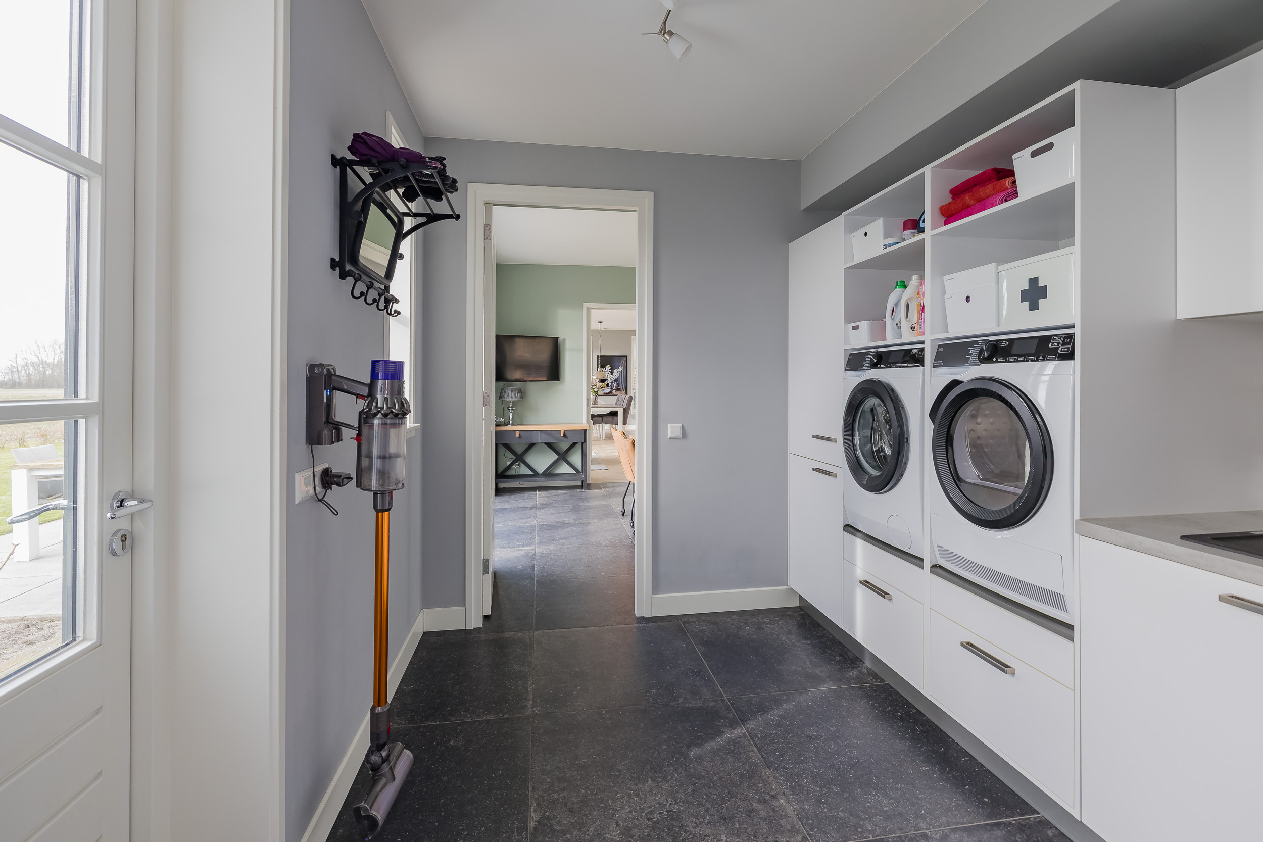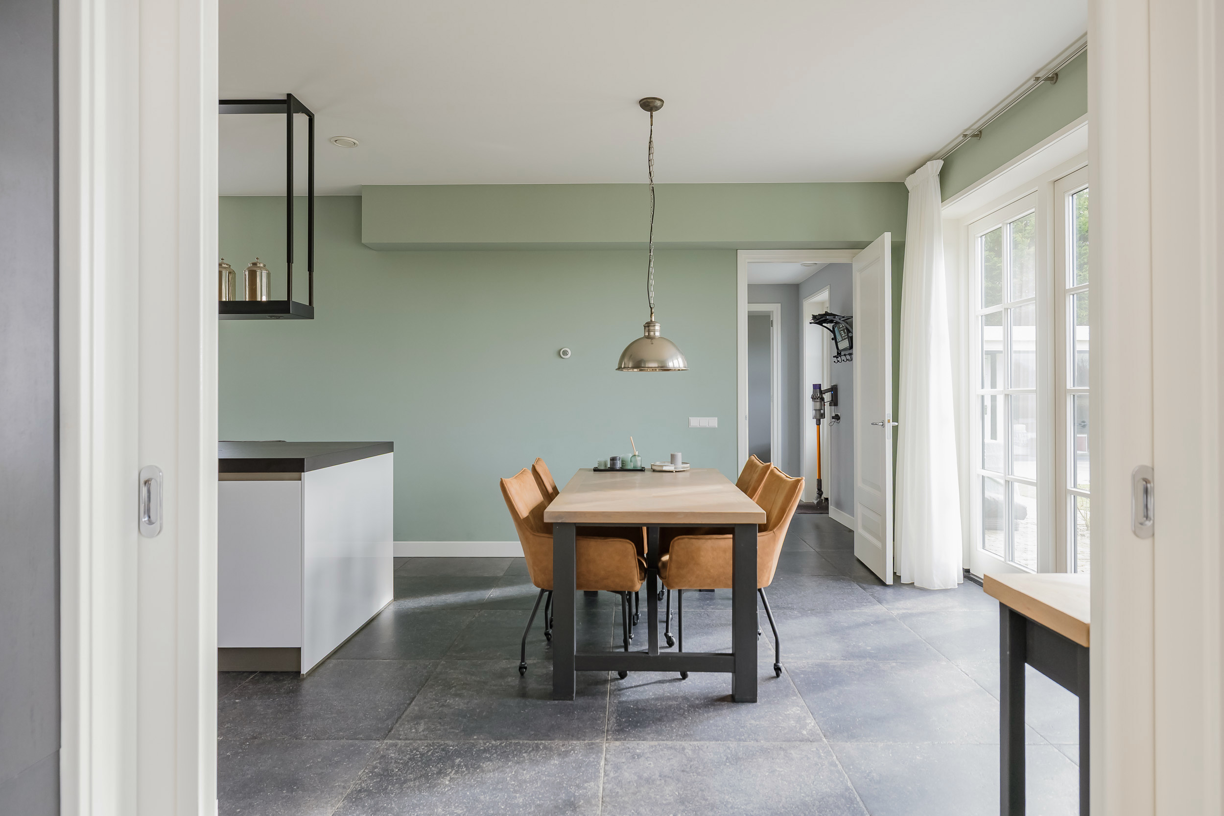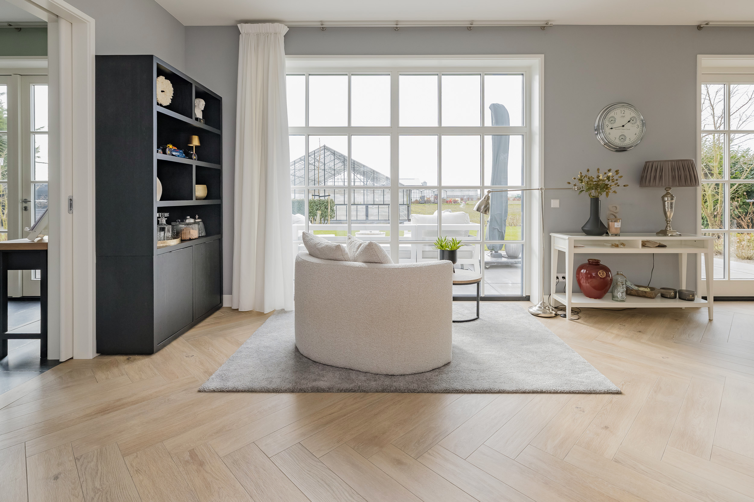 De woonkamer is ruim en licht dankzij de grote ramen met witte roedeverdeling en openslaande deuren naar het terras en de tuin rondom. Op de grond ligt een stijlvolle lichte tegelvloer. Aan de achterzijde geniet je van een fantastisch vrij uitzicht over de bollenvelden.