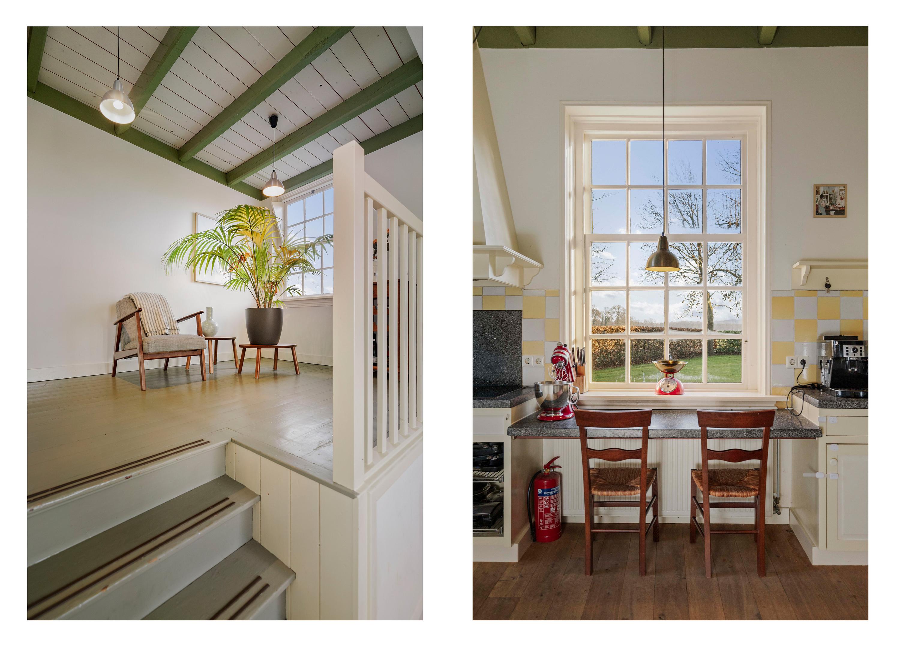De met grind verharde oprit brengt ons bij de deel. In de Achterhoek is het een goed gebruik om ‘achterom’ binnen te komen en aan de achterzijde van het huis, met de indrukwekkende vergezichten over de belenende landerijen, bevindt zich de entree. In het programma is de klassieke indeling bewaard gebleven, want ook aan de voorzijde bevindt zich de traditionele voordeur. De hal, met de hoge plafonds, is zonnig en royaal, en op de vloer liggen de traditionele estrikken, die zo typerend zijn voor deze streek. De formele hal is voorzien van een Esscher plavuizen vloer en het geheel wordt fraai gecontrasteerd door de friswitte wanden en het roomkleurige houtwerk. In de hal is er toegang tot de WC en de badkamer op de begane grond, de eetkamer, de kelder en de opkamer die nu in gebruik is als kantoor met pantry, maar die ook perfect dienstdoet als gastenkamer.