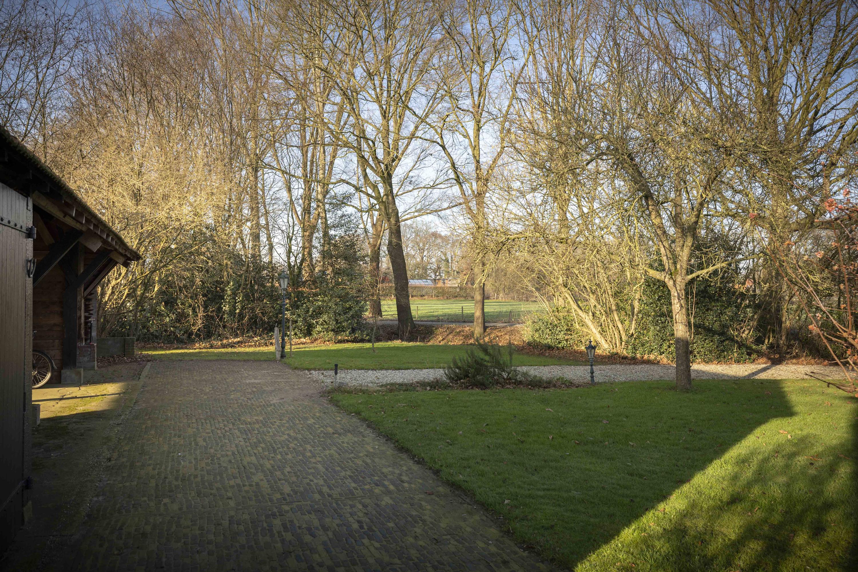 Het huis wordt omringd door een beeldige tuin. Er is een schuur met carport en aan de achterkant een afsluitbare tuingereedschapsberging (met op het dak 39 zonnepanelen - mooi uit het zicht), dus de auto’s staan droog, evenals de tuinspullen. Daarnaast is er een tweede houten bijgebouw (met op het dak 6 zonnepanelen) aanwezig, uitgevoerd in een landelijke stijl met potdekselwerk, Oud-Hollandse dakpannen en robuuste gebinten. Het bijgebouw biedt ruimte aan het parkeren van twee auto’s. Door de oriëntatie van het huis ligt er achter de woning een fijn zonneterras. Zowel aan de voor- als achterzijde zijn er grote gazons en de privacy wordt gewaarborgd door de manshoge beukenhagen. Naast de beukenhagen beschikt de tuin eveneens over volwassen geboomte, waaronder vier appelbomen, een perenboom, een monumentale tamme kastanje alsmede een monumentale walnotenboom.
