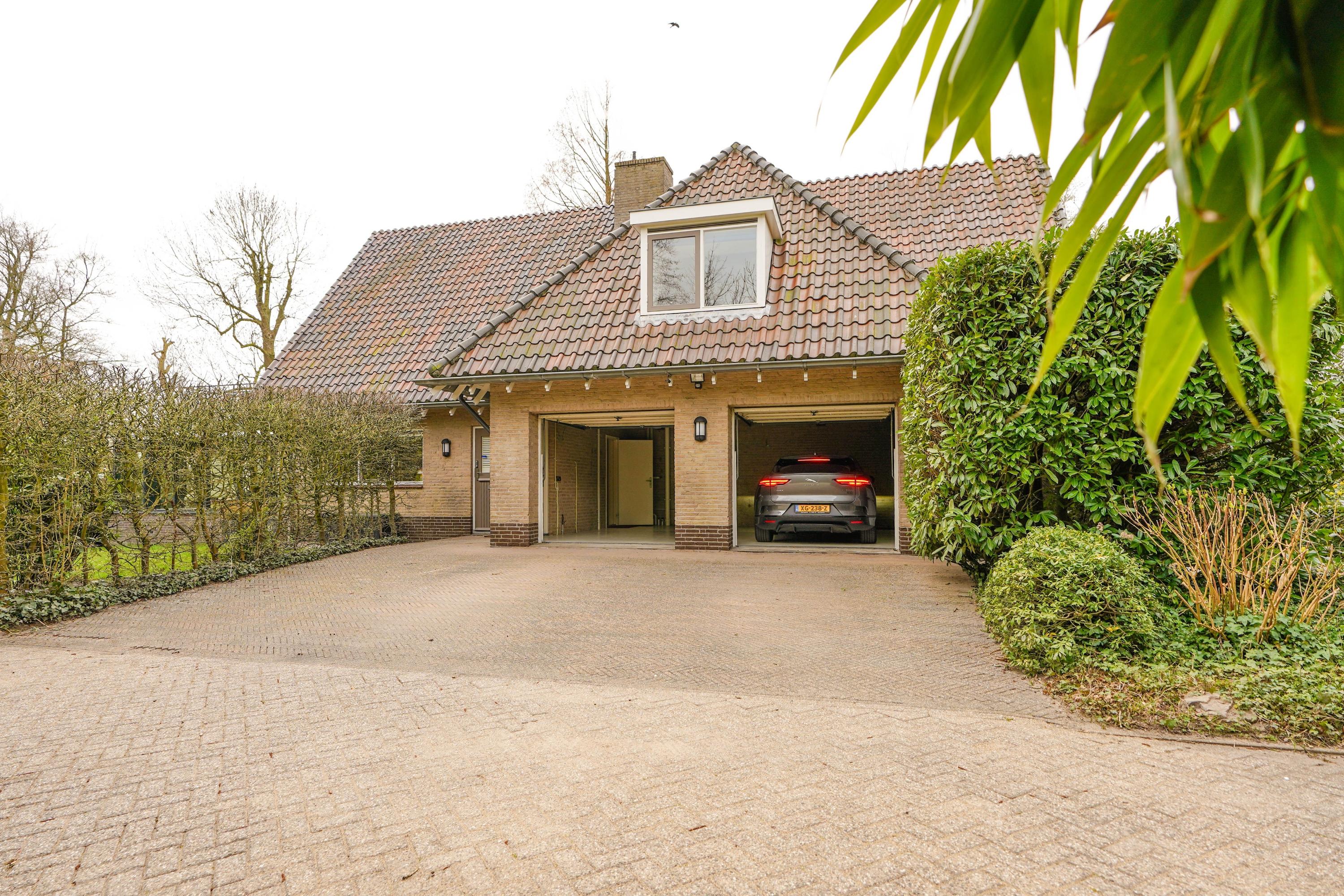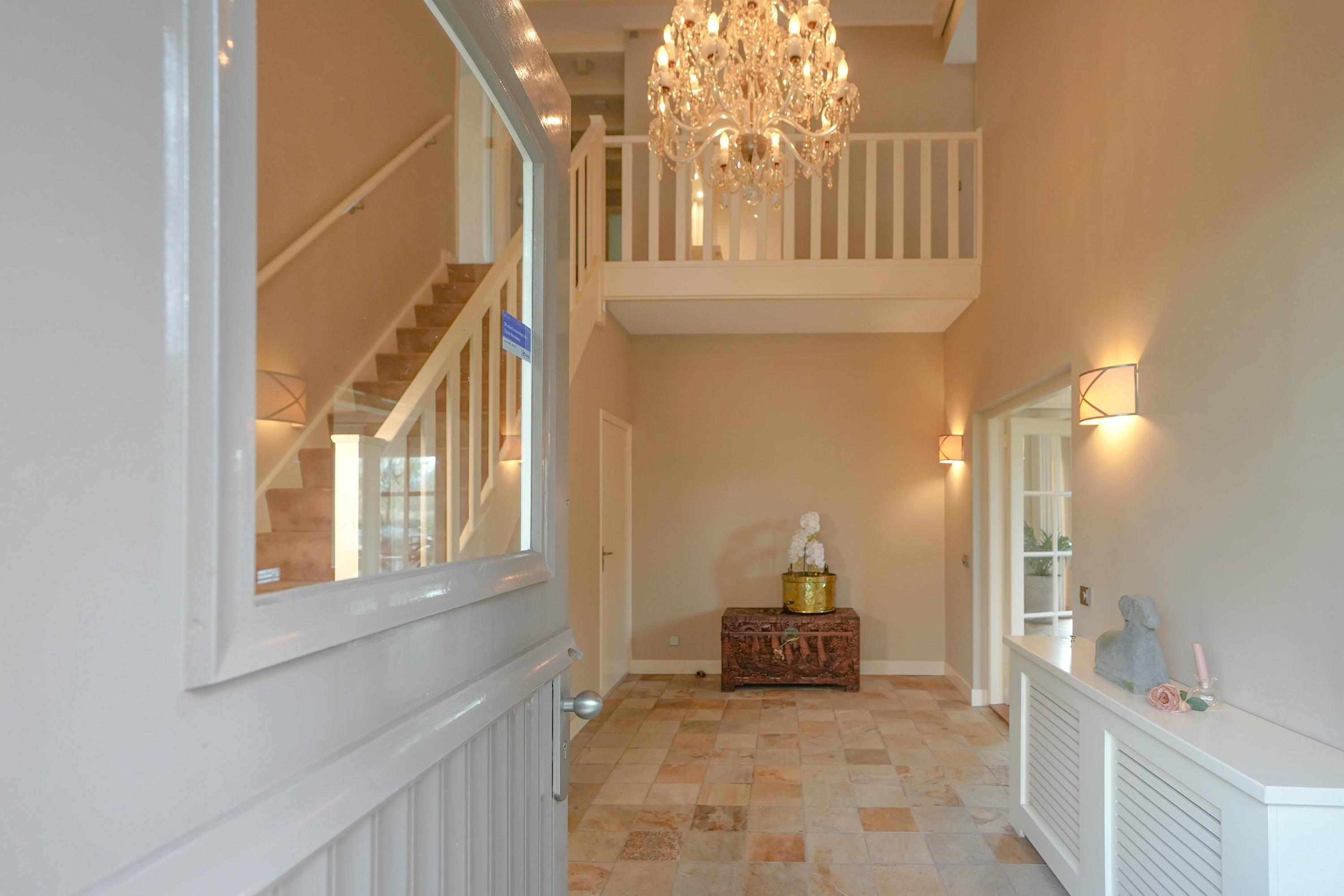 Via de privéweg door het park bereikt u de villa, met meerdere parkeerplekken en een dubbele, inpandige garage met elektrische overheaddeuren. De voordeur geeft toegang tot de ruime en lichte entree met meterkast, garderobe en een gastentoilet. De hal biedt verder toegang tot de kelder met vaste trap en stahoogte.