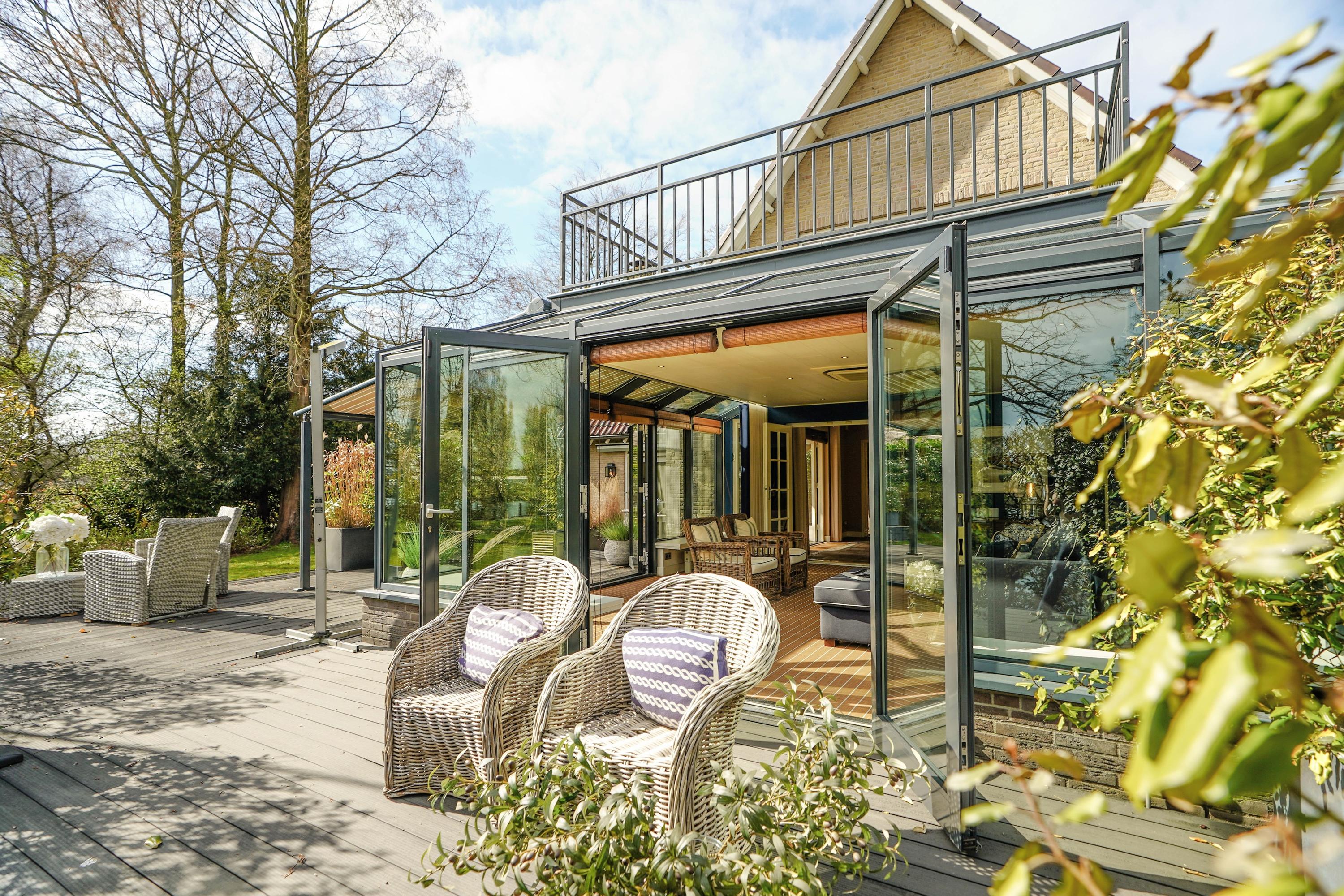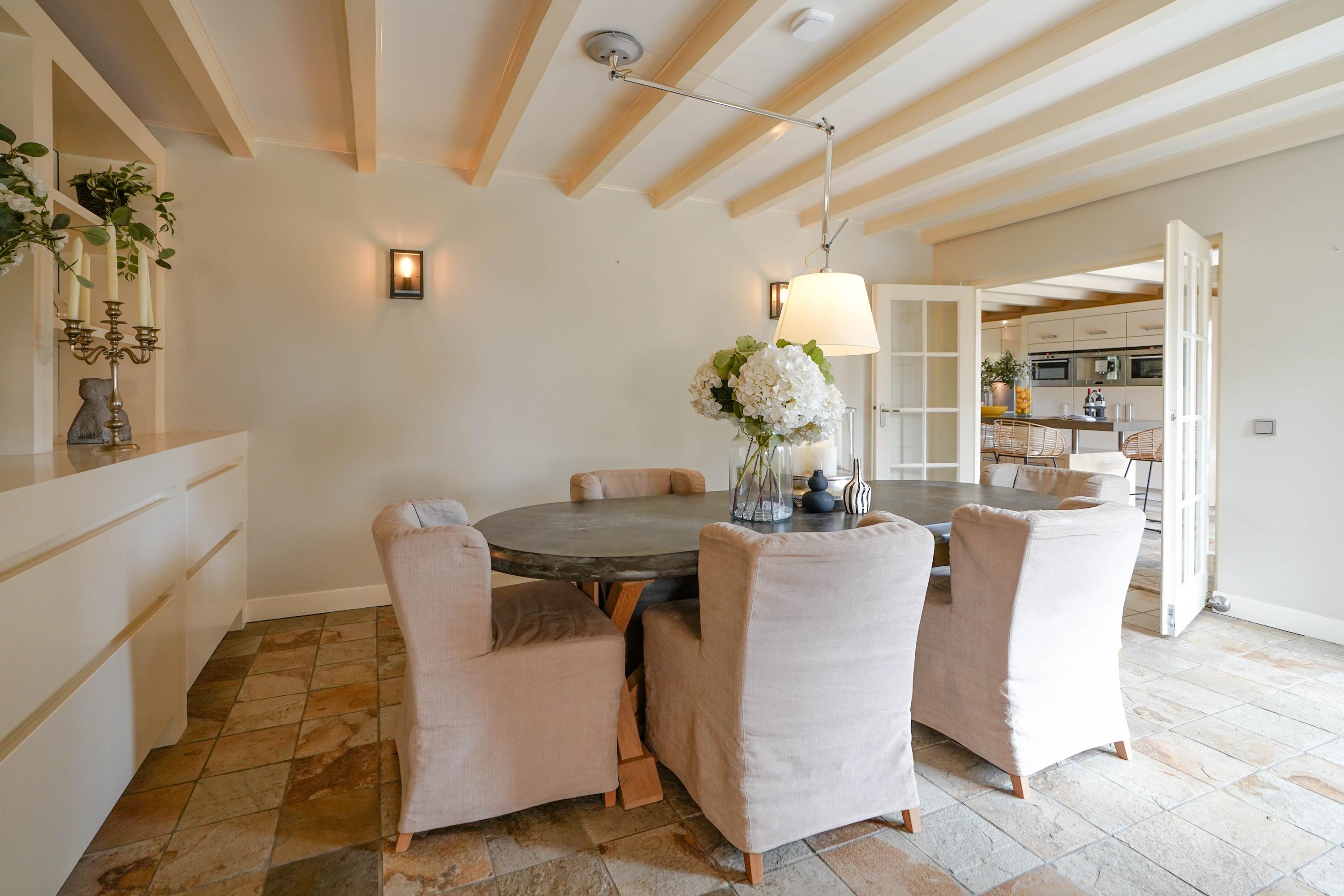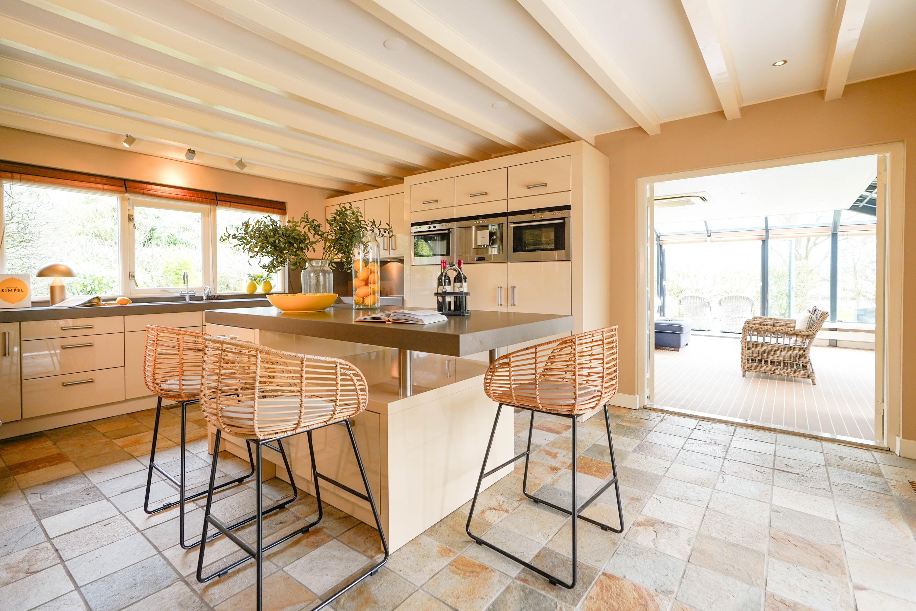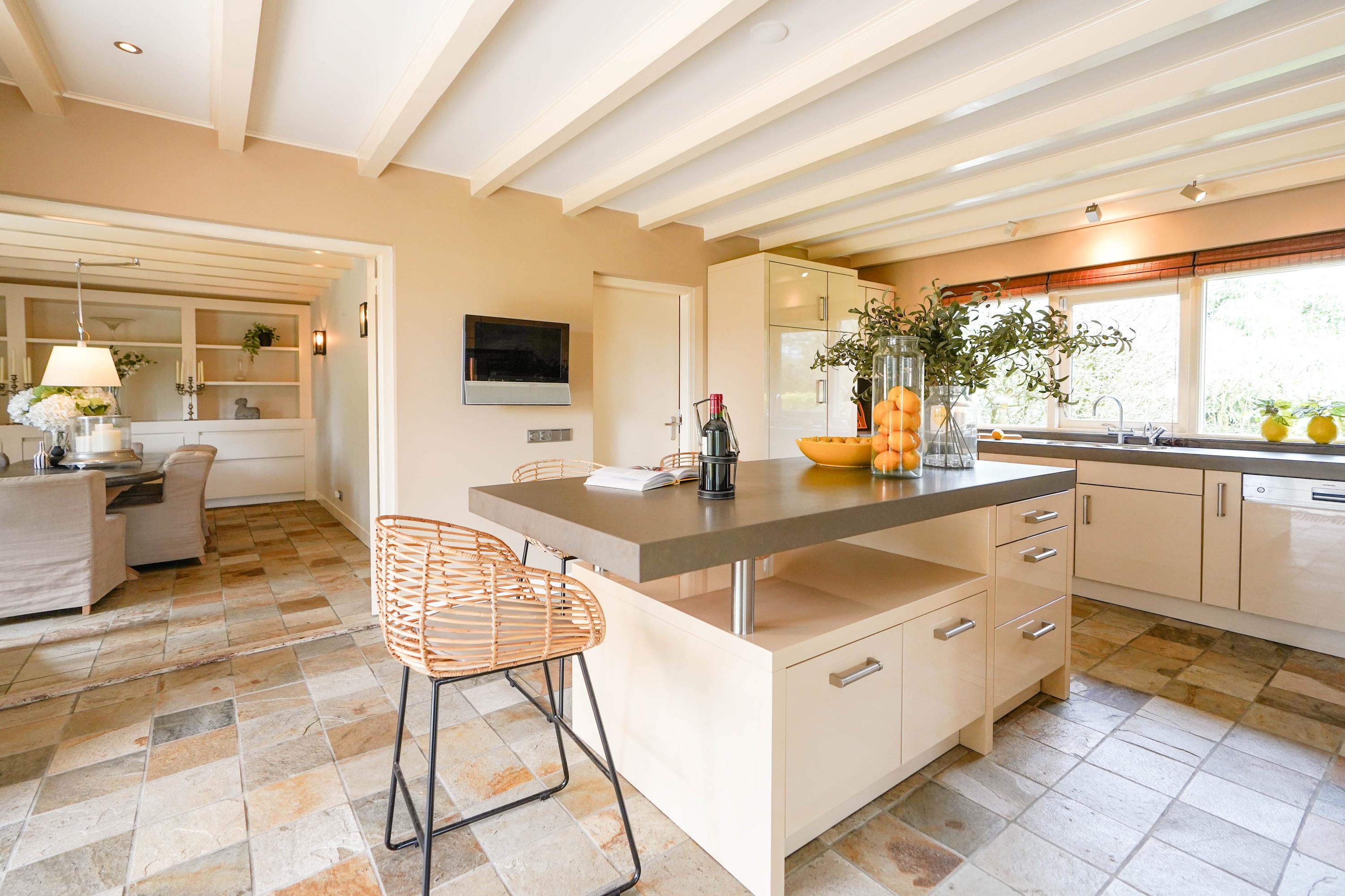 Vanuit de hal betreedt u door de dubbele deuren de zeer ruime, sfeervolle en lichte living met een prachtige zandstenen schouw en een schuifpui naar een van de terrassen. De eetkamer vormt de verbinding tussen de woonkamer en de keuken. De luxe keuken is ruim, licht en voorzien van een eiland en uiteraard alle gebruikelijke apparatuur. Naast de keuken vindt u de bijkeuken met kastenwand en Amerikaanse koelkast. Verder vindt u hier de was- en droogmachineaansluitingen. De hele begane grond is voorzien van vloerverwarming. Vanuit de keuken loopt u via openslaande deuren ook zo weer het terras op, met een fijne, overdekte plek, perfect voor een kopje koffie in de ochtendzon. Achter de keuken bevindt zich de heerlijke, zonovergoten serre (voorzien van airco) met opnieuw het schitterende uitzicht op de tuin, het water en het natuurgebied. Natuurlijk loopt u ook vanuit de serre, via openslaande deuren, zo de tuin in.
