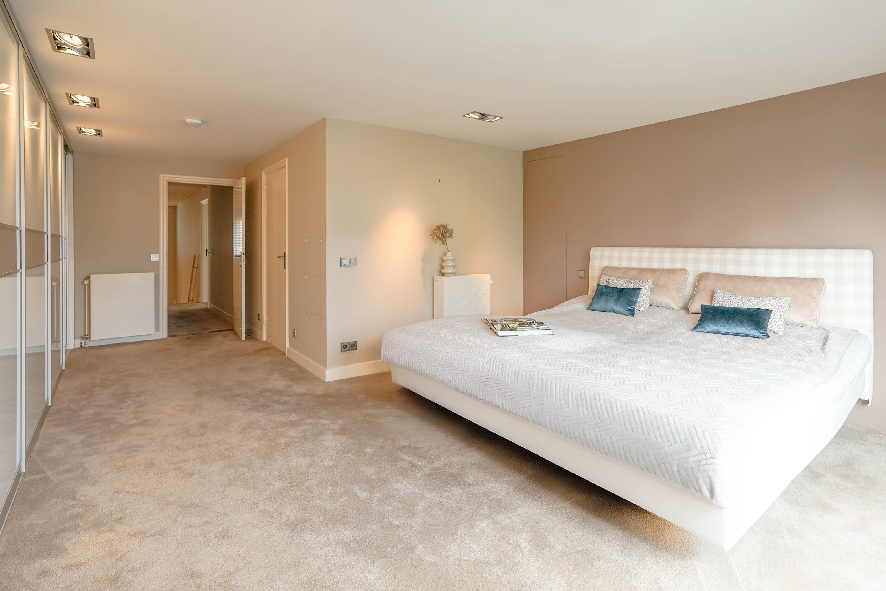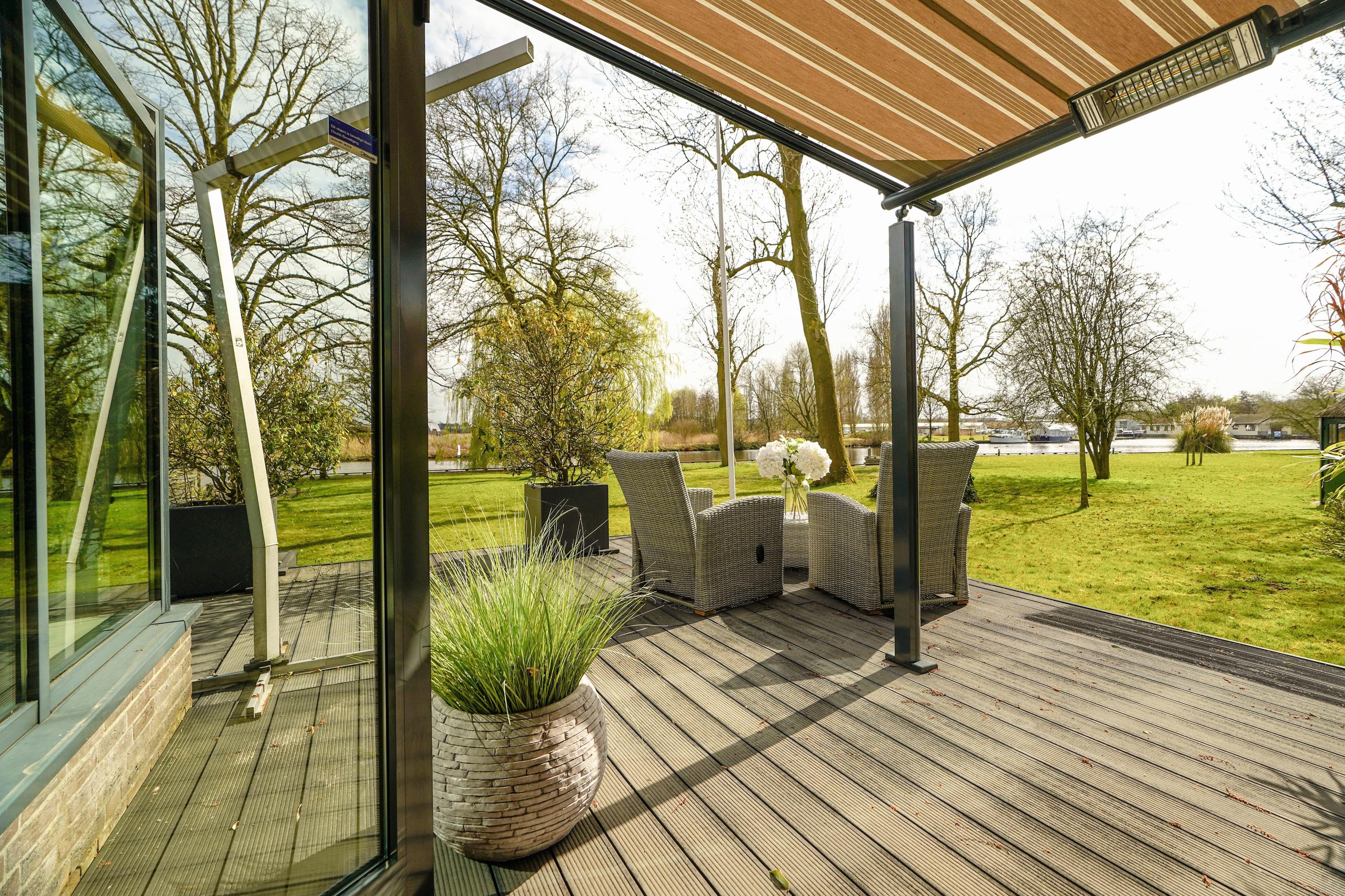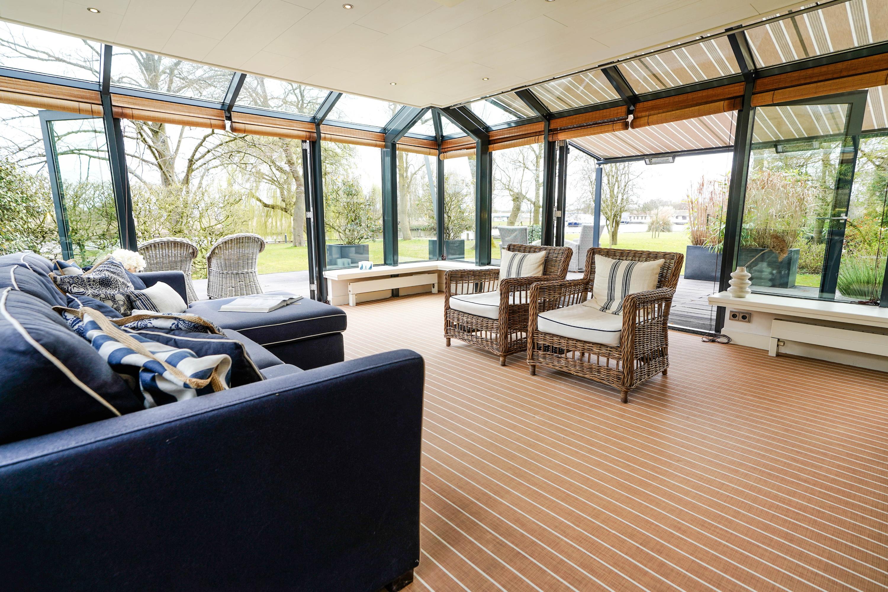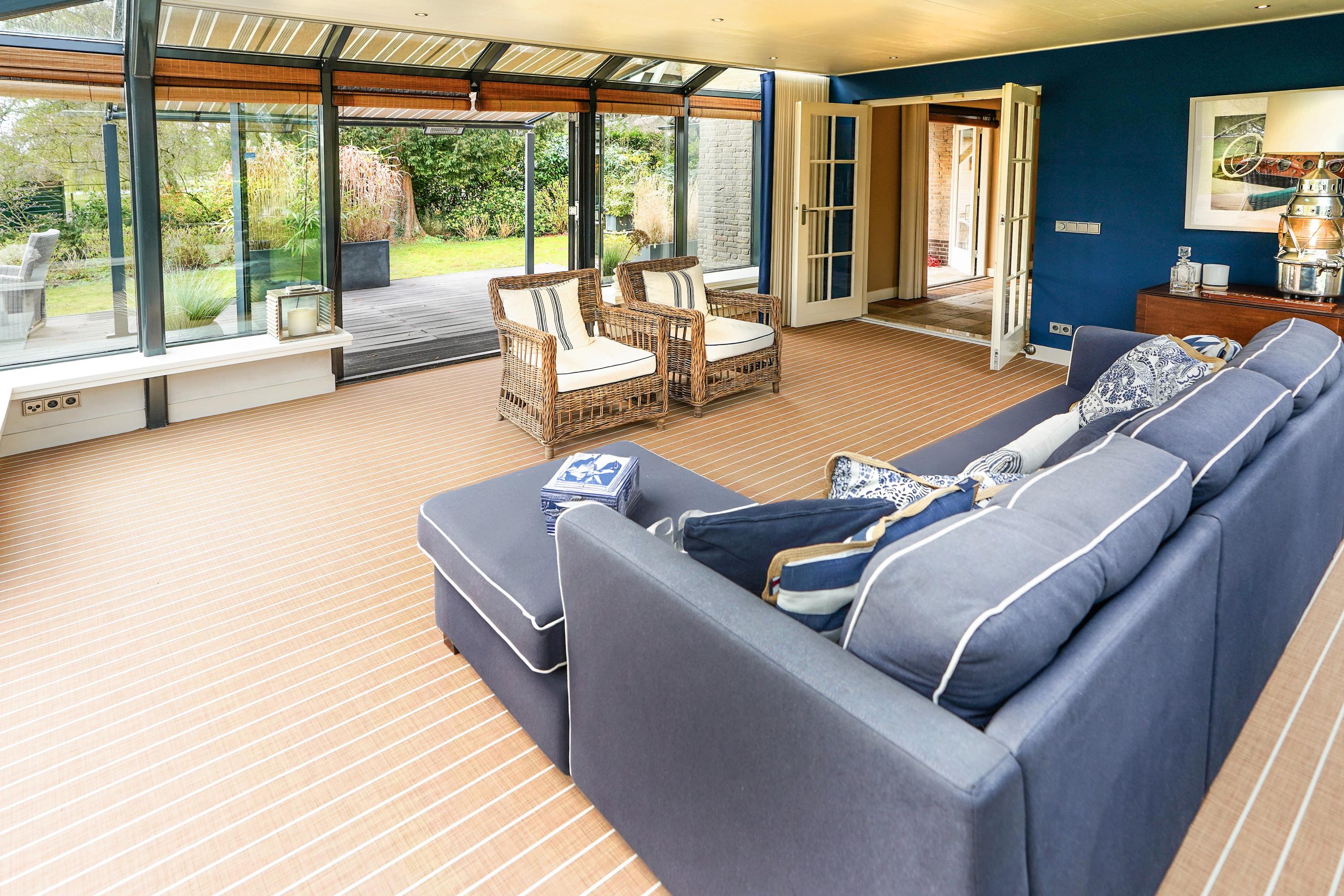 Vanuit de hal betreedt u door de dubbele deuren de zeer ruime, sfeervolle en lichte living met een prachtige zandstenen schouw en een schuifpui naar een van de terrassen. De eetkamer vormt de verbinding tussen de woonkamer en de keuken. De luxe keuken is ruim, licht en voorzien van een eiland en uiteraard alle gebruikelijke apparatuur. Naast de keuken vindt u de bijkeuken met kastenwand en Amerikaanse koelkast. Verder vindt u hier de was- en droogmachineaansluitingen. De hele begane grond is voorzien van vloerverwarming. Vanuit de keuken loopt u via openslaande deuren ook zo weer het terras op, met een fijne, overdekte plek, perfect voor een kopje koffie in de ochtendzon. Achter de keuken bevindt zich de heerlijke, zonovergoten serre (voorzien van airco) met opnieuw het schitterende uitzicht op de tuin, het water en het natuurgebied. Natuurlijk loopt u ook vanuit de serre, via openslaande deuren, zo de tuin in.